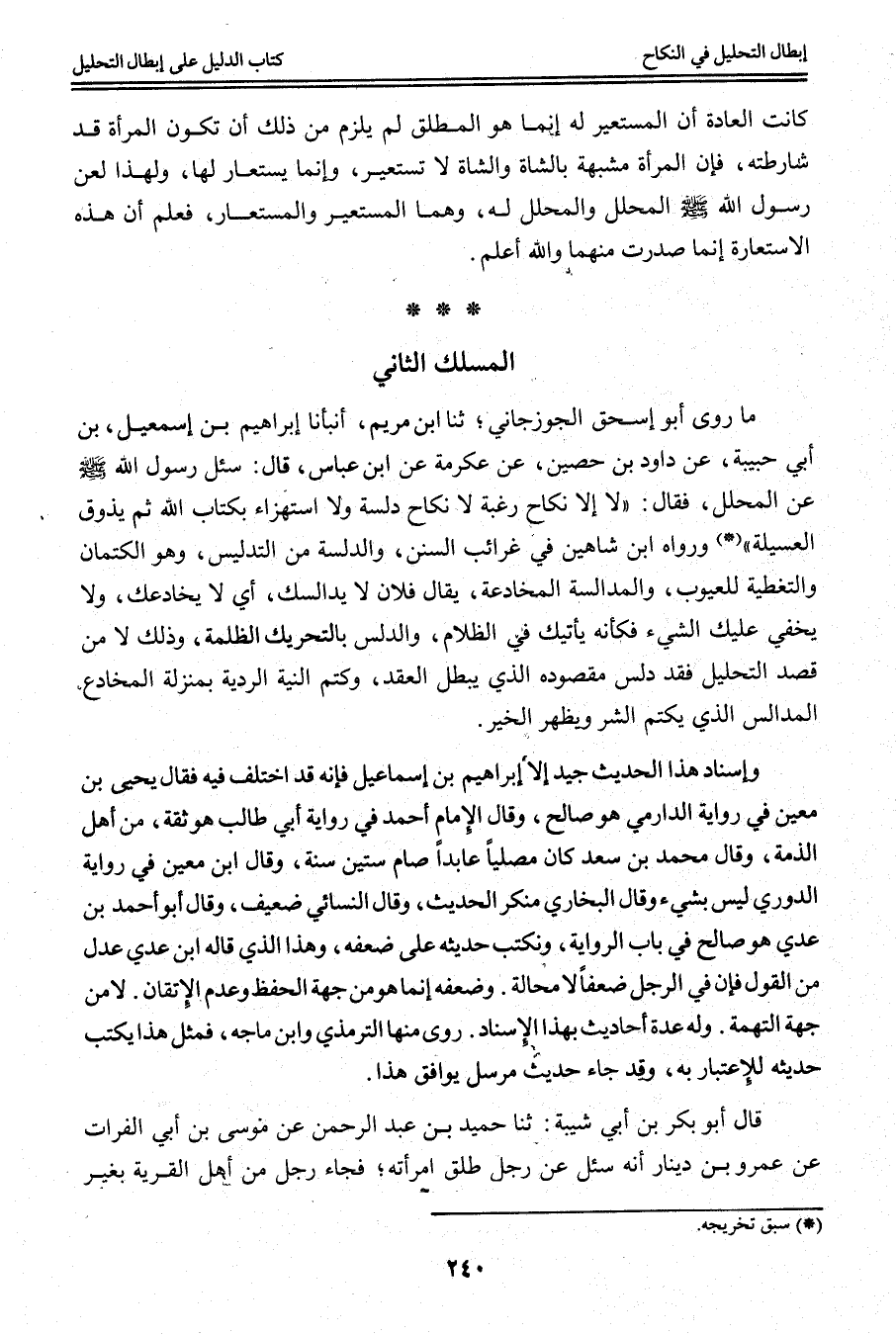 الْمَسْلَكُ الثَّانِي: مَا رَوَى أَبُو إِسْحَاقَ الْجُوزَجَانِيُّ ثِنَا ابْنُ مَرْيَمَ، أَنْبَأَنَا إبْرَاهِيمُ بْنُ إسْمَاعِيلَ بْنُ أَبِي حَبِيبَةَ، عَنْ دَاوُد بْنِ حُصَيْنٍ، عَنْ عِكْرِمَةَ عَنْ ابْنِ عَبَّاسٍ، قَالَ: «سُئِلَ رَسُولُ اللَّهِ - صَلَّى اللَّهُ عَلَيْهِ وَسَلَّمَ - عَنْ الْمُحَلِّلِ، فَقَالَ: لَا إلَّا نِكَاحَ رَغْبَةٍ لَا نِكَاحَ دُلْسَةٍ وَلَا اسْتِهْزَاءٍ بِكِتَابِ اللَّهِ ثُمَّ يَذُوقُ الْعُسَيْلَةَ» وَرَوَاهُ ابْنُ شَاهِينِ فِي غَرَائِبِ السُّنَنِ، وَالدُّلْسَةُ مِنْ التَّدْلِيسِ، وَهُوَ الْكِتْمَانُ وَالتَّغْطِيَةُ لِلْعُيُوبِ، وَالْمُدَالَسَةُ الْمُخَادَعَةُ، يُقَالُ فُلَانٌ لَا يُدَالِسُكَ، أَيْ لَا يُخَادِعُك، وَلَا يُخْفِي عَلَيْك الشَّيْءَ فَكَأَنَّهُ يَأْتِيَك فِي الظَّلَامِ، وَالدَّلَسُ بِالتَّحْرِيكِ الظُّلْمَةُ، وَذَلِكَ لَا مَنْ قَصَدَ التَّحْلِيلَ فَقَدْ دَلَّسَ مَقْصُودَهُ الَّذِي يُبْطِلُ الْعَقْدَ، وَكَتَمُ النِّيَّةَ الرَّدِيَّةَ بِمَنْزِلَةِ الْمُخَادِعِ الْمُدَالِسِ الَّذِي يَكْتُمُ الشَّرَّ وَيُظْهِرُ الْخَيْرَ.