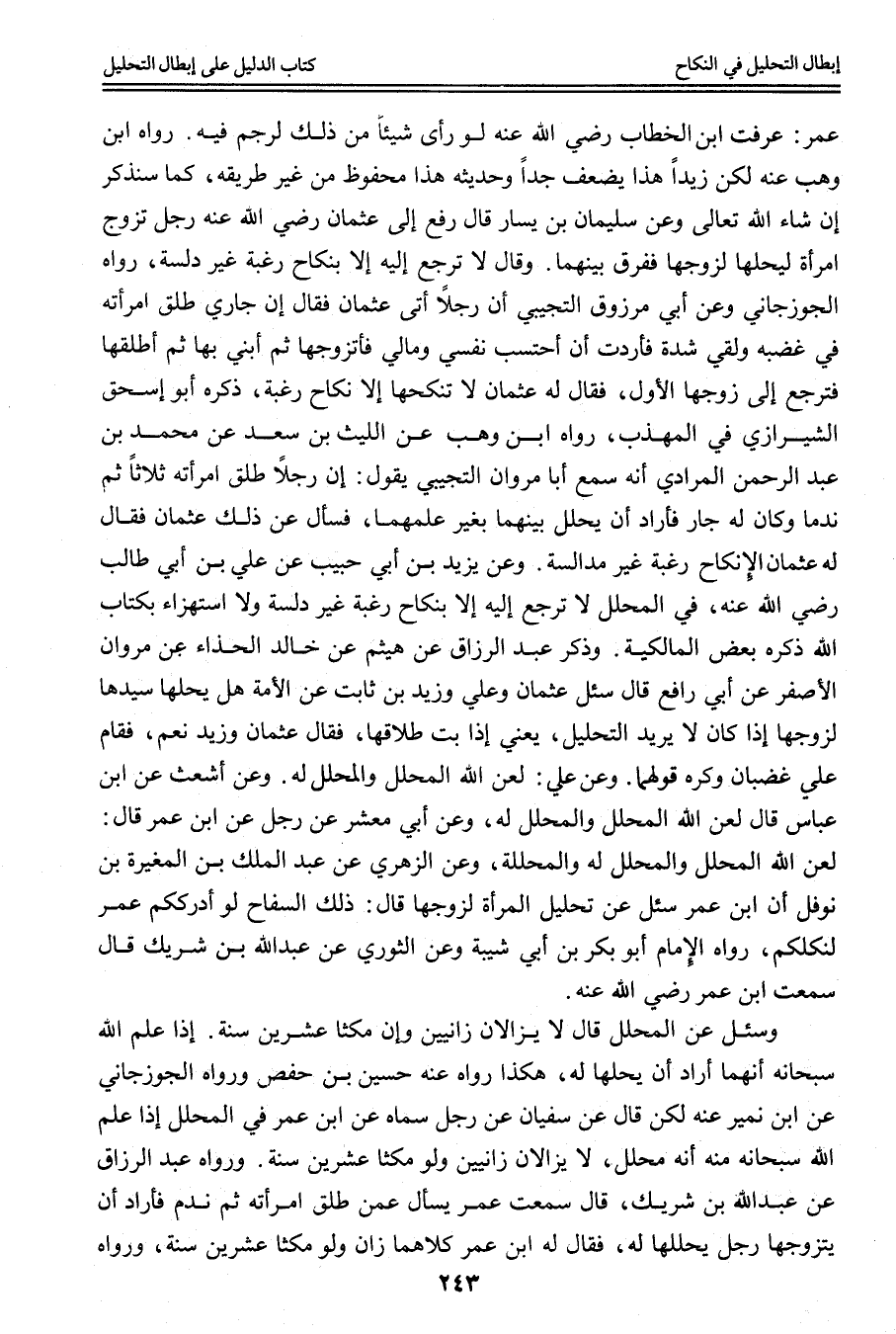 ابْنُ عُمَرَ: عَرَفْت ابْنَ الْخَطَّابِ - رَضِيَ اللَّهُ عَنْهُ - لَوْ رَأَى شَيْئًا مِنْ ذَلِكَ لَرَجَمَ فِيهِ. رَوَاهُ ابْنُ وَهْبٍ عَنْهُ لَكِنَّ زَيْدًا هَذَا يُضَعَّفُ جِدًّا وَحَدِيثُهُ هَذَا مَحْفُوظٌ مِنْ غَيْرِ طَرِيقِهِ، كَمَا سَنَذْكُرُ إنْ شَاءَ اللَّهُ تَعَالَى وَعَنْ سُلَيْمَانَ بْنِ يَسَارٍ قَالَ رُفِعَ إلَى عُثْمَانَ - رَضِيَ اللَّهُ عَنْهُ - رَجُلٌ تَزَوَّجَ امْرَأَةً لِيُحِلَّهَا لِزَوْجِهَا فَفَرَّقَ بَيْنَهُمَا.