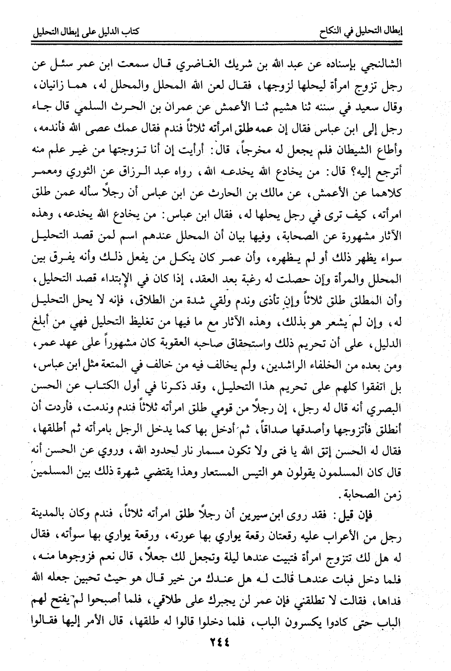 وَقَالَ سَعِيدٌ فِي سُنَنِهِ ثِنَا هُشَيْمٌ ثِنَا الْأَعْمَشُ عَنْ عِمْرَانِ بْنِ الْحَارِثِ السُّلَمِيِّ قَالَ جَاءَ رَجُلٌ إلَى ابْنِ عَبَّاسٍ فَقَالَ إنَّ عَمَّهُ طَلَّقَ امْرَأَتَهُ ثَلَاثًا فَنَدِمَ فَقَالَ عَمُّك عَصَى اللَّهَ فَأَنْدَمَهُ وَأَطَاعَ الشَّيْطَانَ فَلَمْ يَجْعَلْ لَهُ مَخْرَجًا قَالَ أَرَأَيْت إنْ أَنَا تَزَوَّجْتهَا مِنْ غَيْرِ عِلْمٍ مِنْهُ أَتَرْجِعُ إلَيْهِ قَالَ مَنْ يُخَادِعْ اللَّهَ يَخْدَعْهُ اللَّهُ، رَوَاهُ عَبْد الرَّزَّاقِ عَنْ الثَّوْرِيِّ وَمَعْمَرٍ كِلَاهُمَا عَنْ الْأَعْمَشِ عَنْ مَالِكِ بْنِ الْحَارِثِ عَنْ ابْنِ عَبَّاسٍ أَنَّ رَجُلًا سَأَلَهُ عَمَّنْ طَلَّقَ امْرَأَتَهُ، كَيْفَ تَرَى فِي رَجُلٍ يُحِلُّهَا لَهُ، فَقَالَ ابْنُ عَبَّاسٍ: مَنْ يُخَادِعْ اللَّهَ يَخْدَعْهُ، وَهَذِهِ الْآثَارُ مَشْهُورَةٌ عَنْ الصَّحَابَةِ، وَفِيهَا بَيَانُ أَنَّ الْمُحَلِّلَ عِنْدَهُمْ اسْمٌ لِمَنْ قَصَدَ التَّحْلِيلَ سَوَاءٌ يُظْهِرُ ذَلِكَ أَوْ لَمْ يُظْهِرْهُ، وَأَنَّ عُمَرَ كَانَ يُنَكِّلُ مَنْ يَفْعَلُ ذَلِكَ وَأَنَّهُ يُفَرِّقُ بَيْنَ الْمُحَلِّلِ وَالْمَرْأَةِ وَإِنْ حَصَلَتْ لَهُ رَغْبَةٌ بَعْدَ الْعَقْدِ، إذَا كَانَ فِي الِابْتِدَاءِ قَصَدَ التَّحْلِيلَ، وَأَنَّ الْمُطَلِّقَ طَلَّقَ ثَلَاثًا وَإِنْ تَأَذَّى وَنَدِمَ وَلَقِيَ شِدَّةً مِنْ الطَّلَاقِ، فَإِنَّهُ لَا يَحِلُّ التَّحْلِيلُ لَهُ، وَإِنْ لَمْ يَشْعُرْ هُوَ بِذَلِكَ، وَهَذِهِ الْآثَارُ مَعَ مَا فِيهَا مِنْ تَغْلِيظِ التَّحْلِيلِ فَهِيَ مِنْ أَبْلَغِ الدَّلِيلِ، عَلَى أَنَّ تَحْرِيمَ ذَلِكَ وَاسْتِحْقَاقَ صَاحِبِهِ الْعُقُوبَةَ كَانَ مَشْهُورًا عَلَى عَهْدِ عُمَرَ، وَمَنْ بَعْدَهُ مِنْ الْخُلَفَاءِ الرَّاشِدِينَ، وَلَمْ يُخَالِفْ فِيهِ مَنْ خَالَفَ فِي الْمُتْعَةِ مِثْلُ ابْنِ عَبَّاسٍ، بَلْ اتَّفَقُوا كُلُّهُمْ عَلَى تَحْرِيمِ هَذَا التَّحْلِيلِ، وَقَدْ ذَكَرْنَا فِي أَوَّلِ الْكِتَابِ عَنْ الْحَسَنِ الْبَصْرِيِّ أَنَّهُ قَالَ لَهُ رَجُلٌ، إنَّ رَجُلًا مِنْ قَوْمِي طَلَّقَ امْرَأَتَهُ ثَلَاثًا فَنَدِمَ وَنَدِمَتْ، فَأَرَدْت أَنْ أَنْطَلِقَ فَأَتَزَوَّجَهَا وَأُصْدِقَهَا صَدَاقًا، ثُمَّ أَدْخُلَ بِهَا كَمَا يَدْخُلُ الرَّجُلُ بِامْرَأَتِهِ ثُمَّ أُطَلِّقَهَا، فَقَالَ لَهُ الْحَسَنُ اتَّقِ اللَّهَ يَا فَتَى وَلَا تَكُونُ مِسْمَارَ نَارٍ لِحُدُودِ اللَّهِ، وَرُوِيَ عَنْ الْحَسَنِ أَنَّهُ قَالَ كَانَ الْمُسْلِمُونَ يَقُولُونَ هُوَ التَّيْسُ الْمُسْتَعَارُ وَهَذَا يَقْتَضِي شُهْرَةَ ذَلِكَ بَيْنَ الْمُسْلِمِينَ زَمَنَ الصَّحَابَةِ.