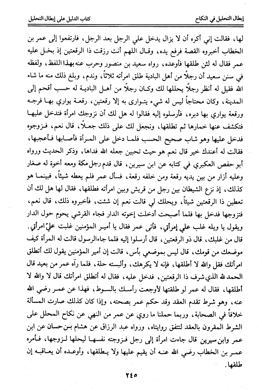لَهَا، فَقَالَتْ إنِّي أَكْرَهُ أَنْ لَا يَزَالَ يَدْخُلُ عَلَيَّ الرَّجُلُ بَعْدَ الرَّجُلِ، فَارْتَفَعُوا إلَى عُمَرَ بْنِ الْخَطَّابِ أَخْبَرُوهُ الْقِصَّةَ فَرَفَعَ يَدَهُ، وَقَالَ اللَّهُمَّ أَنْتَ رَزَقْت ذَا الرُّقْعَتَيْنِ إذْ بَخِلَ عَلَيْهِ عُمَرُ فَقَالَ لَهُ لَئِنْ طَلَّقَهَا فَأَوْعَدَهُ، رَوَاهُ سَعِيدُ بْنُ مَنْصُورٍ وَحَرْبٌ عَنْهُ بِهَذَا اللَّفْظِ، وَلَفْظُهُ فِي سُنَنِ سَعِيدٍ أَنَّ رَجُلًا مِنْ أَهْلِ الْبَادِيَةِ طَلَّقَ امْرَأَتَهُ ثَلَاثًا، وَنَدِمَ، وَبَلَغَ ذَلِكَ مِنْهُ مَا شَاءَ اللَّهُ فَقِيلَ لَهُ اُنْظُرْ رَجُلًا يُحَلِّلُهَا لَك وَكَانَ رَجُلًا مِنْ أَهْلِ الْبَادِيَةِ لَهُ حَسَبٌ أُقْحِمَ إلَى الْمَدِينَةِ، وَكَانَ مُحْتَاجًا لَيْسَ لَهُ شَيْءٌ يَتَوَارَى بِهِ إلَّا رُقْعَتَيْنِ، رُقْعَةً يُوَارِي بِهَا فَرْجَهُ وَرُقْعَةً يُوَارِي بِهَا دُبُرَهُ، فَأَرْسَلُوهُ إلَيْهِ فَقَالُوا لَهُ هَلْ لَك أَنْ نُزَوِّجَك امْرَأَةً فَتَدْخُلَ عَلَيْهَا فَتَكْشِفَ عَنْهَا خِمَارَهَا ثُمَّ تُطَلِّقَهَا، وَنَجْعَلُ لَك عَلَى ذَلِكَ جُعْلًا، قَالَ نَعَمْ، فَزَوَّجُوهُ فَدَخَلَ عَلَيْهَا وَهُوَ شَابٌّ صَحِيحُ الْحَسَبِ فَلَمَّا دَخَلَ عَلَى الْمَرْأَةِ فَأَصَابَهَا فَأَعْجَبَهَا، فَقَالَتْ لَهُ أَعِنْدَك خَيْرٌ قَالَ نَعَمْ هُوَ حَيْثُ تُحِبِّينَ جَعَلَهُ اللَّهُ فِدَاهَا، وَذَكَرَ الْحَدِيثَ وَرَوَاهُ أَبُو حَفْصٍ الْعُكْبَرِيُّ فِي كِتَابِهِ عَنْ ابْنِ سِيرِينَ، قَالَ قَدِمَ رَجُلٌ مَكَّةَ وَمَعَهُ إخْوَةٌ لَهُ صِغَارٌ وَعَلَيْهِ إزَارٌ مِنْ بَيْنِ يَدَيْهِ رُقْعَةٌ وَمِنْ خَلْفِهِ رُقْعَةٌ، فَسَأَلَ عُمَرَ فَلَمْ يُعْطِهِ شَيْئًا، فَبَيْنَمَا هُوَ كَذَلِكَ، إذْ نَزَعَ الشَّيْطَانُ بَيْنَ رَجُلٍ مِنْ قُرَيْشٍ وَبَيْنَ امْرَأَتِهِ فَطَلَّقَهَا، فَقَالَ لَهَا هَلْ لَك أَنْ تُعْطِينَ ذَا الرُّقْعَتَيْنِ شَيْئًا، وَيُحِلَّك لِي قَالَتْ نَعَمْ إنْ شِئْت، فَأَخْبَرُوهُ ذَلِكَ، قَالَ نَعَمْ، فَتَزَوَّجَهَا فَدَخَلَ بِهَا فَلَمَّا أَصْبَحَتْ أَدْخَلَتْ إخْوَتَهُ الدَّارَ فَجَاءَ الْقُرَشِيُّ يَحُومُ حَوْلَ الدَّارِ وَيَقُولُ يَا وَيْلَهُ غَلَبَ عَلَيَّ امْرَأَتِي، فَأَتَى عُمَرَ فَقَالَ يَا أَمِيرَ الْمُؤْمِنِينَ غُلِبْتُ عَلَى امْرَأَتِي. قَالَ مَنْ غَلَبَك، قَالَ ذُو الرُّقْعَتَيْنِ، قَالَ أَرْسِلُوا إلَيْهِ فَلَمَّا جَاءَ الرَّسُولُ قَالَتْ لَهُ الْمَرْأَةُ كَيْفَ مَوْضِعُك مِنْ قَوْمِك، قَالَ لَيْسَ بِمَوْضِعِي بَأْسٌ، قَالَتْ إنَّ أَمِيرَ الْمُؤْمِنِينَ يَقُولُ لَك أَتُطَلِّقُ امْرَأَتَك فَقُلْ وَاَللَّهِ لَا أُطَلِّقُهَا، فَإِنَّهُ لَا يُكْرِهُك، وَأَلْبَسَتْهُ حُلَّةً، فَلَمَّا رَآهُ عُمَرُ مِنْ بَعِيدٍ قَالَ الْحَمْدُ لِلَّهِ الَّذِي شَرَّفَ ذَا الرُّقْعَتَيْنِ، فَدَخَلَ عَلَيْهِ، فَقَالَ لَهُ أَتُطَلِّقُ امْرَأَتَك قَالَ لَا وَاَللَّهِ لَا أُطَلِّقُهَا، فَقَالَ لَهُ عُمَرُ لَوْ طَلَّقْتهَا لَأَوْجَعْت رَأْسَك بِالسَّوْطِ.