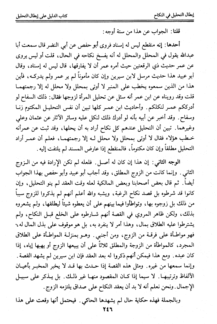 قُلْنَا: الْجَوَابُ عَنْ هَذَا مِنْ سِتَّةِ أَوْجُهٍ. أَحَدُهَا: أَنَّهُ مُنْقَطِعٌ لَيْسَ لَهُ إسْنَادٌ فَرَوَى أَبُو حَفْصٍ عَنْ أَبِي النَّضْرِ قَالَ سَمِعْت أَبَا عَبْدِ اللَّهِ يَقُولُ فِي الْمُحَلِّلِ وَالْمُحَلَّلَ لَهُ: إنَّهُ يُفْسَخُ نِكَاحُهُ فِي الْحَالِ، قُلْت أَوَ لَيْسَ يُرْوَى عَنْ عُمَرَ حَدِيثُ ذِي الرُّقْعَتَيْنِ حَيْثُ أَمَرَهُ عُمَرُ أَنْ لَا يُفَارِقَهَا، قَالَ لَيْسَ لَهُ إسْنَادٌ، وَقَالَ أَبُو عُبَيْدٍ هَذَا حَدِيثٌ مُرْسَلٌ لِابْنِ سِيرِينَ وَإِنْ كَانَ مَأْمُونًا لَمْ يَرَ عُمَرُ وَلَمْ يُدْرِكْهُ، فَأَيْنَ هَذَا مِنْ الَّذِينَ سَمِعُوهُ يَخْطُبُ عَلَى الْمِنْبَرِ لَا أُوتَى بِمُحَلِّلٍ وَلَا مُحَلَّلٍ لَهُ إلَّا رَجَمْتُهُمَا. قُلْت: وَقَدْ رَوَيْنَاهُ عَنْ ابْنِ عُمَرَ أَنَّهُ سُئِلَ عَنْ تَحْلِيلِ الْمَرْأَةِ لِزَوْجِهَا فَقَالَ: ذَلِكَ السِّفَاحُ لَوْ أَدْرَكَكُمْ عُمَرُ لَنَكَّلَكُمْ وَأَحَادِيثُ ابْنِ عُمَرَ كُلُّهَا تُبَيِّنُ أَنَّ نَفْسَ التَّحْلِيلِ الْمَكْتُومِ زِنًا وَسِفَاحٌ، وَقَدْ أَخْبَرَ عَنْ أَبِيهِ بِأَنَّهُ لَوْ أَدْرَكَ ذَلِكَ لَنَكَّلَ عَلَيْهِ.