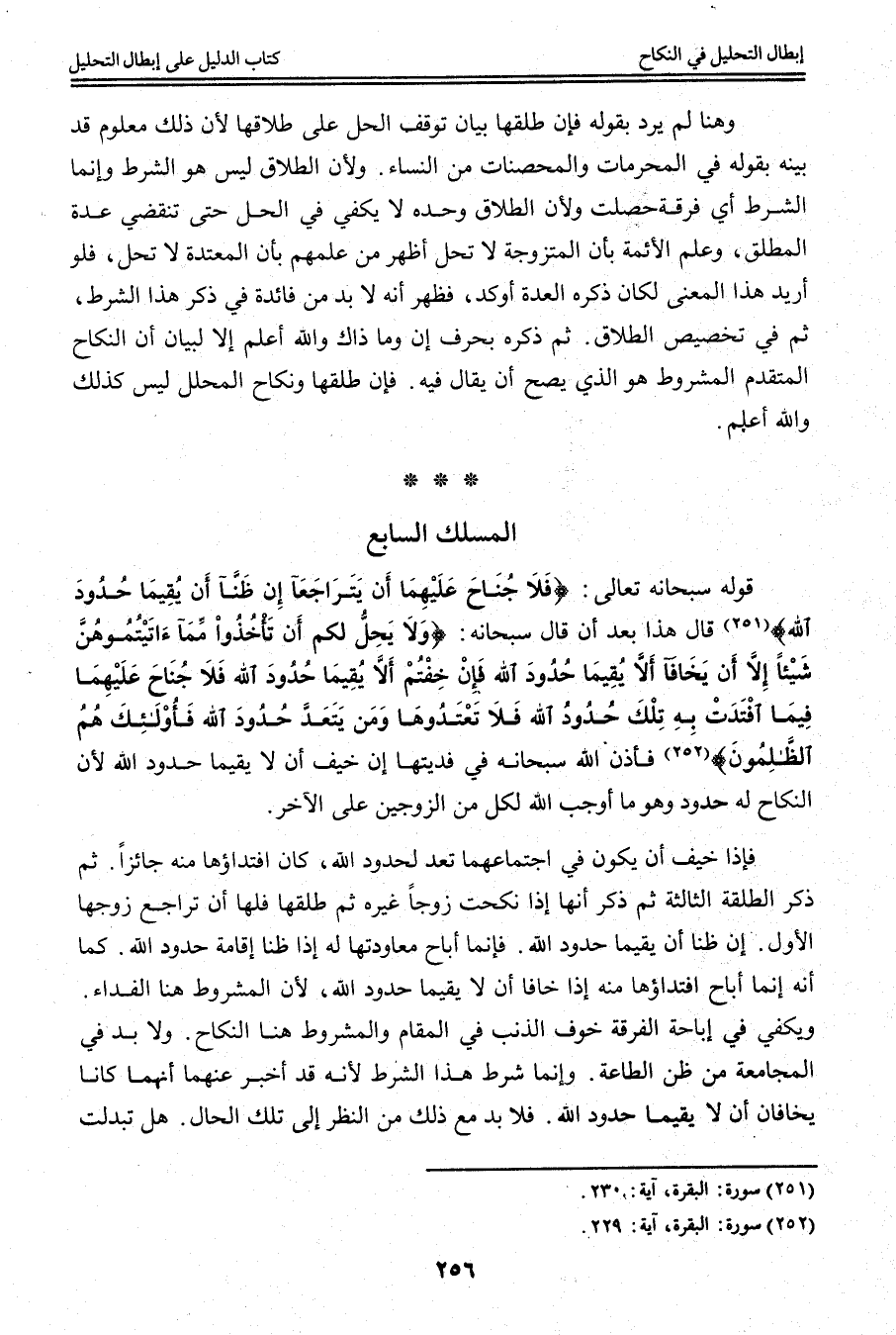 الْمَسْلَكُ السَّابِعُ قَوْلُهُ سُبْحَانَهُ وَتَعَالَى: {فَلا جُنَاحَ عَلَيْهِمَا أَنْ يَتَرَاجَعَا إِنْ ظَنَّا أَنْ يُقِيمَا حُدُودَ اللَّهِ} [البقرة: 230] قَالَ هَذَا بَعْدَ أَنْ قَالَ سُبْحَانَهُ: {وَلا يَحِلُّ لَكُمْ أَنْ تَأْخُذُوا مِمَّا آتَيْتُمُوهُنَّ شَيْئًا إِلا أَنْ يَخَافَا أَلا يُقِيمَا حُدُودَ اللَّهِ فَإِنْ خِفْتُمْ أَلا يُقِيمَا حُدُودَ اللَّهِ فَلا جُنَاحَ عَلَيْهِمَا فِيمَا افْتَدَتْ بِهِ تِلْكَ حُدُودُ اللَّهِ فَلا تَعْتَدُوهَا وَمَنْ يَتَعَدَّ حُدُودَ اللَّهِ فَأُولَئِكَ هُمُ الظَّالِمُونَ} [البقرة: 229] فَأَذِنَ اللَّهُ سُبْحَانَهُ فِي فِدْيَتِهَا إنْ خِيفَ أَنْ لَا يُقِيمَا حُدُودَ اللَّهِ لِأَنَّ النِّكَاحَ لَهُ حُدُودٌ وَهُوَ مَا أَوْجَبَ اللَّهُ لِكُلٍّ مِنْ الزَّوْجَيْنِ عَلَى الْآخَرِ.