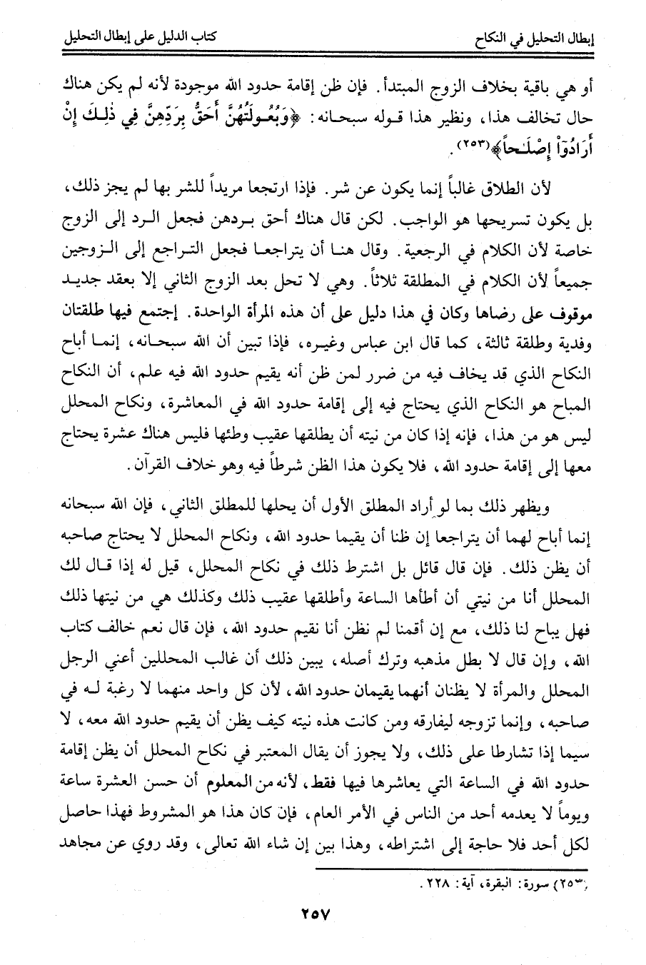 وَيَظْهَرُ ذَلِكَ بِمَا لَوْ أَرَادَ الْمُطَلِّقُ الْأَوَّلُ أَنْ يُحِلَّهَا لِلْمُطَلِّقِ الثَّانِي، فَإِنَّ اللَّهَ سُبْحَانَهُ إنَّمَا أَبَاحَ لَهُمَا أَنْ يَتَرَاجَعَا إنْ ظَنَّا أَنْ يُقِيمَا حُدُودَ اللَّهِ، وَنِكَاحُ الْمُحَلِّلِ لَا يَحْتَاجُ صَاحِبُهُ أَنْ يَظُنَّ ذَلِكَ. فَإِنْ قَالَ قَائِلٌ بَلْ اُشْتُرِطَ ذَلِكَ فِي نِكَاحِ الْمُحَلِّلِ، قِيلَ لَهُ إذَا قَالَ لَك الْمُحَلِّلُ أَنَا مِنْ نِيَّتِي أَنْ أَطَأَهَا السَّاعَةَ وَأُطَلِّقَهَا عَقِيبَ ذَلِكَ وَكَذَلِكَ هِيَ مِنْ نِيَّتِهَا ذَلِكَ فَهَلْ يُبَاحُ لَنَا ذَلِكَ، مَعَ إنْ أَقَمْنَا لَمْ نَظُنَّ أَنَّا نُقِيمُ حُدُودَ اللَّهِ، فَإِنْ قَالَ نَعَمْ خَالَفَ كِتَابَ اللَّهِ، وَإِنْ قَالَ لَا بَطَلَ مَذْهَبُهُ وَتَرَكَ أَصْلَهُ، يُبَيِّنُ ذَلِكَ أَنَّ غَالِبَ الْمُحَلِّلِينَ أَعْنِي الرَّجُلَ الْمُحَلِّلَ وَالْمَرْأَةَ لَا يَظُنَّانِ أَنَّهُمَا يُقِيمَانِ حُدُودَ اللَّهِ؛ لِأَنَّ كُلَّ وَاحِدٍ مِنْهُمَا لَا رَغْبَةَ لَهُ فِي صَاحِبِهِ، وَإِنَّمَا تَزَوَّجَهُ لِيُفَارِقَهُ وَمَنْ كَانَتْ هَذِهِ نِيَّتُهُ كَيْفَ يَظُنُّ أَنْ يُقِيمَ حُدُودَ اللَّهِ مَعَهُ، لَا سِيَّمَا إذَا تَشَارَطَا عَلَى ذَلِكَ، وَلَا يَجُوزُ أَنْ يُقَالَ الْمُعْتَبَرُ فِي نِكَاحِ الْمُحَلِّلِ أَنْ يَظُنَّ إقَامَةَ حُدُودِ اللَّهِ فِي السَّاعَةِ الَّتِي يُعَاشِرُهَا فِيهَا فَقَطْ؛ لِأَنَّهُ مِنْ الْمَعْلُومِ أَنَّ حُسْنَ الْعِشْرَةِ سَاعَةً وَيَوْمًا لَا يَعْدَمُهُ أَحَدٌ مِنْ النَّاسِ فِي الْأَمْرِ الْعَامِّ، فَإِنْ كَانَ هَذَا هُوَ الْمَشْرُوطُ فَهَذَا حَاصِلٌ لِكُلِّ أَحَدٍ فَلَا حَاجَةَ إلَى اشْتِرَاطِهِ، وَهَذَا بَيِّنٌ إنْ شَاءَ اللَّهُ تَعَالَى، وَقَدْ رُوِيَ عَنْ مُجَاهِدٍ