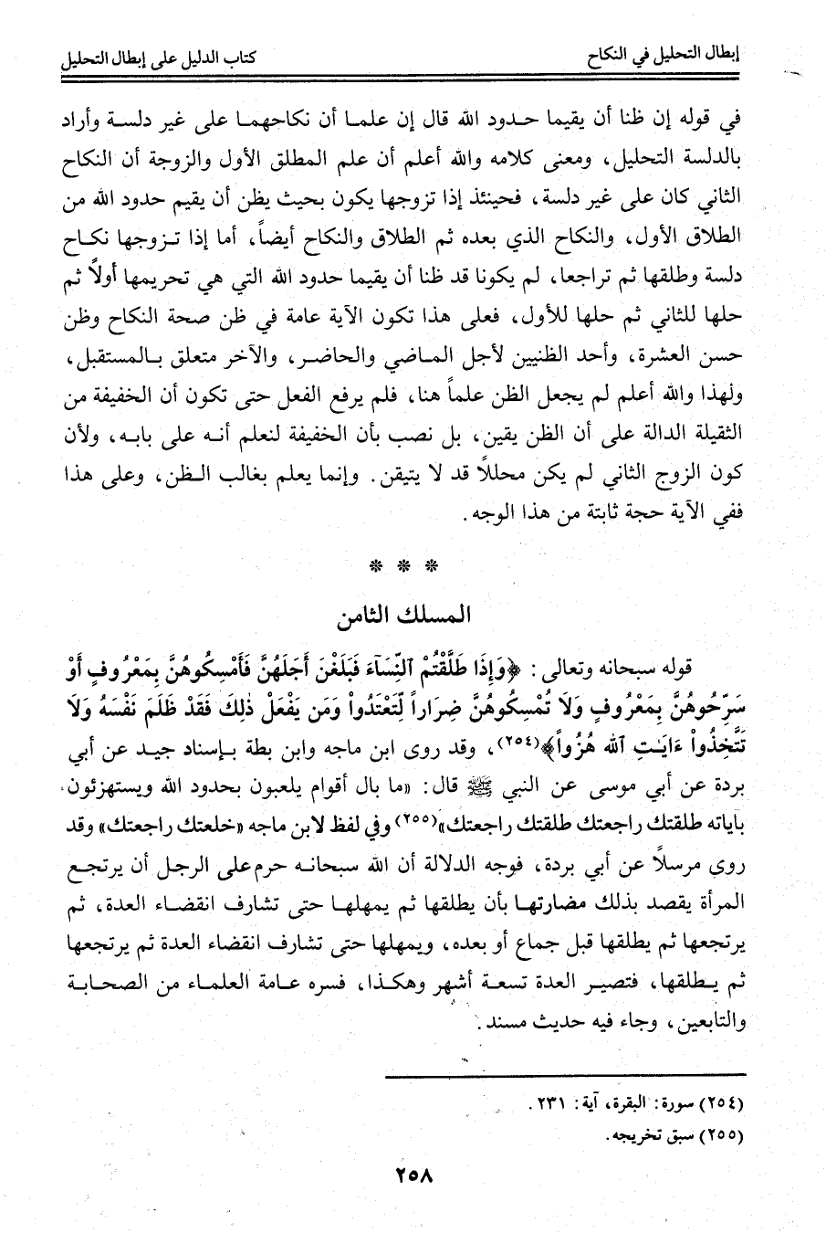 فَوَجْهُ الدَّلَالَةِ أَنَّ اللَّهَ سُبْحَانَهُ حَرَّمَ عَلَى الرَّجُلِ أَنْ يَرْتَجِعَ الْمَرْأَةَ يَقْصِدُ بِذَلِكَ مُضَارَّتَهَا بِأَنْ يُطَلِّقَهَا ثُمَّ يُمْهِلَهَا حَتَّى تُشَارِفَ انْقِضَاءَ الْعِدَّةِ، ثُمَّ يَرْتَجِعَهَا ثُمَّ يُطَلِّقَهَا قَبْلَ جِمَاعٍ أَوْ بَعْدَهُ، وَيُمْهِلَهَا حَتَّى تُشَارِفَ انْقِضَاءَ الْعِدَّةِ ثُمَّ يَرْتَجِعَهَا ثُمَّ يُطَلِّقَهَا، فَتَصِيرَ الْعِدَّةُ تِسْعَةَ أَشْهُرٍ وَهَكَذَا، فَسَّرَهُ عَامَّةُ الْعُلَمَاءِ مِنْ الصَّحَابَةِ وَالتَّابِعِينَ، وَجَاءَ فِيهِ حَدِيثٌ مُسْنَدٌ.