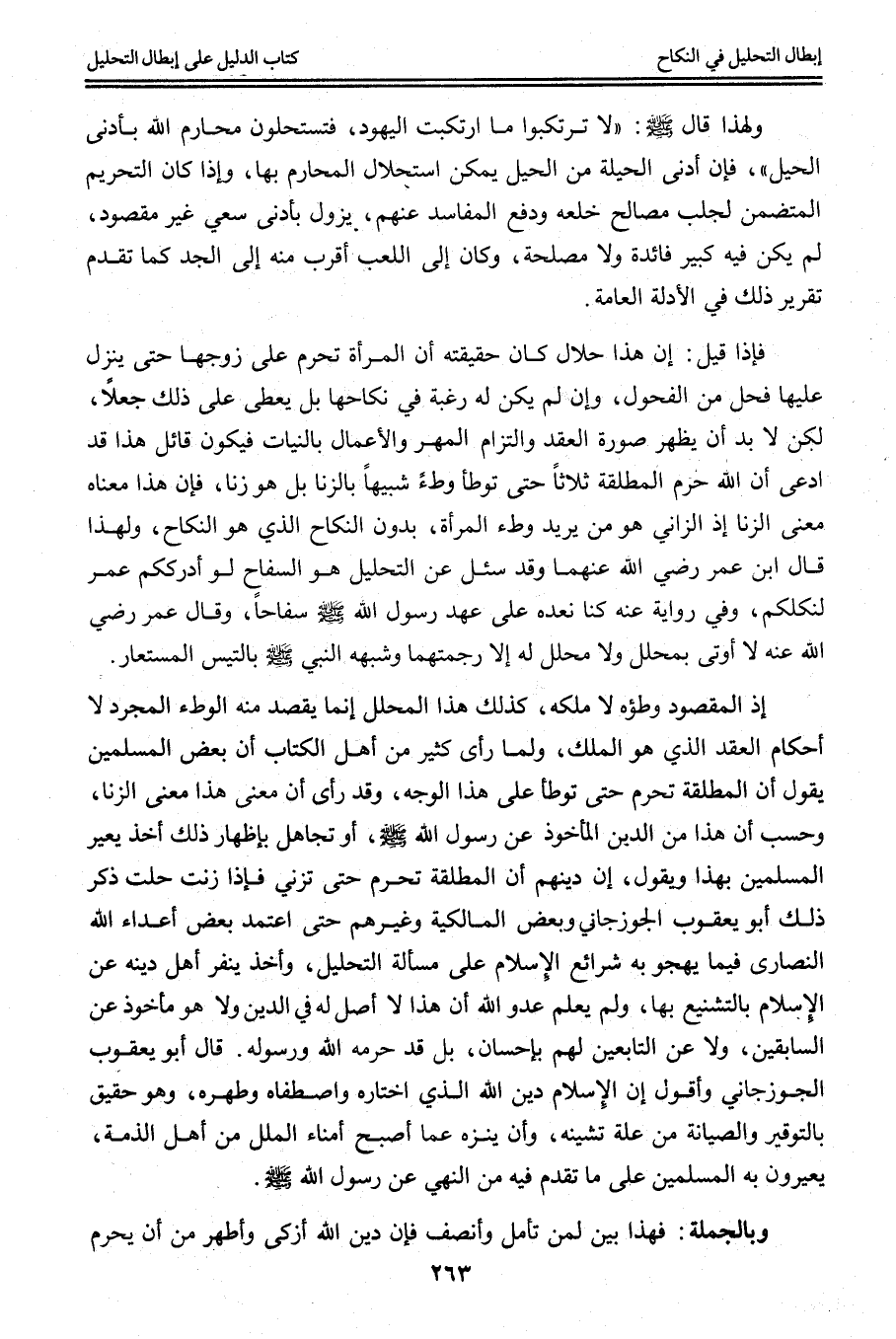 فَإِذَا قِيلَ: إنَّ هَذَا حَلَالٌ كَانَ حَقِيقَتُهُ أَنَّ الْمَرْأَةَ تَحْرُمُ عَلَى زَوْجِهَا حَتَّى يَنْزِلَ عَلَيْهَا فَحْلٌ مِنْ الْفُحُولِ، وَإِنْ لَمْ يَكُنْ لَهُ رَغْبَةٌ فِي نِكَاحِهَا بَلْ يُعْطَى عَلَى ذَلِكَ جُعْلًا، لَكِنْ لَا بُدَّ أَنْ يُظْهِرَ صُورَةَ الْعَقْدِ وَالْتِزَامَ الْمَهْرِ، وَالْأَعْمَالُ بِالنِّيَّاتِ فَيَكُونُ قَائِلُ هَذَا قَدْ ادَّعَى أَنَّ اللَّهَ حَرَّمَ الْمُطَلَّقَةَ ثَلَاثًا حَتَّى تُوطَأَ وَطْئًا شَبِيهًا بِالزِّنَا بَلْ هُوَ زِنًا، فَإِنَّ هَذَا مَعْنَاهُ مَعْنَى الزِّنَا إذْ الزَّانِي هُوَ مَنْ يُرِيدُ وَطْءَ الْمَرْأَةِ، بِدُونِ النِّكَاحِ الَّذِي هُوَ النِّكَاحُ، وَلِهَذَا قَالَ ابْنُ عُمَرَ - رَضِيَ اللَّهُ عَنْهُمَا - وَقَدْ سُئِلَ عَنْ التَّحْلِيلِ، هُوَ السِّفَاحُ لَوْ أَدْرَكَكُمْ عُمَرُ لَنَكَلَكُمْ، وَفِي رِوَايَةٍ عَنْهُ «كُنَّا نَعُدُّهُ عَلَى عَهْدِ رَسُولِ اللَّهِ - صَلَّى اللَّهُ عَلَيْهِ وَسَلَّمَ - سِفَاحًا» ، وَقَالَ عُمَرُ - رَضِيَ اللَّهُ عَنْهُ - لَا أُوتَى بِمُحَلِّلٍ وَلَا مُحَلَّلٍ لَهُ إلَّا رَجَمْتُهُمَا وَشَبَّهَهُ النَّبِيُّ - صَلَّى اللَّهُ عَلَيْهِ وَسَلَّمَ - بِالتَّيْسِ الْمُسْتَعَارِ إذْ الْمَقْصُودُ وَطْؤُهُ لَا مِلْكُهُ، كَذَلِكَ هَذَا الْمُحَلِّلُ إنَّمَا يَقْصِدُ مِنْهُ الْوَطْءَ الْمُجَرَّدَ لَا أَحْكَامَ الْعَقْدِ الَّذِي هُوَ الْمِلْكُ، وَلَمَّا رَأَى كَثِيرٌ مِنْ أَهْلِ الْكِتَابِ أَنَّ بَعْضَ الْمُسْلِمِينَ يَقُولُ إنَّ الْمُطَلَّقَةَ تَحْرُمُ حَتَّى تُوطَأَ عَلَى هَذَا الْوَجْهِ، وَقَدْ رَأَى أَنَّ مَعْنَى هَذَا مَعْنَى الزِّنَا، وَحَسِبَ أَنَّ هَذَا مِنْ الدِّينِ الْمَأْخُوذِ عَنْ رَسُولِ اللَّهِ - صَلَّى اللَّهُ عَلَيْهِ وَسَلَّمَ - أَوْ تَجَاهَلَ بِإِظْهَارِ ذَلِكَ أَخَذَ يُعَيِّرُ الْمُسْلِمِينَ بِهَذَا وَيَقُولُ، إنَّ دِينَهُمْ أَنَّ الْمُطَلَّقَةَ تَحْرُمُ حَتَّى تَزْنِيَ فَإِذَا زَنَتْ حَلَّتْ. ذَكَرَ ذَلِكَ أَبُو يَعْقُوبَ الْجُوزَجَانِيُّ وَبَعْضُ الْمَالِكِيَّةِ وَغَيْرُهُمْ حَتَّى اعْتَمَدَ بَعْضُ أَعْدَاءِ اللَّهِ النَّصَارَى فِيمَا يَهْجُو بِهِ شَرَائِعَ الْإِسْلَامِ عَلَى مَسْأَلَةِ التَّحْلِيلِ، وَأَخَذَ يُنَفِّرُ أَهْلَ دِينِهِ عَنْ الْإِسْلَامِ بِالتَّشْنِيعِ بِهَا، وَلَمْ يَعْلَمْ عَدُوُّ اللَّهِ أَنَّ هَذَا لَا أَصْلَ لَهُ فِي الدِّينِ وَلَا هُوَ مَأْخُوذٌ عَنْ السَّابِقِينَ، وَلَا عَنْ التَّابِعِينَ لَهُمْ بِإِحْسَانٍ، بَلْ قَدْ حَرَّمَهُ اللَّهُ وَرَسُولُهُ. قَالَ أَبُو يَعْقُوبَ الْجُوزَجَانِيُّ وَأَقُولُ إنَّ الْإِسْلَامَ دِينُ اللَّهِ الَّذِي اخْتَارَهُ وَاصْطَفَاهُ وَطَهَّرَهُ، وَهُوَ حَقِيقٌ بِالتَّوْقِيرِ وَالصِّيَانَةِ مِنْ عِلَّةٍ تَشِينُهُ، وَأَنْ يُنَزَّهَ عَمَّا أَصْبَحَ أُمَنَاءُ الْمِلَلِ مِنْ أَهْلِ الذِّمَّةِ، يُعَيِّرُونَ بِهِ الْمُسْلِمِينَ عَلَى مَا تَقَدَّمَ فِيهِ مِنْ النَّهْيِ عَنْ رَسُولِ اللَّهِ - صَلَّى اللَّهُ عَلَيْهِ وَسَلَّمَ -.