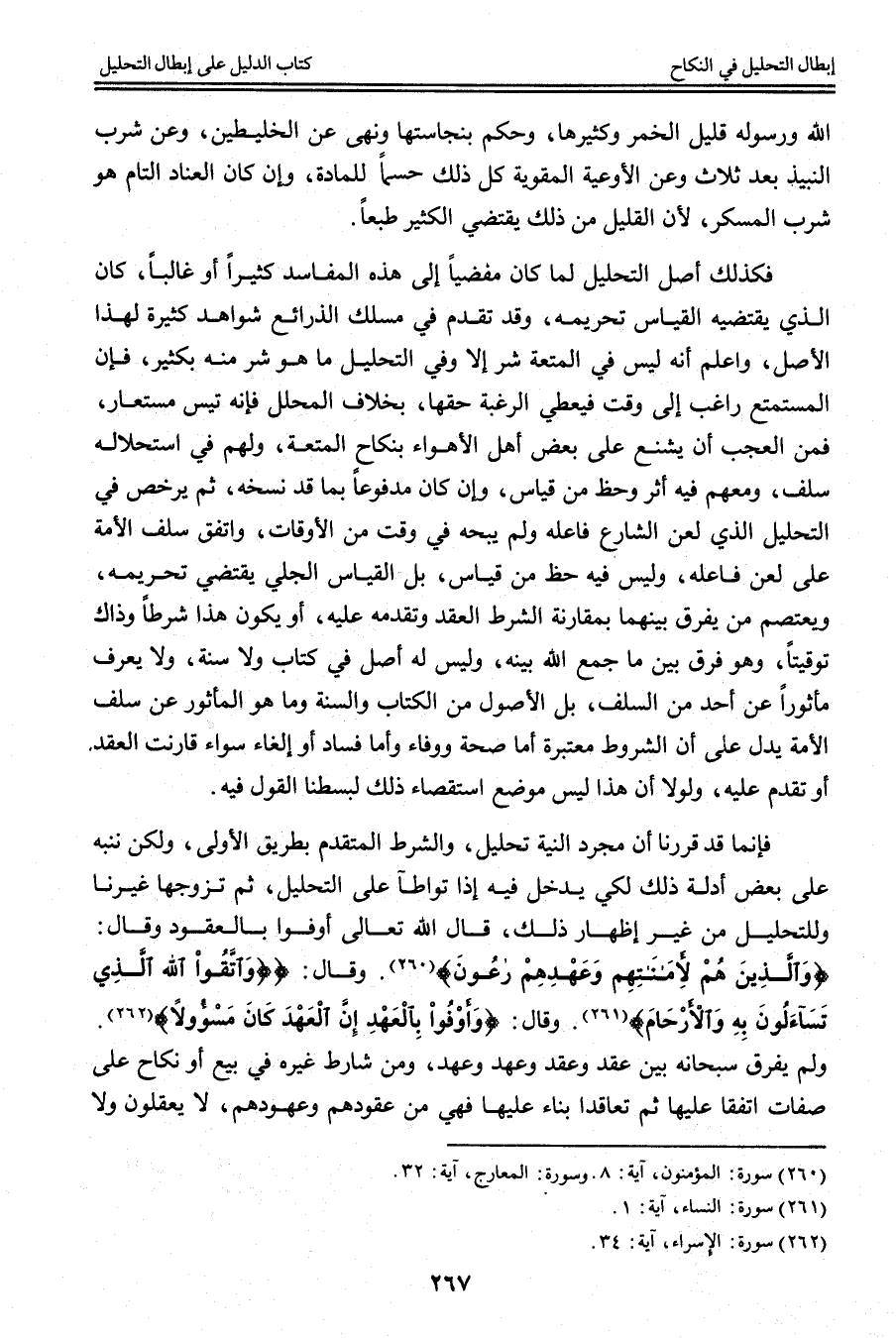 فَكَذَلِكَ أَصْلُ التَّحْلِيلِ لَمَّا كَانَ مُفْضِيًا إلَى هَذِهِ الْمَفَاسِدِ كَثِيرًا أَوْ غَالِبًا، كَانَ الَّذِي يَقْتَضِيهِ الْقِيَاسُ تَحْرِيمَهُ، وَقَدْ تَقَدَّمَ فِي مَسْلَكِ الذَّرَائِعِ شَوَاهِدُ كَثِيرَةٌ لِهَذَا الْأَصْلِ، وَاعْلَمْ أَنَّهُ لَيْسَ فِي الْمُتْعَةِ شَرٌّ إلَّا وَفِي التَّحْلِيلِ مَا هُوَ شَرٌّ مِنْهُ بِكَثِيرٍ، فَإِنَّ الْمُسْتَمْتِعَ رَاغِبٌ إلَى وَقْتٍ فَيُعْطِي الرَّغْبَةَ حَقَّهَا، بِخِلَافِ الْمُحَلِّلِ فَإِنَّهُ تَيْسٌ مُسْتَعَارٌ، فَمِنْ الْعَجَبِ أَنْ يُشَنَّعَ عَلَى بَعْضِ أَهْلِ الْأَهْوَاءِ بِنِكَاحِ الْمُتْعَةِ، وَلَهُمْ فِي اسْتِحْلَالِهِ سَلَفٌ، وَمَعَهُمْ فِيهِ أَثَرٌ وَحَظٌّ مِنْ قِيَاسٍ، وَإِنْ كَانَ مَدْفُوعًا بِمَا قَدْ نَسَخَهُ، ثُمَّ يُرَخِّصُ فِي التَّحْلِيلِ الَّذِي لَعَنَ الشَّارِعُ فَاعِلَهُ وَلَمْ يُبِحْهُ فِي وَقْتٍ مِنْ الْأَوْقَاتِ، وَاتَّفَقَ سَلَفُ الْأُمَّةِ عَلَى لَعْنِ فَاعِلِهِ، وَلَيْسَ فِيهِ حَظٌّ مِنْ قِيَاسٍ، بَلْ الْقِيَاسُ الْجَلِيُّ يَقْتَضِي تَحْرِيمَهُ، وَيَعْتَصِمُ مَنْ يُفَرِّقُ بَيْنَهُمَا بِمُقَارَنَةِ الشَّرْطِ الْعَقْدَ وَتَقَدُّمِهِ عَلَيْهِ، أَوْ يَكُونُ هَذَا شَرْطًا وَذَاكَ تَوْقِيتًا، وَهُوَ فَرَّقَ بَيْنَ مَا جَمَعَ اللَّهُ بَيْنَهُ، وَلَيْسَ لَهُ أَصْلٌ فِي كِتَابٍ وَلَا سُنَّةٍ، وَلَا يُعْرَفُ مَأْثُورًا عَنْ أَحَدٍ مِنْ السَّلَفِ، بَلْ الْأُصُولُ مِنْ الْكِتَابِ وَالسُّنَّةِ وَمَا هُوَ الْمَأْثُورُ عَنْ سَلَفِ الْأُمَّةِ يَدُلُّ عَلَى أَنَّ الشُّرُوطَ مُعْتَبَرَةٌ إمَّا صِحَّةً وَوَفَاءً وَإِمَّا فَسَادًا أَوْ إلْغَاءً سَوَاءٌ قَارَنَتْ الْعَقْدَ أَوْ تَقَدَّمَ عَلَيْهِ، وَلَوْلَا أَنَّ هَذَا لَيْسَ مَوْضِعَ اسْتِقْصَاءِ ذَلِكَ لَبَسَطَنَا الْقَوْلَ فِيهِ. فَإِنَّمَا قَدْ قَرَّرَنَا أَنَّ مُجَرَّدَ النِّيَّةِ تَحْلِيلٌ، وَالشَّرْطُ الْمُتَقَدِّمُ بِطَرِيقِ الْأَوْلَى، وَلَكِنْ نُنَبِّهُ عَلَى بَعْضِ أَدِلَّةِ ذَلِكَ لِكَيْ يَدْخُلَ فِيهِ إذَا تَوَاطَآ عَلَى التَّحْلِيلِ، ثُمَّ تَزَوَّجَهَا غَيْرَ نَاوٍ لِلتَّحْلِيلِ مِنْ غَيْرِ إظْهَارِ ذَلِكَ، قَالَ اللَّهُ تَعَالَى {أَوْفُوا بِالْعُقُودِ} [المائدة: 1] وَقَالَ: {وَالَّذِينَ هُمْ لأَمَانَاتِهِمْ وَعَهْدِهِمْ رَاعُونَ} [المؤمنون: 8] .