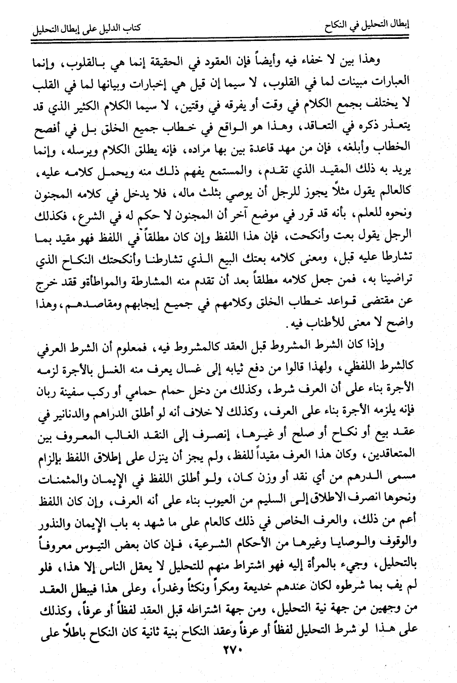 وَهَذَا بَيِّنٌ لَا خَفَاءَ فِيهِ وَأَيْضًا فَإِنَّ الْعُقُودَ فِي الْحَقِيقَةِ إنَّمَا هِيَ بِالْقُلُوبِ، وَإِنَّمَا الْعِبَارَاتُ مُبَيِّنَاتٌ لِمَا فِي الْقُلُوبِ، لَا سِيَّمَا إنْ قِيلَ هِيَ إخْبَارَاتٌ، وَبَيَانُهَا لِمَا فِي الْقَلْبِ لَا يَخْتَلِفُ بِجَمْعِ الْكَلَامِ فِي وَقْتٍ أَوْ يُفَرِّقُهُ فِي وَقْتَيْنِ، لَا سِيَّمَا الْكَلَامُ الْكَثِيرُ الَّذِي قَدْ يَتَعَذَّرُ ذِكْرُهُ فِي التَّعَاقُدِ، وَهَذَا هُوَ الْوَاقِعُ فِي خِطَابِ جَمِيعِ الْخَلْقِ بَلْ فِي أَفْصَحِ الْخِطَابِ وَأَبْلَغِهِ، فَإِنَّ مَنْ مَهَّدَ قَاعِدَةً بَيَّنَ بِهَا مُرَادَهُ، فَإِنَّهُ يُطْلِقُ الْكَلَامَ وَيُرْسِلُهُ، وَإِنَّمَا يُرِيدُ بِهِ ذَلِكَ الْمُقَيَّدَ الَّذِي تَقَدَّمَ، وَالْمُسْتَمِعُ يَفْهَمُ ذَلِكَ مِنْهُ وَيَحْمِلُ كَلَامَهُ عَلَيْهِ، كَالْعَالِمِ يَقُولُ مَثَلًا يَجُوزُ لِلرَّجُلِ أَنْ يُوصِيَ بِثُلُثِ مَالِهِ، فَلَا يَدْخُلُ فِي كَلَامِهِ الْمَجْنُونُ وَنَحْوُهُ لِلْعِلْمِ بِأَنَّهُ قَدْ قَرَّرَ فِي مَوْضِعٍ آخَرَ أَنَّ الْمَجْنُونَ لَا حُكْمَ لَهُ فِي الشَّرْعِ، فَكَذَلِكَ الرَّجُلُ يَقُولُ مَثَلًا وَأَنْكَحْت، فَإِنَّ هَذَا اللَّفْظَ وَإِنْ كَانَ مُطْلَقًا فِي اللَّفْظِ فَهُوَ مُقَيَّدٌ بِمَا تَشَارَطَا عَلَيْهِ قَبْلُ، وَمَعْنَى كَلَامِهِ بِعْتُك الْبَيْعَ الَّذِي تَشَارَطْنَا وَأَنْكَحْتُك النِّكَاحَ الَّذِي تَرَاضَيْنَا بِهِ، فَمَنْ جَعَلَ كَلَامَهُ مُطْلَقًا بَعْدَ أَنْ تَقَدَّمَ مِنْهُ الْمُشَارَطَةُ وَالْمُوَاطَأَةُ فَقَدْ خَرَجَ عَنْ مُقْتَضَى قَوَاعِدِ خِطَابِ الْخَلْقِ وَكَلَامِهِمْ فِي جَمِيعِ إيجَابِهِمْ وَمَقَاصِدِهِمْ، وَهَذَا وَاضِحٌ لَا مَعْنَى لِلْإِطْنَابِ فِيهِ.