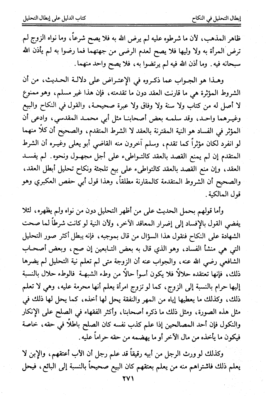 وَأَمَّا قَوْلُهُمْ بِحَمْلِ الْحَدِيثِ عَلَى مَنْ أَظْهَرَ التَّحْلِيلَ دُونَ مَنْ نَوَاهُ وَلَمْ يُظْهِرْهُ، لِئَلَّا يُفْضِيَ الْقَوْلُ بِالْإِفْسَادِ إلَى إضْرَارِ الْمُعَاقِدِ الْآخَرِ، وَلِأَنَّ النِّيَّةَ لَوْ كَانَتْ شَرْطًا لَمَا صَحَّتْ الشَّهَادَةُ عَلَى النِّكَاحِ فَنَقُولُ هَذَا السُّؤَالُ مَنْ قَالَ بِمُوجَبِهِ، فَإِنَّهُ يُبْطِلُ أَكْثَرَ صُوَرِ التَّحْلِيلِ الَّتِي هِيَ مَنْشَأُ الْفَسَادِ، وَهُوَ الَّذِي قَالَ بِهِ بَعْضُ التَّابِعِينَ إنْ صَحَّ، وَبَعْضُ أَصْحَابِ الشَّافِعِيِّ - رَضِيَ اللَّهُ عَنْهُ -، وَالْجَوَابُ عَنْهُ أَنَّ الزَّوْجَةَ مَتَى لَمْ تَعْلَمْ نِيَّةَ التَّحْلِيلِ لَمْ يَضُرَّهَا ذَلِكَ، فَإِنَّهَا تَعْتَقِدُهُ حَلَالًا فَلَا يَكُونُ أَسْوَأَ حَالًا مِنْ وَطْءِ الشُّبْهَةِ فَالْوَطْءُ حَلَالٌ بِالنِّسْبَةِ إلَيْهَا، حَرَامٌ بِالنِّسْبَةِ إلَى الزَّوْجِ، كَمَا لَوْ تَزَوَّجَ امْرَأَةً يَعْلَمُ أَنَّهَا مُحَرَّمَةٌ عَلَيْهِ، وَهِيَ لَا تَعْلَمُ ذَلِكَ، وَكَذَلِكَ مَا يُعْطِيهَا إيَّاهُ مِنْ الْمَهْرِ وَالنَّفَقَةِ يَحِلُّ لَهَا أَخْذُهُ، كَمَا يَحِلُّ لَهَا ذَلِكَ فِي مِثْلِ هَذِهِ الصُّورَةِ، وَمِثْلُ ذَلِكَ مَا ذَكَرَهُ أَصْحَابُنَا، وَأَكْثَرُ الْفُقَهَاءِ فِي الصُّلْحِ عَلَى الْإِنْكَارِ وَالنُّكُولِ فَإِنَّ أَحَدَ الْمُصَالِحَيْنِ إذَا عَلِمَ كَذِبَ نَفْسِهِ كَانَ الصُّلْحُ بَاطِلًا فِي حَقِّهِ خَاصَّةً فَيَكُونُ مَا يَأْخُذُهُ مِنْ مَالِ الْآخَرِ أَوْ مَا يَهْضِمُهُ مِنْ حَقِّهِ حَرَامًا عَلَيْهِ.