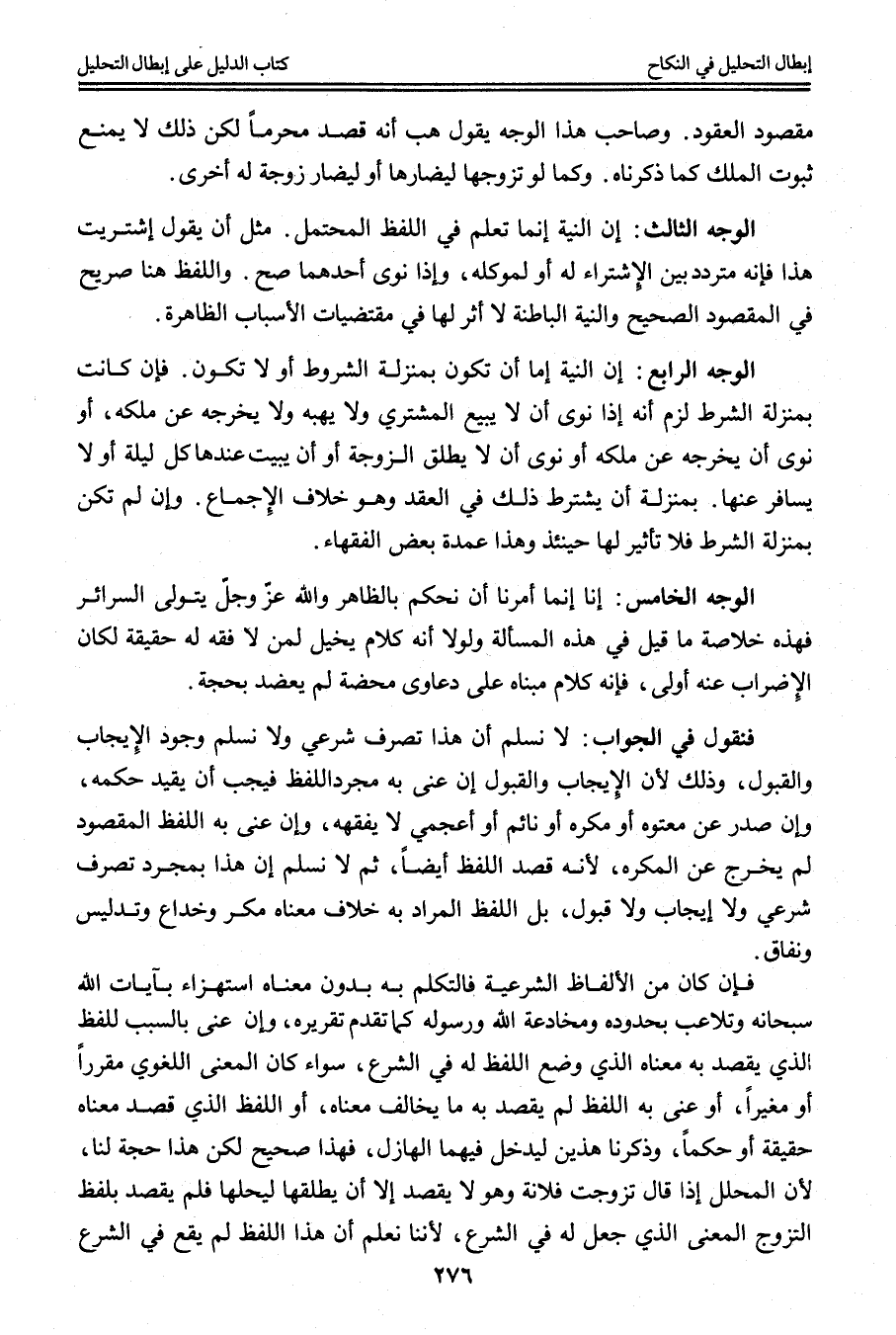 الْوَجْهُ الْخَامِسُ: أَنَّا إنَّمَا أُمِرْنَا أَنْ نَحْكُمَ بِالظَّاهِرِ وَاَللَّهُ عَزَّ وَجَلَّ يَتَوَلَّى السَّرَائِرَ فَهَذِهِ خُلَاصَةُ مَا قِيلَ فِي هَذِهِ الْمَسْأَلَةِ وَلَوْلَا أَنَّهُ كَلَامٌ يُخَيَّلُ لِمَنْ لَا فِقْهَ لَهُ حَقِيقَةً لَكَانَ الْإِضْرَابُ عَنْهُ أَوْلَى، فَإِنَّهُ كَلَامٌ مَبْنَاهُ عَلَى دَعَاوًى مَحْضَةٍ لَمْ يُعَضَّدْ بِحُجَّةٍ.