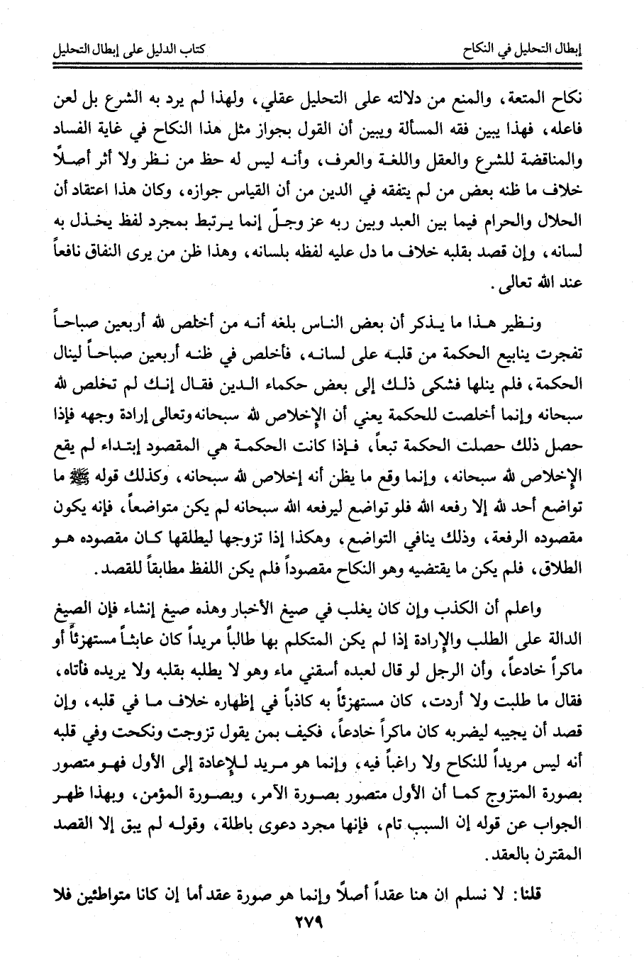 نِكَاحِ الْمُتْعَةِ، وَالْمَنْعُ مِنْ دَلَالَتِهِ عَلَى التَّحْلِيلِ عَقْلِيٌّ، وَلِهَذَا لَمْ يَرِدْ بِهِ الشَّرْعُ بَلْ لَعَنَ فَاعِلَهُ، فَهَذَا يُبَيِّنُ فِقْهَ الْمَسْأَلَةِ وَيُبَيِّنُ أَنَّ الْقَوْلَ بِجَوَازِ مِثْلِ هَذَا النِّكَاحِ فِي غَايَةِ الْفَسَادِ وَالْمُنَاقَضَةِ لِلشَّرْعِ وَالْعَقْلِ وَاللُّغَةِ وَالْعُرْفِ، وَأَنَّهُ لَيْسَ لَهُ حَظٌّ مِنْ نَظَرٍ وَلَا أَثَرٍ أَصْلًا خِلَافُ مَا ظَنَّهُ بَعْضُ مَنْ لَمْ يَتَفَقَّهْ فِي الدِّينِ مِنْ أَنَّ الْقِيَاسَ جَوَازُهُ، وَكَانَ هَذَا اعْتِقَادُ أَنَّ الْحَلَالَ وَالْحَرَامَ فِيمَا بَيْنَ الْعَبْدِ وَبَيْنَ رَبِّهِ عَزَّ وَجَلَّ إنَّمَا يَرْتَبِطُ بِمُجَرَّدِ لَفْظٍ يَخْذُلُ بِهِ لِسَانُهُ، وَإِنْ قَصَدَ بِقَلْبِهِ خِلَافَ مَا دَلَّ عَلَيْهِ لَفْظُهُ بِلِسَانِهِ، وَهَذَا ظَنُّ مَنْ يَرَى النِّفَاقَ نَافِعًا عِنْدَ اللَّهِ تَعَالَى.