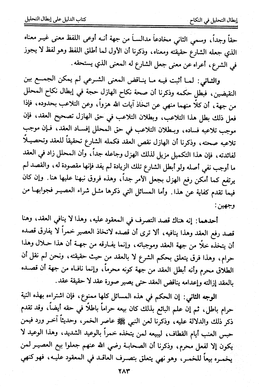 وَالثَّانِي: لَمَّا أَثْبَتَ فِيهِ مَا يُنَاقِضُ الْمَعْنَى الشَّرْعِيَّ لَمْ يُمْكِنْ الْجَمْعُ بَيْنَ النَّقِيضَيْنِ، فَبَطَلَ حُكْمُهُ وَذَكَرْنَا أَنَّ صِحَّةَ نِكَاحِ الْهَازِلِ حُجَّةٌ فِي إبْطَالِ نِكَاحِ الْمُحَلِّلِ مِنْ جِهَةِ أَنَّ كُلًّا مِنْهُمَا مَنْهِيٌّ عَنْ اتِّخَاذِ آيَاتِ اللَّهِ هُزْوًا، وَعَنْ التَّلَاعُبِ بِحُدُودِهِ، فَإِذَا فَعَلَ ذَلِكَ بَطَلَ هَذَا التَّلَاعُبُ، وَبُطْلَانُ التَّلَاعُبِ فِي حَقِّ الْهَازِلِ تَصْحِيحُ الْعَقْدِ، فَإِنَّ مُوجَبَ تَلَاعُبِهِ فَسَادُهُ، وَبُطْلَانُ التَّلَاعُبِ فِي حَقِّ الْمُحَلِّلِ إفْسَادُ الْعَقْدِ، فَإِنَّ مُوجَبَ تَلَاعُبِهِ صِحَّتُهُ، وَذَكَرْنَا أَنَّ الْهَازِلَ نَقَصَ الْعَقْدَ فَكَمَّلَهُ الشَّارِعُ تَحْقِيقًا لِلْعَقْدِ وَتَحْصِيلًا لِفَائِدَتِهِ، فَإِنَّ هَذَا التَّكْمِيلَ مُزِيلٌ لِذَلِكَ الْهَزْلِ وَجَاعِلُهُ جِدًّا، وَأَنَّ الْمُحَلِّلَ زَادَ فِي الْعَقْدِ مَا أَوْجَبَ نَفْيَ أَصْلِهِ وَلَوْ أَبْطَلَ الشَّارِعُ تِلْكَ الزِّيَادَةَ لَمْ يَفْدِ فَإِنَّهَا مَقْصُودَةٌ لَهُ، وَالْقَصْدُ لَمْ يَرْتَفِعْ كَمَا أَمْكَنَ رَفْعُ الْهَزْلِ بِجَعْلِ الْأَمْرِ جِدًّا، وَهَذِهِ فُرُوقٌ نَبَّهْنَا عَلَيْهَا هُنَا. وَإِنْ كَانَ فِيمَا تَقَدَّمَ كِفَايَةٌ عَنْ هَذَا. وَأَمَّا الْمَسَائِلُ الَّتِي ذَكَرَهَا مِثْلُ شِرَاءِ الْعَصِيرِ فَجَوَابُهَا مِنْ وَجْهَيْنِ: