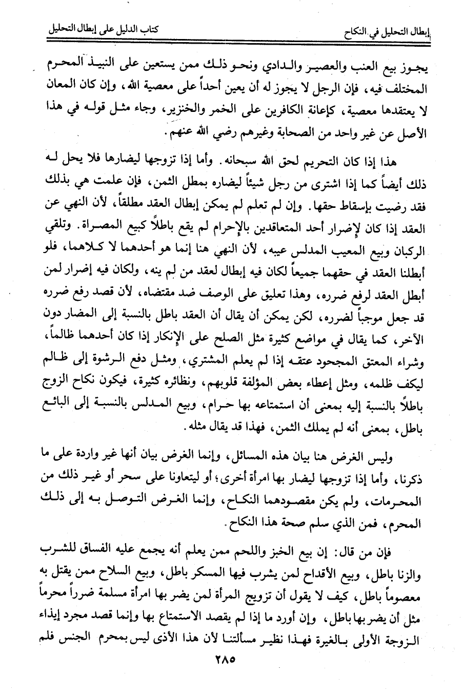 وَلَيْسَ الْغَرَضُ هُنَا بَيَانُ هَذِهِ الْمَسَائِلِ، وَإِنَّمَا الْغَرَضُ بَيَانُ أَنَّهَا غَيْرُ وَارِدَةٍ عَلَى مَا ذَكَرْنَا، وَأَمَّا إذَا تَزَوَّجَهَا لِيُضَارَّ بِهَا امْرَأَةً أُخْرَى؛ أَوْ لِيَتَعَاوَنَا عَلَى سِحْرٍ أَوْ غَيْرِ ذَلِكَ مِنْ الْمُحَرَّمَاتِ، وَلَمْ يَكُنْ مَقْصُودُهُمَا النِّكَاحَ، وَإِنَّمَا الْغَرَضُ التَّوَصُّلُ بِهِ إلَى ذَلِكَ الْمُحَرَّمِ، فَمَنْ الَّذِي سَلَّمَ صِحَّةَ هَذَا النِّكَاحِ؟ . فَإِنَّ مَنْ قَالَ: إنَّ بَيْعَ الْخُبْزِ وَاللَّحْمِ مِمَّنْ يَعْلَمُ أَنَّهُ يَجْمَعُ عَلَيْهِ الْفُسَّاقَ لِلشُّرْبِ وَالزِّنَا بَاطِلٌ، وَبَيْعَ الْأَقْدَاحِ لِمَنْ يَشْرَبُ فِيهَا الْمُسْكِرَ بَاطِلٌ، وَبَيْعَ السِّلَاحِ مِمَّنْ يَقْتُلُ بِهِ مَعْصُومًا بَاطِلٌ، كَيْفَ لَا يَقُولُ إنَّ تَزْوِيجَ الْمَرْأَةِ لِمَنْ يَضُرُّ بِهَا امْرَأَةً مُسْلِمَةً ضَرَرًا مُحَرَّمًا مِثْلَ أَنْ يَضْرِبَهَا بَاطِلٌ، وَإِنْ أَوْرَدَ مَا إذَا لَمْ يَقْصِدْ الِاسْتِمْتَاعَ بِهَا وَإِنَّمَا قَصَدَ مُجَرَّدَ إيذَاءِ الزَّوْجَةِ الْأُولَى بِالْغَيْرَةِ فَهَذَا نَظِيرُ مَسْأَلَتِنَا؛ لِأَنَّ هَذَا الْأَذَى لَيْسَ بِمُحَرَّمِ الْجِنْسِ فَلَمْ