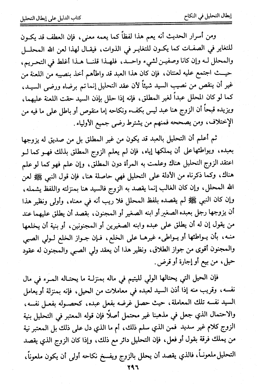 فَإِنَّ الْحِيَلَ الَّتِي يَحْتَالُهَا الْوَلِيُّ لِلْيَتِيمِ فِي مَالِهِ بِمَنْزِلَةِ مَا يَحْتَالُهُ الْمَرْءُ فِي مَالِ نَفْسِهِ، وَقَرِيبٌ مِنْهُ إذَا أَذِنَ السَّيِّدُ لِعَبْدِهِ فِي مُعَامَلَاتٍ مِنْ الْحِيَلِ، فَإِنَّهُ بِمَنْزِلَةِ أَنْ يُعَامِلَ السَّيِّدُ نَفْسَهُ تِلْكَ الْمُعَامَلَةَ، حَيْثُ حَصَلَ غَرَضُهُ بِفِعْلِ عَبْدِهِ، كَحُصُولِهِ بِفِعْلِ نَفْسِهِ، وَالِاحْتِمَالُ الَّذِي جُعِلَ فِي مَذْهَبِنَا غَيْرُ مُحْتَمَلٍ أَصْلًا فَإِنَّ قَوْلَهُ الْمُعْتَبَرَ فِي التَّحْلِيلِ بِنِيَّةِ الزَّوْجِ كَلَامٌ غَيْرُ سَدِيدٍ فَمَنْ الَّذِي سَلَّمَ ذَلِكَ، أَوْ مَا الَّذِي دَلَّ عَلَى ذَلِكَ بَلْ الْمُعْتَبَرُ نِيَّةُ مَنْ يَمْلِكُ فُرْقَةً بِقَوْلٍ أَوْ فِعْلٍ، فَإِنَّ التَّحْلِيلَ دَائِرٌ مَعَ ذَلِكَ، وَإِذَا كَانَ الزَّوْجُ الَّذِي يَقْصِدُ التَّحْلِيلَ مَلْعُونًا، فَاَلَّذِي يَقْصِدُ أَنْ يُحَلِّلَ بِالزَّوْجِ وَيَفْسَخَ نِكَاحَهُ أَوْلَى أَنْ يَكُونَ مَلْعُونًا،