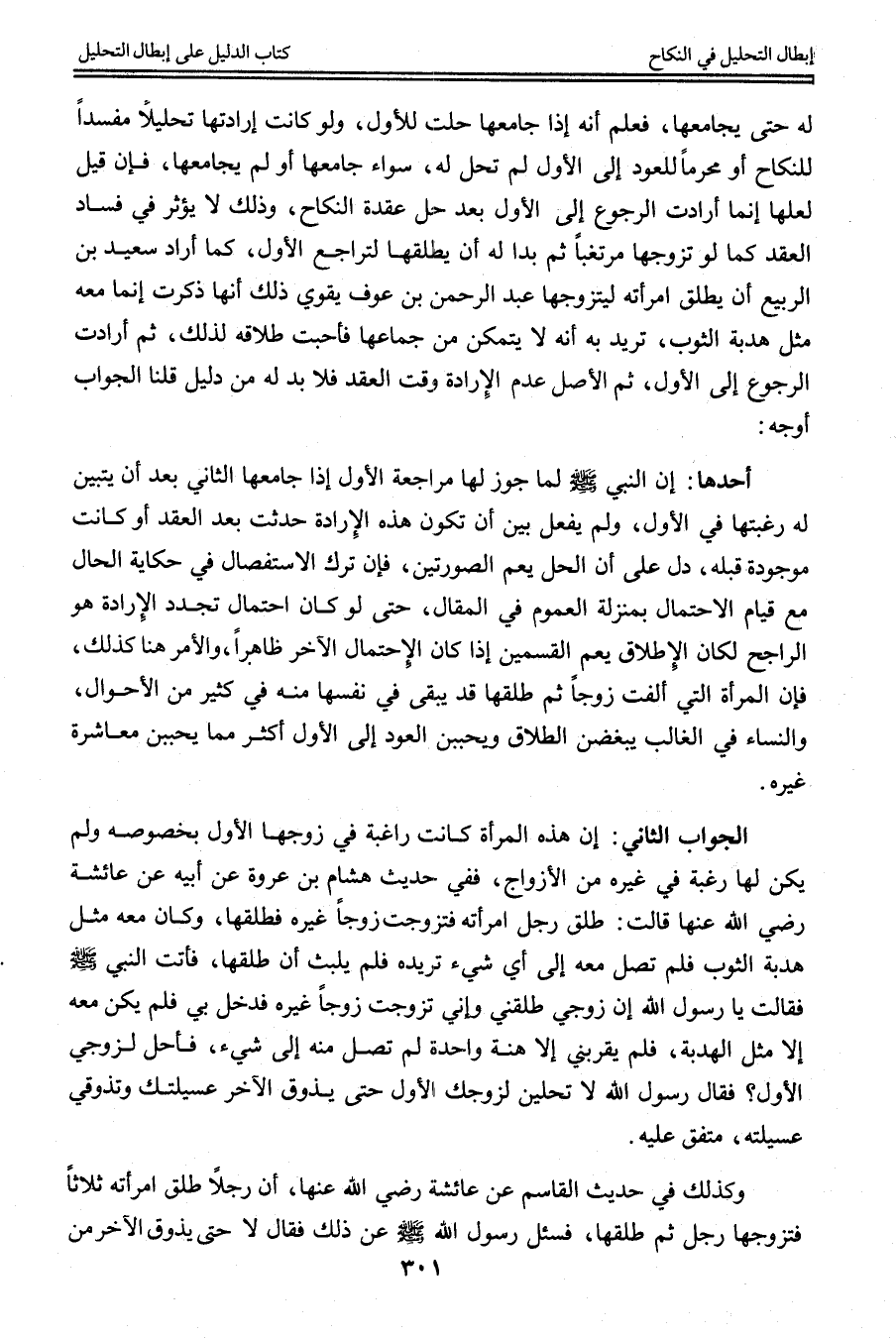 الْجَوَابُ الثَّانِي: أَنَّ هَذِهِ الْمَرْأَةَ كَانَتْ رَاغِبَةً فِي زَوْجِهَا الْأَوَّلِ بِخُصُوصِهِ وَلَمْ يَكُنْ لَهَا رَغْبَةٌ فِي غَيْرِهِ مِنْ الْأَزْوَاجِ، فَفِي حَدِيثِ هِشَامِ بْنِ عُرْوَةَ عَنْ أَبِيهِ عَنْ عَائِشَةَ - رَضِيَ اللَّهُ عَنْهَا - «قَالَتْ: طَلَّقَ رَجُلٌ امْرَأَتَهُ فَتَزَوَّجَتْ زَوْجًا غَيْرَهُ فَطَلَّقَهَا، وَكَانَ مَعَهُ مِثْلُ هُدْبَةِ الثَّوْبِ فَلَمْ تَصِلْ مَعَهُ إلَى أَيِّ شَيْءٍ تُرِيدُهُ فَلَمْ يَلْبَثْ أَنْ طَلَّقَهَا، فَأَتَتْ النَّبِيَّ - صَلَّى اللَّهُ عَلَيْهِ وَسَلَّمَ - فَقَالَتْ يَا رَسُولَ اللَّهِ إنَّ زَوْجِي طَلَّقَنِي وَإِنِّي تَزَوَّجْت زَوْجًا غَيْرَهُ فَدَخَلَ بِي فَلَمْ يَكُنْ مَعَهُ إلَّا مِثْلُ الْهُدْبَةِ، فَلَمْ يَقْرَبْنِي إلَّا هَنَّةً وَاحِدَةً لَمْ يَصِلْ مِنْهُ إلَيَّ شَيْءٌ، فَأَحِلُّ لِزَوْجِي الْأَوَّلِ؟ فَقَالَ رَسُولُ اللَّهِ لَا تَحِلِّينَ لِزَوْجِك الْأَوَّلِ حَتَّى يَذُوقَ الْآخَرُ عُسَيْلَتَك وَتَذُوقِي عُسَيْلَتَهُ» ، مُتَّفَقٌ عَلَيْهِ.