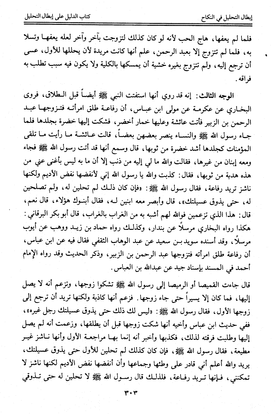 فَرَوَى الْبُخَارِيُّ عَنْ عِكْرِمَةَ عَنْ مَوْلَى ابْنِ عَبَّاسٍ، «أَنَّ رِفَاعَةَ طَلَّقَ امْرَأَتَهُ فَتَزَوَّجَهَا عَبْدُ الرَّحْمَنِ بْنُ الزُّبَيْرِ فَأَتَتْ عَائِشَةَ وَعَلَيْهَا خِمَارٌ أَخْضَرُ، فَشَكَتْ إلَيْهَا خُضْرَةً بِجِلْدِهَا فَلَمَّا جَاءَ رَسُولُ اللَّهِ - صَلَّى اللَّهُ عَلَيْهِ وَسَلَّمَ - وَالنِّسَاءُ يَنْصُرُ بَعْضُهُنَّ بَعْضًا، قَالَتْ عَائِشَةُ مَا رَأَيْت مَا تَلْقَى الْمُؤْمِنَاتُ لَجِلْدُهَا أَشَدُّ خُضْرَةً مِنْ ثَوْبِهَا، قَالَ وَسَمِعَ أَنَّهَا قَدْ أَتَتْ رَسُولَ اللَّهِ - صَلَّى اللَّهُ عَلَيْهِ وَسَلَّمَ - فَجَاءَ وَمَعَهُ ابْنَانِ مِنْ غَيْرِهَا، فَقَالَتْ وَاَللَّهِ مَا لِي إلَيْهِ مِنْ ذَنْبٍ إلَّا أَنَّ مَا بِهِ لَيْسَ بِأَغْنَى عَنِّي مِنْ هَذِهِ وَأَخَذَتْ هُدْبَةً مِنْ ثَوْبِهَا، فَقَالَ: كَذَبَتْ وَاَللَّهِ يَا رَسُولَ اللَّهِ إنِّي لَأَنْفُضُهَا نَفْضَ الْأَدِيمِ وَلَكِنَّهَا نَاشِزٌ تُرِيدُ رِفَاعَةَ، فَقَالَ رَسُولُ اللَّهِ: فَإِنْ كَانَ ذَلِكَ لَمْ تَحِلِّينَ لَهُ، وَلَمْ تَصْلُحِينَ لَهُ، حَتَّى يَذُوقَ عُسَيْلَتَك، قَالَ وَأَبْصَرَ مَعَهُ ابْنَيْنِ لَهُ، فَقَالَ أَبَنُوك هَؤُلَاءِ، قَالَ نَعَمْ، قَالَ: هَذَا الَّذِي تَزْعُمِينَ فَوَاَللَّهِ لَهُمْ أَشْبَهُ بِهِ مِنْ الْغُرَابِ بِالْغُرَابِ» ، قَالَ أَبُو بَكْرٍ الْبَرْقَانِيُّ: هَكَذَا رَوَاهُ الْبُخَارِيُّ مُرْسَلًا عَنْ بِنْدَارٍ، وَكَذَلِكَ رَوَاهُ حَمَّادُ بْنُ زَيْدٍ وَوَهْبٌ عَنْ أَيُّوبَ مُرْسَلًا، وَقَدْ أَسْنَدَهُ سُوَيْد بْنُ سَعِيدٍ عَنْ عَبْدِ الْوَهَّابِ الثَّقَفِيِّ فَقَالَ فِيهِ عَنْ ابْنِ عَبَّاسٍ أَنَّ رِفَاعَةَ طَلَّقَ امْرَأَتَهُ فَتَزَوَّجَهَا عَبْدُ الرَّحْمَنِ بْنُ الزُّبَيْرِ، وَذَكَرَ الْحَدِيثَ وَقَدْ رَوَاهُ الْإِمَامُ أَحْمَدُ فِي الْمُسْنَدِ بِإِسْنَادٍ جَيِّدٍ عَنْ عَبْدِ اللَّهِ بْنِ الْعَبَّاسِ «قَالَ جَاءَتْ الْغُمَيْصَاءُ أَوْ الرُّمَيْصَاءُ إلَى رَسُولِ اللَّهِ - صَلَّى اللَّهُ عَلَيْهِ وَسَلَّمَ - تَشْكُو زَوْجَهَا، وَتَزْعُمُ أَنَّهُ لَا يَصِلُ إلَيْهَا، فَمَا كَانَ إلَّا يَسِيرًا حَتَّى جَاءَ زَوْجُهَا فَزَعَمَ أَنَّهَا كَاذِبَةٌ وَلَكِنَّهَا تُرِيدُ أَنْ تَرْجِعَ إلَى زَوْجِهَا الْأَوَّلِ، فَقَالَ رَسُولُ اللَّهِ - صَلَّى اللَّهُ عَلَيْهِ وَسَلَّمَ -: لَيْسَ لَك ذَلِكَ حَتَّى يَذُوقَ عُسَيْلَتَك رَجُلٌ غَيْرَهُ»