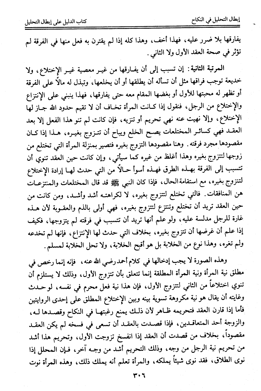 وَهَذِهِ الصُّورَةُ لَا يَجِبُ إدْخَالُهَا فِي كَلَامِ أَحْمَدَ - رَضِيَ اللَّهُ عَنْهُ -، فَإِنَّهُ إنَّمَا رَخَّصَ فِي مُطْلَقِ نِيَّةِ الْمَرْأَةِ وَنِيَّةُ الْمَرْأَةِ الْمُطَلَّقَةِ إنَّمَا تَتَعَلَّقُ بِأَنْ تَتَزَوَّجَ الْأَوَّلَ، وَذَلِكَ لَا يَسْتَلْزِمُ أَنْ تَنْوِيَ اخْتِلَاعًا مِنْ الثَّانِي لِتَتَزَوَّجَ الْأَوَّلَ، فَإِنَّ هَذَا نِيَّةُ فِعْلٍ مُحَرَّمٍ فِي نَفْسِهِ لَوْ حَدَثَ وَغَايَتُهُ أَنْ يُقَالَ هُوَ نِيَّةٌ مَكْرُوهَةٌ تَسْوِيَةً بَيْنَهُ وَبَيْنَ الِاخْتِلَاعِ الْمُطْلَقِ عَلَى إحْدَى الرِّوَايَتَيْنِ فَأَمَّا إذَا قَارَنَ الْعَقْدَ فَتَحْرِيمُهُ ظَاهِرٌ؛ لِأَنَّ ذَلِكَ يَمْنَعُ رَغْبَتَهَا فِي النِّكَاحِ وَقَصْدَهَا لَهُ، وَالزَّوْجَةُ أَحَدُ الْمُتَعَاقِدَيْنِ، فَإِذَا قَصَدَتْ بِالْعَقْدِ أَنْ تَسْعَى فِي فَسْخِهِ لَمْ يَكُنْ الْعَقْدُ مَقْصُودًا، بِخِلَافِ مَنْ قَصَدَتْ أَنَّ الْعَقْدَ إذَا انْفَسَخَ تَزَوَّجَتْ الْأَوَّلَ، وَتَحْرِيمُ هَذَا أَشَدُّ مِنْ تَحْرِيمِ نِيَّةِ الرَّجُلِ مِنْ وَجْهٍ، وَذَلِكَ التَّحْرِيمُ أَشَدُّ مِنْ وَجْهٍ آخَرَ، فَإِنَّ الْمُحَلِّلَ إذَا نَوَى الطَّلَاقَ، فَقَدْ نَوَى شَيْئًا يَمْلِكُهُ، وَالْمَرْأَةُ تَعْلَمُ أَنَّهُ يَمْلِكُ ذَلِكَ، وَهَذِهِ الْمَرْأَةُ نَوَتْ