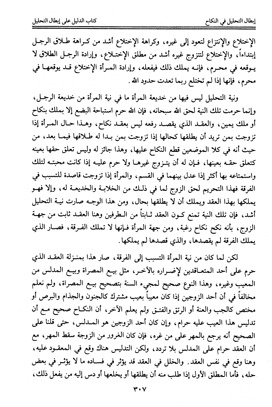 وَنِيَّةُ التَّحْلِيلِ لَيْسَ فِيهَا مِنْ خَدِيعَةِ الْمَرْأَةِ مَا فِي نِيَّةِ الْمَرْأَةِ مِنْ خَدِيعَةِ الرَّجُلِ، وَإِنَّمَا حُرِّمَتْ تِلْكَ النِّيَّةُ لِحَقِّ اللَّهِ سُبْحَانَهُ، فَإِنَّ اللَّهَ حَرَّمَ اسْتِبَاحَةَ الْبُضْعِ إلَّا بِمِلْكٍ بِنِكَاحٍ أَوْ مِلْكِ يَمِينٍ، وَالْعَقْدُ الَّذِي يَقْصِدُ رَفْعَهُ لَيْسَ بِعَقْدِ نِكَاحٍ، وَهَذَا حَالُ الْمَرْأَةِ إذَا تَزَوَّجَتْ بِمَنْ تُرِيدُ أَنْ يُطَلِّقَهَا كَحَالِهَا إذَا تَزَوَّجَتْ بِمَنْ بَدَا لَهُ طَلَاقُهَا فِيمَا بَعْدَ، مِنْ حَيْثُ إنَّهُ فِي كِلَا الْمَوْضِعَيْنِ قَطَعَ النِّكَاحَ عَلَيْهَا، وَهَذَا جَائِزٌ لَهُ وَلَيْسَ تَعَلُّقُ حَقِّهَا بِعَيْنِهِ كَتَعَلُّقِ حَقِّهِ بِعَيْنِهَا، فَإِنَّ لَهُ أَنْ يَتَزَوَّجَ غَيْرَهَا وَلَا حَرَامَ عَلَيْهِ إذَا كَانَتْ مَحَبَّتُهُ لِتِلْكَ وَاسْتِمْتَاعُهُ بِهَا أَكْثَرَ إذَا عَدَلَ بَيْنَهُمَا فِي الْقَسْمِ، وَالْمَرْأَةُ إذَا تَزَوَّجَتْ قَاصِدَةً لِلتَّسَبُّبِ فِي الْفُرْقَةِ فَهَذَا التَّحْرِيمُ لِحَقِّ الزَّوْجِ لِمَا فِي ذَلِكَ مِنْ الْخِلَابَةِ وَالْخَدِيعَةِ لَهُ، وَإِلَّا فَهُوَ يَمْلِكُهَا بِهَذَا الْعَقْدِ وَيَمْلِكُ أَنْ لَا يُطَلِّقَهَا بِحَالٍ، وَمِنْ هَذَا الْوَجْهِ صَارَتْ نِيَّةُ التَّحْلِيلِ أَشَدَّ، فَإِنَّ تِلْكَ النِّيَّةَ تَمْنَعُ كَوْنَ الْعَقْدِ ثَابِتًا مِنْ الطَّرَفَيْنِ وَهُنَا الْعَقْدُ ثَابِتٌ مِنْ جِهَةِ الزَّوْجِ، بِأَنَّهُ نَكَحَ نِكَاحَ رَغْبَةٍ، وَمِنْ جِهَةِ الْمَرْأَةِ فَإِنَّهَا لَا تَمْلِكُ الْفُرْقَةَ، فَصَارَ الَّذِي يَمْلِكُ الْفُرْقَةَ لَمْ يَقْصِدْهَا، وَاَلَّذِي قَصَدَهَا لَمْ يَمْلِكْهَا.