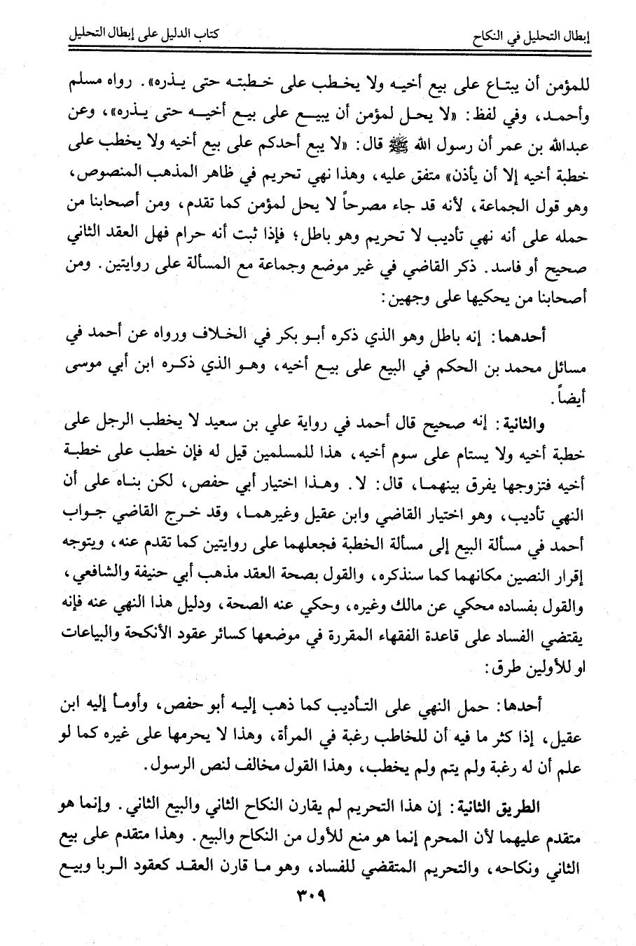 وَهَذَا اخْتِيَارُ أَبِي حَفْصٍ، لَكِنْ بَنَاهُ عَلَى أَنَّ النَّهْيَ تَأْدِيبٌ، وَهُوَ اخْتِيَارُ الْقَاضِي وَابْنِ عَقِيلٍ وَغَيْرِهِمَا، وَقَدْ خَرَّجَ الْقَاضِي جَوَابَ أَحْمَدَ فِي مَسْأَلَةِ الْبَيْعِ إلَى مَسْأَلَةِ الْخِطْبَةِ فَجَعَلَهُمَا عَلَى رِوَايَتَيْنِ كَمَا تَقَدَّمَ عَنْهُ، وَيَتَوَجَّهُ إقْرَارُ النَّصَّيْنِ مَكَانَهُمَا كَمَا سَنَذْكُرُهُ، وَالْقَوْلُ بِصِحَّةِ الْعَقْدِ مَذْهَبُ أَبِي حَنِيفَةَ وَالشَّافِعِيِّ، وَالْقَوْلُ بِفَسَادِهِ مَحْكِيٌّ عَنْ مَالِكٍ وَغَيْرِهِ، وَحُكِيَ عَنْهُ الصِّحَّةُ، وَدَلِيلُ هَذَا النَّهْيُ عَنْهُ فَإِنَّهُ يَقْتَضِي الْفَسَادَ عَلَى قَاعِدَةِ الْفُقَهَاءِ الْمُقَرَّرَةِ فِي مَوْضِعِهَا كَسَائِرِ عُقُودِ الْأَنْكِحَةِ وَالْبِيَاعَاتِ أَوْ لِلْأَوَّلِينَ طُرُقٌ: أَحَدُهَا: حَمْلُ النَّهْيِ عَلَى التَّأْدِيبِ كَمَا ذَهَبَ إلَيْهِ أَبُو حَفْصٍ، وَأَوْمَأَ إلَيْهِ ابْنُ عَقِيلٍ، إذَا كَثُرَ مَا فِيهِ أَنَّ لِلْخَاطِبِ رَغْبَةً فِي الْمَرْأَةِ، وَهَذَا لَا يُحَرِّمُهَا عَلَى غَيْرِهِ كَمَا لَوْ عَلِمَ أَنَّ لَهُ رَغْبَةً وَلَمْ يُتِمَّ وَلَمْ يَخْطُبْ، وَهَذَا الْقَوْلُ مُخَالِفٌ لِنَصِّ الرَّسُولِ.