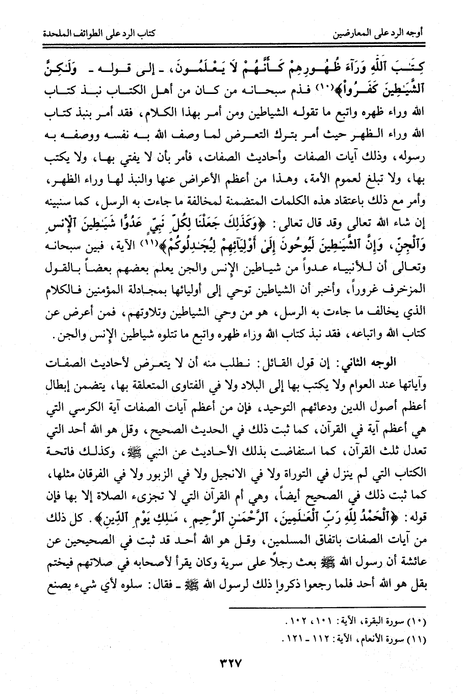 {وَلَمَّا جَاءَهُمْ رَسُولٌ مِنْ عِنْدِ اللَّهِ مُصَدِّقٌ لِمَا مَعَهُمْ نَبَذَ فَرِيقٌ مِنَ الَّذِينَ أُوتُوا الْكِتَابَ كِتَابَ اللَّهِ وَرَاءَ ظُهُورِهِمْ كَأَنَّهُمْ لا يَعْلَمُونَ} [البقرة: 101] ، - إلَى قَوْلِهِ - {وَلَكِنَّ الشَّيَاطِينَ كَفَرُوا} [البقرة: 102] فَذَمَّ سُبْحَانَهُ مَنْ كَانَ مِنْ أَهْلِ الْكِتَابِ نَبَذَ كِتَابَ اللَّهِ وَرَاءَ ظَهْرِهِ وَاتَّبَعَ مَا تَقُولُهُ الشَّيَاطِينُ، وَمَنْ أَمَرَ بِهَذَا الْكَلَامِ، فَقَدْ أَمَرَ بِنَبْذِ كِتَابِ اللَّهِ وَرَاءَ الظَّهْرِ حَيْثُ أَمَرَ بِتَرْكِ التَّعَرُّضِ لِمَا وَصَفَ اللَّهُ بِهِ نَفْسَهُ وَوَصَفَهُ بِهِ رَسُولُهُ، وَذَلِكَ آيَاتُ الصِّفَاتِ وَأَحَادِيثُ الصِّفَاتِ، فَأَمَرَ بِأَنْ لَا يُفْتَى بِهَا، وَلَا يُكْتَبَ بِهَا، وَلَا تُبَلَّغَ لِعُمُومِ الْأُمَّةِ، وَهَذَا مِنْ أَعْظَمِ الْإِعْرَاضِ عَنْهَا وَالنَّبْذِ لَهَا وَرَاءَ الظَّهْرِ، وَأَمْرٌ - مَعَ ذَلِكَ - بِاعْتِقَادِ هَذِهِ الْكَلِمَاتِ الْمُتَضَمِّنَةِ لِمُخَالَفَةِ مَا جَاءَتْ بِهِ الرُّسُلُ، كَمَا سَنُبَيِّنُهُ إنْ شَاءَ اللَّهُ تَعَالَى وَقَدْ قَالَ تَعَالَى: {وَكَذَلِكَ جَعَلْنَا لِكُلِّ نَبِيٍّ عَدُوًّا شَيَاطِينَ الإِنْسِ وَالْجِنِّ} [الأنعام: 112] ، {وَإِنَّ الشَّيَاطِينَ لَيُوحُونَ إِلَى أَوْلِيَائِهِمْ لِيُجَادِلُوكُمْ} [الأنعام: 121] الْآيَةَ، فَبَيَّنَ سُبْحَانَهُ وَتَعَالَى أَنَّ لِلْأَنْبِيَاءِ عَدُوًّا مِنْ شَيَاطِينِ الْإِنْسِ وَالْجِنِّ يَعْلَمُ بَعْضُهُمْ بَعْضًا بِالْقَوْلِ الْمُزَخْرَفِ غُرُورًا، وَأَخْبَرَ أَنَّ الشَّيَاطِينَ تُوحِي إلَى أَوْلِيَائِهَا بِمُجَادَلَةِ الْمُؤْمِنِينَ فَالْكَلَامُ الَّذِي يُخَالِفُ مَا جَاءَتْ بِهِ الرُّسُلُ، هُوَ مِنْ وَحْيِ الشَّيَاطِينِ وَتِلَاوَتِهِمْ، فَمَنْ أَعْرَضَ عَنْ كِتَابِ اللَّهِ وَاتِّبَاعِهِ، فَقَدْ نَبَذَ كِتَابَ اللَّهِ وَرَاءَ ظَهْرِهِ وَاتَّبَعَ مَا تَتْلُوهُ شَيَاطِينُ الْإِنْسِ وَالْجِنِّ.