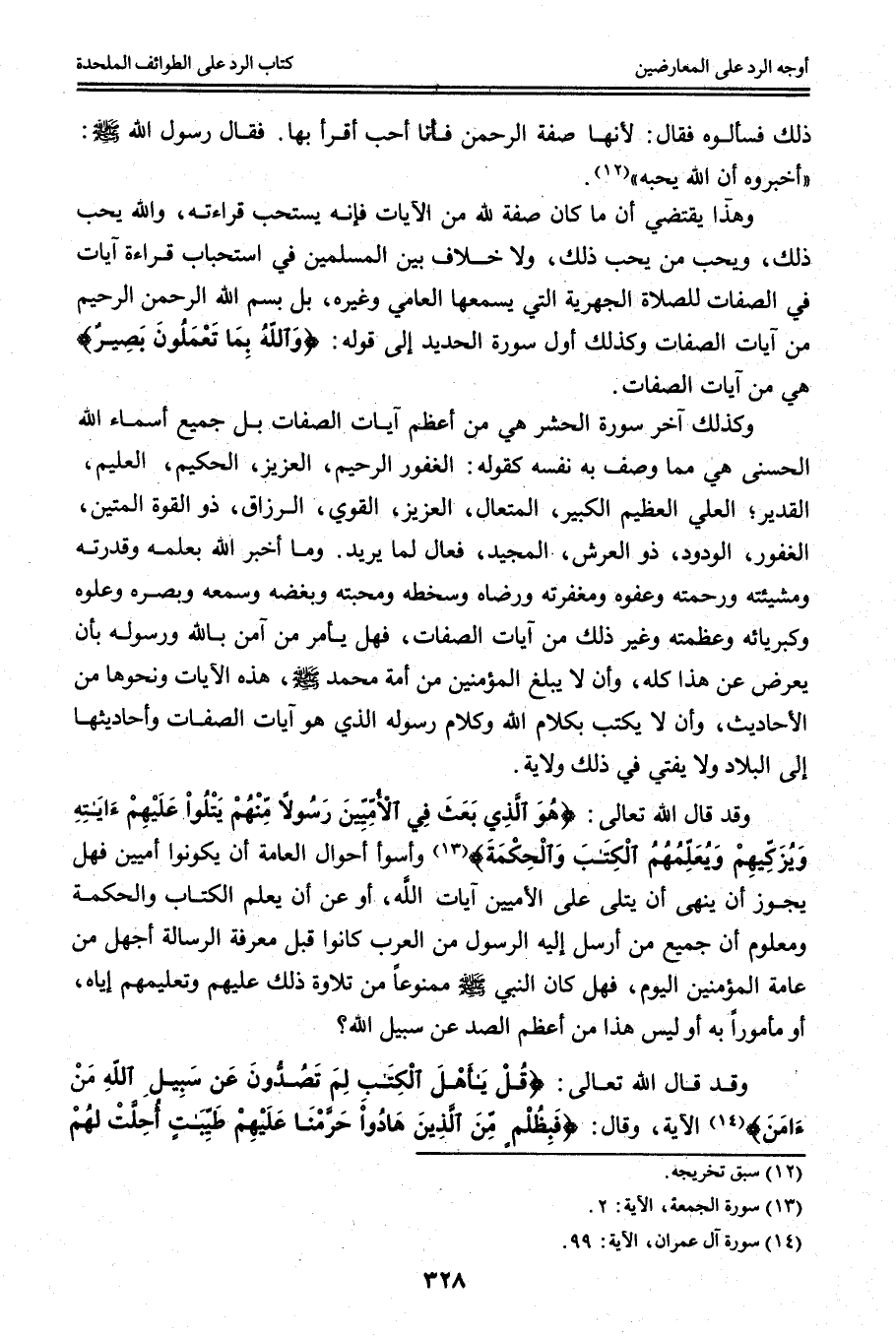 وَكَذَلِكَ آخِرُ سُورَةِ الْحَشْرِ هِيَ مِنْ أَعْظَمِ آيَاتِ الصِّفَاتِ بَلْ جَمِيعُ أَسْمَاءِ اللَّهِ الْحُسْنَى هِيَ مِمَّا وَصَفَ بِهِ نَفْسَهُ كَقَوْلِهِ: الْغَفُورُ الرَّحِيمُ، الْعَزِيزُ الْحَكِيمُ، الْعَلِيمُ الْقَدِيرُ؛ الْعَلِيُّ الْعَظِيمُ الْكَبِيرُ الْمُتَعَالِ، الْعَزِيزُ الْقَوِيُّ، الرَّزَّاقُ ذُو الْقُوَّةِ الْمَتِينُ، الْغَفُورُ الْوَدُودُ ذُو الْعَرْشِ الْمَجِيدِ فَعَّالٌ لِمَا يُرِيدُ. وَمَا أَخْبَرَ اللَّهُ بِعِلْمِهِ وَقُدْرَتِهِ وَمَشِيئَتِهِ وَرَحْمَتِهِ وَعَفْوِهِ وَمَغْفِرَتِهِ وَرِضَاهُ وَسَخَطِهِ وَمَحَبَّتِهِ وَبُغْضِهِ وَسَمْعِهِ وَبَصَرِهِ وَعُلُوِّهِ وَكِبْرِيَائِهِ وَعَظَمَتِهِ وَغَيْرِ ذَلِكَ مِنْ آيَاتِ الصِّفَاتِ، فَهَلْ يَأْمُر مَنْ آمَنَ بِاَللَّهِ وَرَسُولِهِ بِأَنْ يُعْرَضَ عَنْ هَذَا كُلِّهِ، وَأَنْ لَا يُبَلِّغَ الْمُؤْمِنِينَ مِنْ أُمَّةِ مُحَمَّدٍ - صَلَّى اللَّهُ عَلَيْهِ وَسَلَّمَ - هَذِهِ الْآيَاتِ وَنَحْوَهَا مِنْ الْأَحَادِيثِ، وَأَنْ لَا يَكْتُبَ بِكَلَامِ اللَّهِ وَكَلَامِ رَسُولِهِ الَّذِي هُوَ آيَاتُ الصِّفَاتِ وَأَحَادِيثُهَا إلَى الْبِلَادِ وَلَا يُفْتِي فِي ذَلِكَ وِلَايَةً.