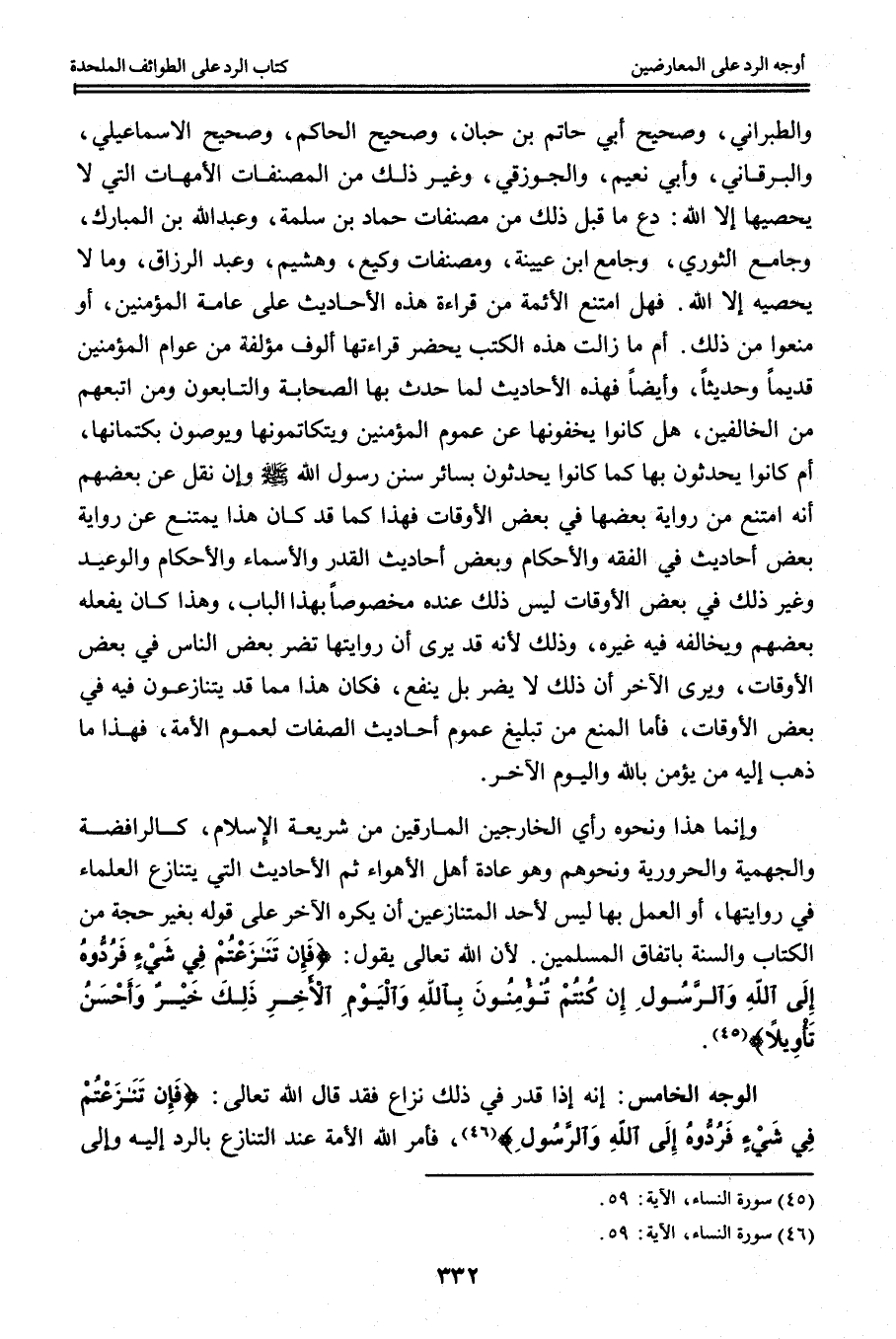 فَأَمَّا الْمَنْعُ مِنْ تَبْلِيغِ عُمُومِ أَحَادِيثِ الصِّفَاتِ لِعُمُومِ الْأُمَّةِ، فَهَذَا مَا ذَهَبَ إلَيْهِ مَنْ يُؤْمِنُ بِاَللَّهِ وَالْيَوْمِ الْآخِرِ. وَإِنَّمَا هَذَا وَنَحْوُهُ رَأْيُ الْخَارِجِينَ الْمَارِقِينَ مِنْ شَرِيعَةِ الْإِسْلَامِ، كَالرَّافِضَةِ وَالْجَهْمِيَّةِ وَالْحَرُورِيَّةِ وَنَحْوِهِمْ وَهُوَ عَادَةُ أَهْلِ الْأَهْوَاءِ ثُمَّ الْأَحَادِيثُ الَّتِي يَتَنَازَعُ الْعُلَمَاءُ فِي رِوَايَتِهَا، أَوْ الْعَمَلُ بِهَا لَيْسَ لِأَحَدِ الْمُتَنَازِعِينَ أَنْ يُكْرِهَ الْآخَرَ عَلَى قَوْلِهِ بِغَيْرِ حُجَّةٍ مِنْ الْكِتَابِ وَالسُّنَّةِ بِاتِّفَاقِ الْمُسْلِمِينَ. لِأَنَّ اللَّهَ تَعَالَى يَقُولُ: {فَإِنْ تَنَازَعْتُمْ فِي شَيْءٍ فَرُدُّوهُ إِلَى اللَّهِ وَالرَّسُولِ إِنْ كُنْتُمْ تُؤْمِنُونَ بِاللَّهِ وَالْيَوْمِ الآخِرِ ذَلِكَ خَيْرٌ وَأَحْسَنُ تَأْوِيلا} [النساء: 59] .