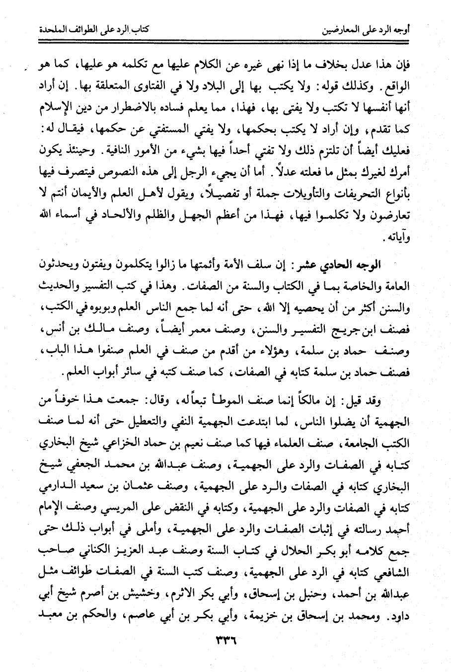 الْوَجْهُ الْحَادِيَ عَشَرَ: أَنَّ سَلَفَ الْأُمَّةِ وَأَئِمَّتَهَا مَا زَالُوا يَتَكَلَّمُونَ وَيُفْتُونَ وَيُحَدِّثُونَ الْعَامَّةَ وَالْخَاصَّةَ بِمَا فِي الْكِتَابِ وَالسُّنَّةِ مِنْ الصِّفَاتِ، وَهَذَا فِي كُتُبِ التَّفْسِيرِ وَالْحَدِيثِ وَالسُّنَنِ أَكْثَرُ مِنْ أَنْ يُحْصِيَهُ إلَّا اللَّهُ، حَتَّى إنَّهُ لَمَّا جَمَعَ النَّاسُ الْعِلْمَ وَبَوَّبُوهُ فِي الْكُتُبِ، فَصَنَّفَ ابْنُ جُرَيْجٍ التَّفْسِيرَ وَالسُّنَنَ، وَصَنَّفَ مَعْمَرٌ أَيْضًا، وَصَنَّفَ مَالِكُ بْنُ أَنَسٍ، وَصَنَّفَ حَمَّادُ بْنُ سَلَمَةَ، وَهَؤُلَاءِ مِنْ أَقْدَمِ مَنْ صَنَّفَ فِي الْعِلْمِ صَنَّفُوا هَذَا الْبَابَ، فَصَنَّفَ حَمَّادُ بْنُ سَلَمَةَ كِتَابَهُ فِي الصِّفَاتِ، كَمَا صَنَّفَ كُتُبَهُ فِي سَائِرِ أَبْوَابِ الْعِلْمِ.