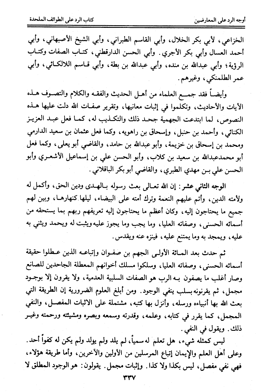 وَأَيْضًا فَقَدْ جَمَعَ الْعُلَمَاءُ مِنْ أَهْلِ الْحَدِيثِ وَالْفِقْهِ وَالْكَلَامِ وَالتَّصَوُّفِ هَذِهِ الْآيَاتِ وَالْأَحَادِيثَ، وَتَكَلَّمُوا فِي إثْبَاتِ مَعَانِيهَا، وَتَقْرِيرُ صِفَاتِ اللَّهِ دَلَّتْ عَلَيْهَا هَذِهِ النُّصُوصُ، لَمَّا ابْتَدَعَتْ الْجَهْمِيَّةُ جَحْدَ ذَلِكَ وَالتَّكْذِيبَ لَهُ، كَمَا فَعَلَ عَبْدُ الْعَزِيزِ الْكِنَانِيُّ، وَأَحْمَدُ بْنُ حَنْبَلٍ، وَإِسْحَاقُ بْنُ رَاهْوَيْهِ، وَكَمَا فَعَلَ عُثْمَانُ بْنُ سَعِيدٍ الدَّارِمِيُّ وَمُحَمَّدُ بْنُ إِسْحَاقَ بْنِ خُزَيْمَةَ، وَأَبُو عَبْدِ اللَّهِ بْنُ حَامِدٍ، وَالْقَاضِي أَبُو يَعْلَى، وَكَمَا فَعَلَ أَبُو مُحَمَّدٍ عَبْدُ اللَّهِ بْنُ سَعِيدِ بْنِ كِلَابٍ، وَأَبُو الْحَسَنِ عَلِيُّ بْنُ إسْمَاعِيلَ الْأَشْعَرِيُّ وَأَبُو الْحَسَنِ عَلِيُّ بْنُ مَهْدِيٍّ الطَّبَرِيُّ، وَالْقَاضِي أَبُو بَكْرٍ الْبَاقِلَّانِيُّ.