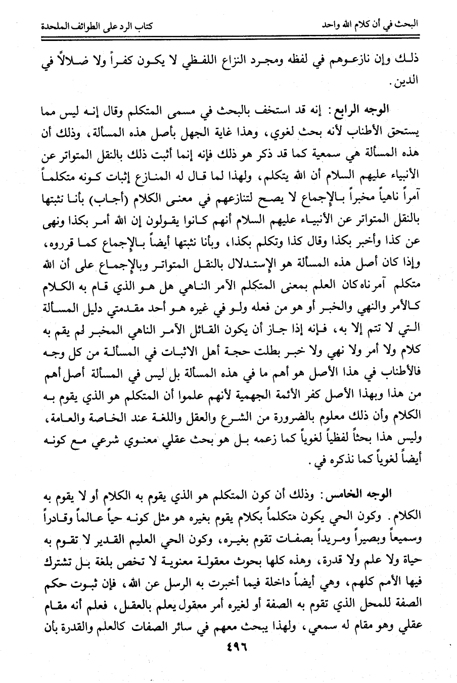 الْوَجْهُ الرَّابِعُ: أَنَّهُ قَدْ اسْتَخَفَّ بِالْبَحْثِ فِي مُسَمَّى الْمُتَكَلِّمِ وَقَالَ إنَّهُ لَيْسَ مِمَّا يَسْتَحِقُّ الْإِطْنَابَ لِأَنَّهُ بَحْثٌ لُغَوِيٌّ، وَهَذَا غَايَةُ الْجَهْلِ بِأَصْلِ هَذِهِ الْمَسْأَلَةِ، وَذَلِكَ أَنَّ هَذِهِ الْمَسْأَلَةَ هِيَ سَمْعِيَّةٌ كَمَا قَدْ ذَكَرَ هُوَ ذَلِكَ فَإِنَّهُ إنَّمَا أَثْبَتَ ذَلِكَ بِالنَّقْلِ، الْمُتَوَاتِرِ عَنْ الْأَنْبِيَاءِ - عَلَيْهِمْ السَّلَامُ - أَنَّ اللَّهَ يَتَكَلَّمُ، وَلِهَذَا لَمَّا قَالَ لَهُ الْمُنَازِعُ إثْبَاتَ كَوْنِهِ مُتَكَلِّمًا أَمْرًا نَاهِيًا مُخْبِرًا بِالْإِجْمَاعِ لَا يَصِحُّ لِتَنَازُعِهِمْ فِي مَعْنَى الْكَلَامِ