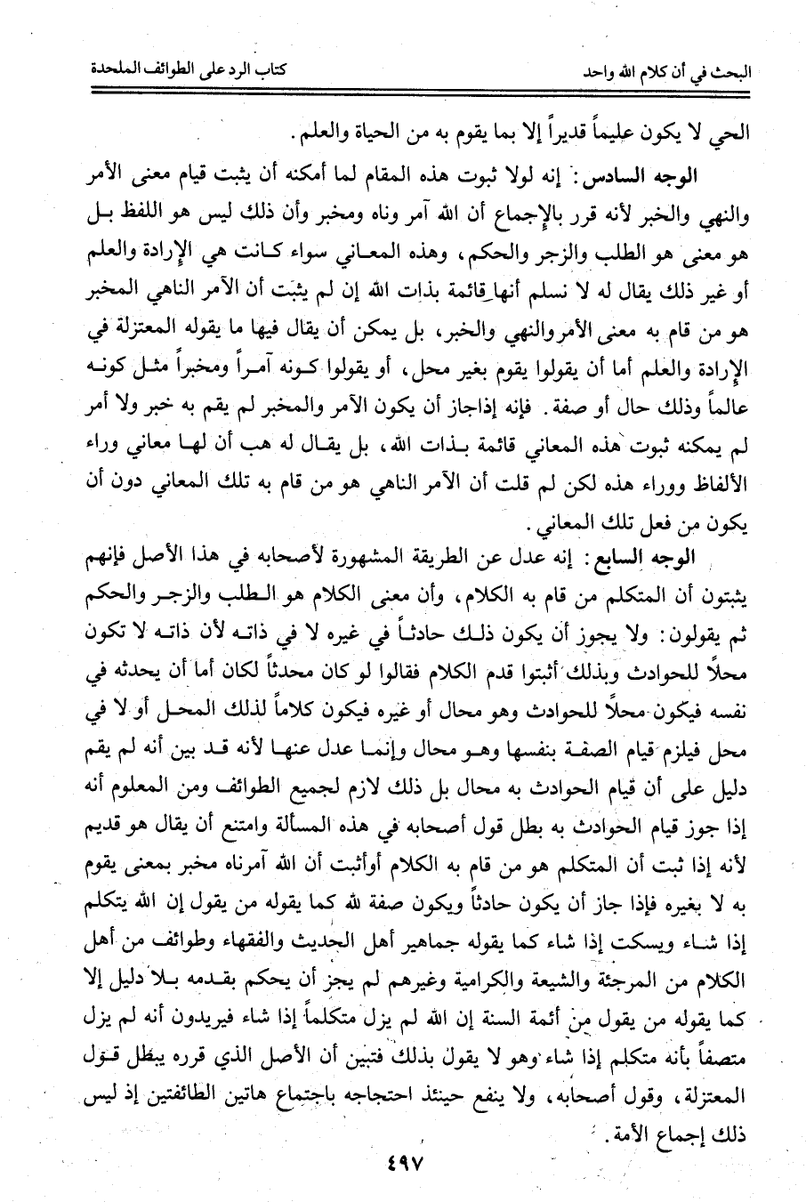 الْوَجْهُ السَّادِسُ: إنَّهُ لَوْلَا ثُبُوتُ هَذَا الْمَقَامِ لَمَا أَمْكَنَهُ أَنْ يُثْبِتَ قِيَامَ مَعْنَى الْأَمْرِ وَالنَّهْيِ وَالْخَبَرِ لِأَنَّهُ قَرَّرَ بِالْإِجْمَاعِ أَنَّ اللَّهَ آمِرٌ وَنَاهٍ وَمُخْبِرٌ وَأَنَّ ذَلِكَ لَيْسَ هُوَ اللَّفْظَ بَلْ هُوَ مَعْنًى هُوَ الطَّلَبُ وَالزَّجْرُ وَالْحُكْمُ، وَهَذِهِ الْمَعَانِي سَوَاءٌ كَانَتْ هِيَ الْإِرَادَةَ وَالْعِلْمَ أَوْ غَيْرَ ذَلِكَ يُقَالُ لَهُ لَا نُسَلِّمُ أَنَّهَا قَائِمَةٌ بِذَاتِ اللَّهِ إنْ لَمْ يَثْبُتْ أَنَّ الْآمِرَ النَّاهِيَ الْمُخْبِرَ هُوَ مَنْ قَامَ بِهِ مَعْنَى الْأَمْرِ وَالنَّهْيِ وَالْخَبَرِ، بَلْ يُمْكِنُ أَنْ يُقَالَ فِيهَا مَا يَقُولُهُ الْمُعْتَزِلَةُ فِي الْإِرَادَةِ وَالْعِلْمِ أَمَّا أَنْ يَقُولُوا يَقُومُ بِغَيْرِ مَحِلٍّ، أَوْ يَقُولُوا كَوْنَهُ آمِرًا وَمُخْبِرًا مِثْلُ كَوْنِهِ عَالِمًا وَذَلِكَ حَالٌ أَوْ صِفَةٌ. فَإِنَّهُ إذَا جَازَ أَنْ يَكُونَ الْآمِرُ وَالْمُخْبِرُ لَمْ يَقُمْ بِهِ خَبَرٌ وَلَا أَمْرٌ لَمْ يُمْكِنْهُ ثُبُوتُ هَذِهِ الْمَعَانِي قَائِمَةً بِذَاتِ اللَّهِ، بَلْ يُقَالُ لَهُ هَبْ أَنَّ لَهَا مَعَانِيَ وَرَاءَ الْأَلْفَاظِ وَوَرَاءَ هَذِهِ لَكِنْ لِمَ قُلْتَ أَنَّ الْآمِرَ النَّاهِيَ هُوَ مَنْ قَامَ بِهِ تِلْكَ الْمَعَانِي دُونَ أَنْ يَكُونَ مَنْ فَعَلَ تِلْكَ الْمَعَانِيَ.