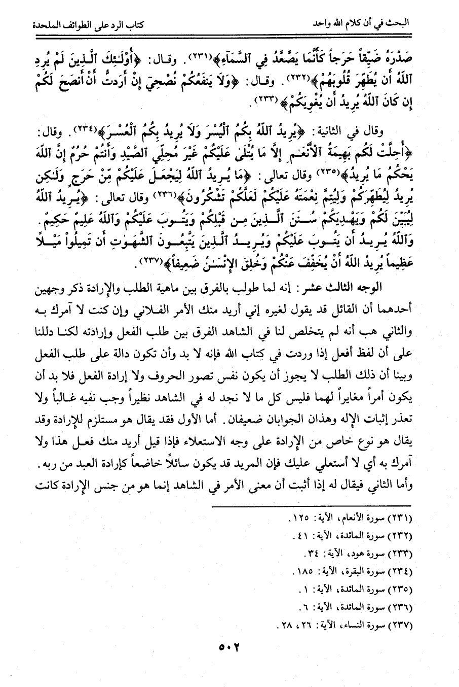 الْوَجْهُ الثَّالِثَ عَشَرَ: إنَّهُ لَمَّا طُولِبَ بِالْفَرْقِ بَيْنَ مَاهِيَّةِ الطَّلَبِ وَالْإِرَادَةِ ذَكَرَ وَجْهَيْنِ أَحَدَهُمَا أَنَّ الْقَائِلَ قَدْ يَقُولُ لِغَيْرِهِ إنِّي أُرِيدُ مِنْك الْأَمْرَ الْفُلَانِيَّ وَإِنْ كُنْت لَا آمُرُك بِهِ وَالثَّانِي هَبْ أَنَّهُ لَمْ يَتَخَلَّصْ لَنَا فِي الشَّاهِدِ الْفَرْقُ بَيْنَ طَلَبِ الْفِعْلِ وَإِرَادَتِهِ لَكِنَّا دَلَّلْنَا عَلَى أَنَّ لَفْظَ افْعَلْ إذَا وَرَدَتْ فِي كِتَابِ اللَّهِ فَإِنَّهُ لَا بُدَّ وَأَنْ تَكُونَ دَالَّةً عَلَى طَلَبِ الْفِعْلِ وَبَيَّنَّا أَنَّ ذَلِكَ الطَّلَبَ لَا يَجُوزُ أَنْ يَكُونَ نَفْسَ تَصَوُّرِ الْحُرُوفِ وَلَا إرَادَةِ الْفِعْلِ فَلَا بُدَّ أَنْ يَكُونَ أَمْرًا مُغَايِرًا لَهُمَا فَلَيْسَ كُلُّ مَا لَا نَجِدُ لَهُ فِي الشَّاهِدِ نَظِيرًا وَجَبَ نَفْيُهُ غَالِبًا وَلَا تَعَذَّرَ إثْبَاتُ الْإِلَهِ وَهَذَانِ الْجَوَابَانِ ضَعِيفَانِ. أَمَّا الْأَوَّلُ فَقَدْ يُقَالُ هُوَ مُسْتَلْزِمٌ لِلْإِرَادَةِ وَقَدْ يُقَالُ هُوَ نَوْعٌ خَاصٌّ، مِنْ الْإِرَادَةِ عَلَى وَجْهِ الِاسْتِعْلَاءِ فَإِذَا قِيلَ أُرِيدُ مِنْك فِعْلَ هَذَا وَلَا آمُرُك بِهِ أَيْ لَا أَسْتَعْلِي عَلَيْك فَإِنَّ الْمُرِيدَ قَدْ يَكُونُ سَائِلًا خَاضِعًا كَإِرَادَةِ الْعَبْدِ مِنْ رَبِّهِ.