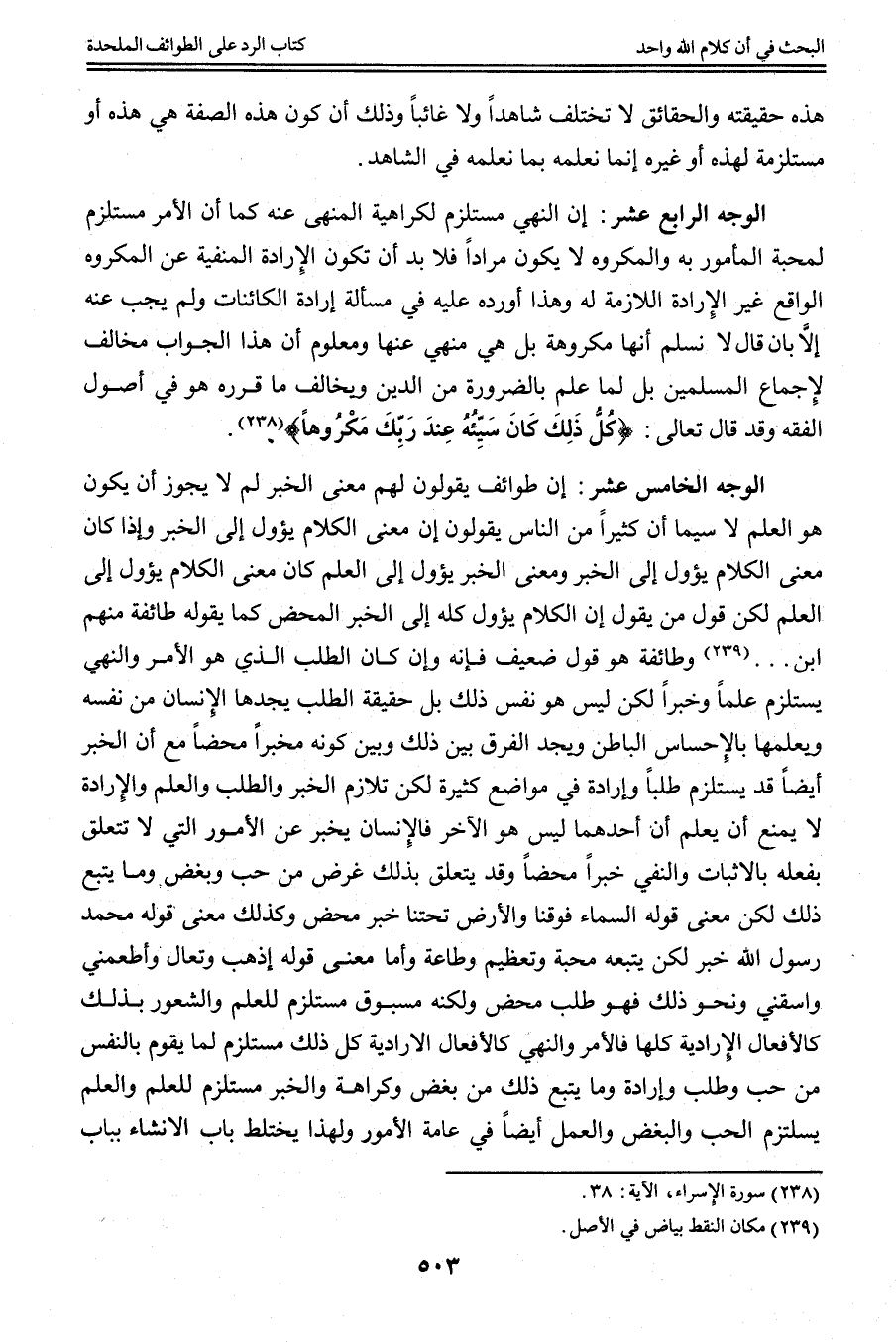 الْوَجْهُ الرَّابِعَ عَشَرَ: إنَّ النَّهْيَ مُسْتَلْزِمٌ لِكَرَاهِيَةِ الْمَنْهِيِّ عَنْهُ كَمَا أَنَّ الْأَمْرَ مُسْتَلْزِمٌ لِمَحَبَّةِ الْمَأْمُورِ بِهِ وَالْمَكْرُوهُ لَا يَكُون مُرَادًا فَلَا بُدَّ أَنْ تَكُونَ الْإِرَادَةُ الْمَنْفِيَّةُ عَنْ الْمَكْرُوهِ الْوَاقِعِ غَيْرَ الْإِرَادَةِ اللَّازِمَةِ لَهُ وَهَذَا أَوْرَدَهُ عَلَيْهِ فِي مَسْأَلَةِ إرَادَةِ الْكَائِنَاتِ وَلَمْ يُجِبْ عَنْهُ إلَّا بِأَنْ قَالَ لَا نُسَلِّمُ أَنَّهَا مَكْرُوهَةٌ بَلْ هِيَ مَنْهِيٌّ عَنْهَا وَمَعْلُومٌ أَنَّ هَذَا الْجَوَابَ مُخَالِفٌ لِإِجْمَاعِ الْمُسْلِمِينَ بَلْ لِمَا عُلِمَ بِالضَّرُورَةِ مِنْ الدِّينِ وَيُخَالِفُ مَا قَرَّرَهُ هُوَ فِي أُصُولِ الْفِقْهِ وَقَدْ قَالَ تَعَالَى: {كُلُّ ذَلِكَ كَانَ سَيِّئُهُ عِنْدَ رَبِّكَ مَكْرُوهًا} [الإسراء: 38] .