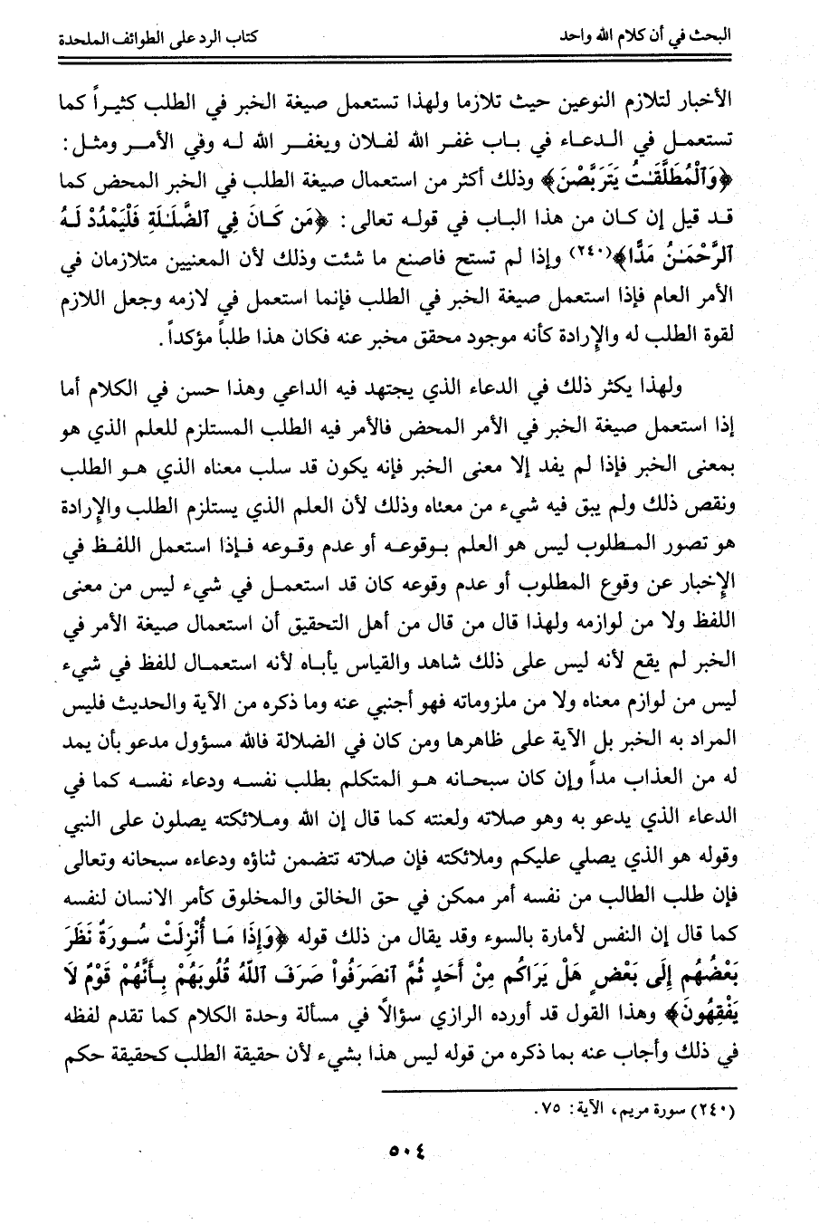 وَلِهَذَا يَكْثُرُ ذَلِكَ فِي الدُّعَاءِ الَّذِي يَجْتَهِدُ فِيهِ الدَّاعِي وَهَذَا حَسَنٌ فِي الْكَلَامِ أَمَّا إذَا اسْتَعْمَلَ صِيغَةَ الْخَبَرِ فِي الْأَمْرِ الْمَحْضِ فَالْأَمْرُ فِيهِ الطَّلَبُ الْمُسْتَلْزِمُ لِلْعِلْمِ الَّذِي هُوَ بِمَعْنَى الْخَبَرِ فَإِذَا لَمْ يُفِدْ إلَّا مَعْنَى الْخَبَرِ فَإِنَّهُ يَكُونُ قَدْ سَلَبَ مَعْنَاهُ الَّذِي هُوَ الطَّلَبُ وَنَقَصَ ذَلِكَ وَلَمْ يَبْقَ فِيهِ شَيْءٌ مِنْ مَعْنَاهُ وَذَلِكَ لِأَنَّ الْعِلْمَ الَّذِي يَسْتَلْزِمُ الطَّلَبَ وَالْإِرَادَةَ هُوَ تَصَوُّرُ الْمَطْلُوبُ لَيْسَ هُوَ الْعِلْمُ بِوُقُوعِهِ أَوْ عَدَمِ وُقُوعِهِ فَإِذَا اسْتَعْمَلَ اللَّفْظَ فِي الْإِخْبَارِ عَنْ وُقُوعِ الْمَطْلُوبِ أَوْ عَدَمِ وُقُوعِهِ كَانَ قَدْ اُسْتُعْمِلَ فِي شَيْءٍ لَيْسَ مِنْ مَعْنَى اللَّفْظِ وَلَا مِنْ لَوَازِمِهِ وَلِهَذَا قَالَ مَنْ قَالَ مِنْ أَهْلِ التَّحْقِيقِ أَنَّ اسْتِعْمَالَ صِيغَةِ الْأَمْرِ فِي الْخَبَرِ لَمْ يَقَعْ لِأَنَّهُ لَيْسَ عَلَى ذَلِكَ شَاهِدٌ وَالْقِيَاسُ يَأْبَاهُ لِأَنَّهُ اسْتِعْمَالٌ لِلَّفْظِ فِي شَيْءٍ لَيْسَ مِنْ لَوَازِمِ مَعْنَاهُ وَلَا مِنْ مَلْزُومَاتِهِ فَهُوَ أَجْنَبِيٌّ عَنْهُ وَمَا ذَكَرَهُ مِنْ الْآيَةِ وَالْحَدِيثِ فَلَيْسَ الْمُرَادُ بِهِ الْخَبَرَ بَلْ الْآيَةُ عَلَى ظَاهِرِهَا وَمَنْ كَانَ فِي الضَّلَالَةِ فَاَللَّهُ مَسْئُولٌ مَدْعُوٌّ بِأَنْ يَمُدَّ لَهُ مِنْ الْعَذَابِ مَدًّا وَإِنْ كَانَ سُبْحَانَهُ هُوَ الْمُتَكَلِّمُ بِطَلَبِ نَفْسِهِ وَدُعَاءِ نَفْسِهِ كَمَا فِي الدُّعَاءِ الَّذِي يَدْعُو بِهِ وَهُوَ صَلَاتُهُ وَلَعْنَتُهُ كَمَا قَالَ {إِنَّ اللَّهَ وَمَلائِكَتَهُ يُصَلُّونَ عَلَى النَّبِيِّ} [الأحزاب: 56] وَقَوْلُهُ {هُوَ الَّذِي يُصَلِّي عَلَيْكُمْ وَمَلائِكَتُهُ} [الأحزاب: 43] فَإِنَّ صَلَاتَهُ تَتَضَمَّنُ ثَنَاءَهُ وَدُعَاءَهُ سُبْحَانَهُ وَتَعَالَى فَإِنَّ طَلَبَ الطَّالِبِ مِنْ نَفْسِهِ أَمْرٌ مُمْكِنٌ فِي حَقِّ الْخَالِقِ وَالْمَخْلُوقِ كَأَمْرِ الْإِنْسَانِ لِنَفْسِهِ كَمَا قَالَ {إِنَّ النَّفْسَ لأَمَّارَةٌ بِالسُّوءِ} [يوسف: 53] وَقَدْ يُقَالُ مِنْ ذَلِكَ قَوْلُهُ {وَإِذَا مَا أُنْزِلَتْ سُورَةٌ نَظَرَ بَعْضُهُمْ إِلَى بَعْضٍ هَلْ يَرَاكُمْ مِنْ أَحَدٍ ثُمَّ انْصَرَفُوا صَرَفَ اللَّهُ قُلُوبَهُمْ بِأَنَّهُمْ قَوْمٌ لا يَفْقَهُونَ} [التوبة: 127] وَهَذَا الْقَوْلُ قَدْ أَوْرَدَهُ الرَّازِيّ سُؤَالًا فِي مَسْأَلَةٍ وَاحِدَةٍ الْكَلَامُ كَمَا تَقَدَّمَ لَفْظُهُ فِي ذَلِكَ