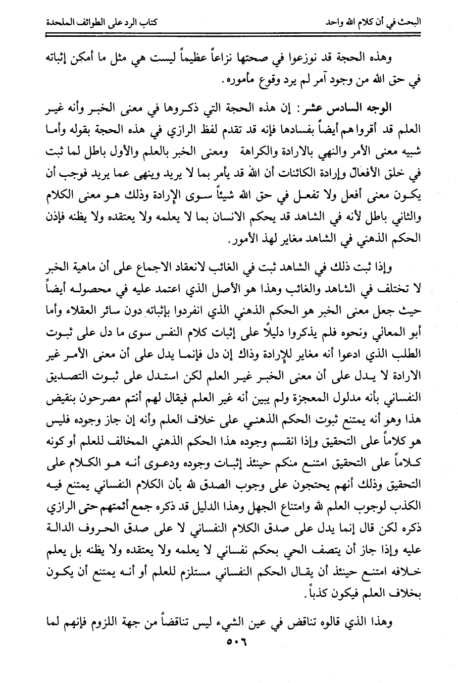 الْوَجْهُ السَّادِسَ عَشَرَ: إنَّ هَذِهِ الْحُجَّةَ الَّتِي ذَكَرُوهَا فِي مَعْنَى الْخَبَرِ وَإِنَّهُ غَيْرُ الْعِلْمِ قَدْ أَقَرُّوا هُمْ أَيْضًا بِفَسَادِهَا فَإِنَّهُ قَدْ تَقَدَّمَ لَفْظُ الرَّازِيّ فِي هَذِهِ الْحُجَّةِ بِقَوْلِهِ وَأَمَّا شَبِيهُ مَعْنَى الْأَمْرِ وَالنَّهْيِ، بِالْإِرَادَةِ وَالْكَرَاهَةِ وَمَعْنَى الْخَبَرِ بِالْعِلْمِ وَالْأَوَّلُ بَاطِلٌ لِمَا ثَبَتَ فِي خَلْقِ الْأَفْعَالِ وَإِرَادَةِ الْكَائِنَاتِ أَنَّ اللَّهَ قَدْ يَأْمُرُ بِمَا لَا يُرِيدُ وَيَنْهَى عَمَّا يُرِيدُ فَوَجَبَ أَنْ يَكُونَ مَعْنَى افْعَلْ وَلَا تَفْعَلْ فِي حَقِّ اللَّهِ شَيْئًا سِوَى الْإِرَادَةِ وَذَلِكَ هُوَ مَعْنَى الْكَلَامِ وَالثَّانِي بَاطِلٌ لِأَنَّهُ فِي الشَّاهِدِ قَدْ يَحْكُمُ الْإِنْسَانُ بِمَا لَا يَعْلَمُهُ وَلَا يَعْتَقِدُهُ وَلَا يَظُنُّهُ فَإِذَنْ الْحُكْمِ الذِّهْنِيِّ فِي الشَّاهِدِ مُغَايِرٌ لِهَذِهِ الْأُمُورِ.