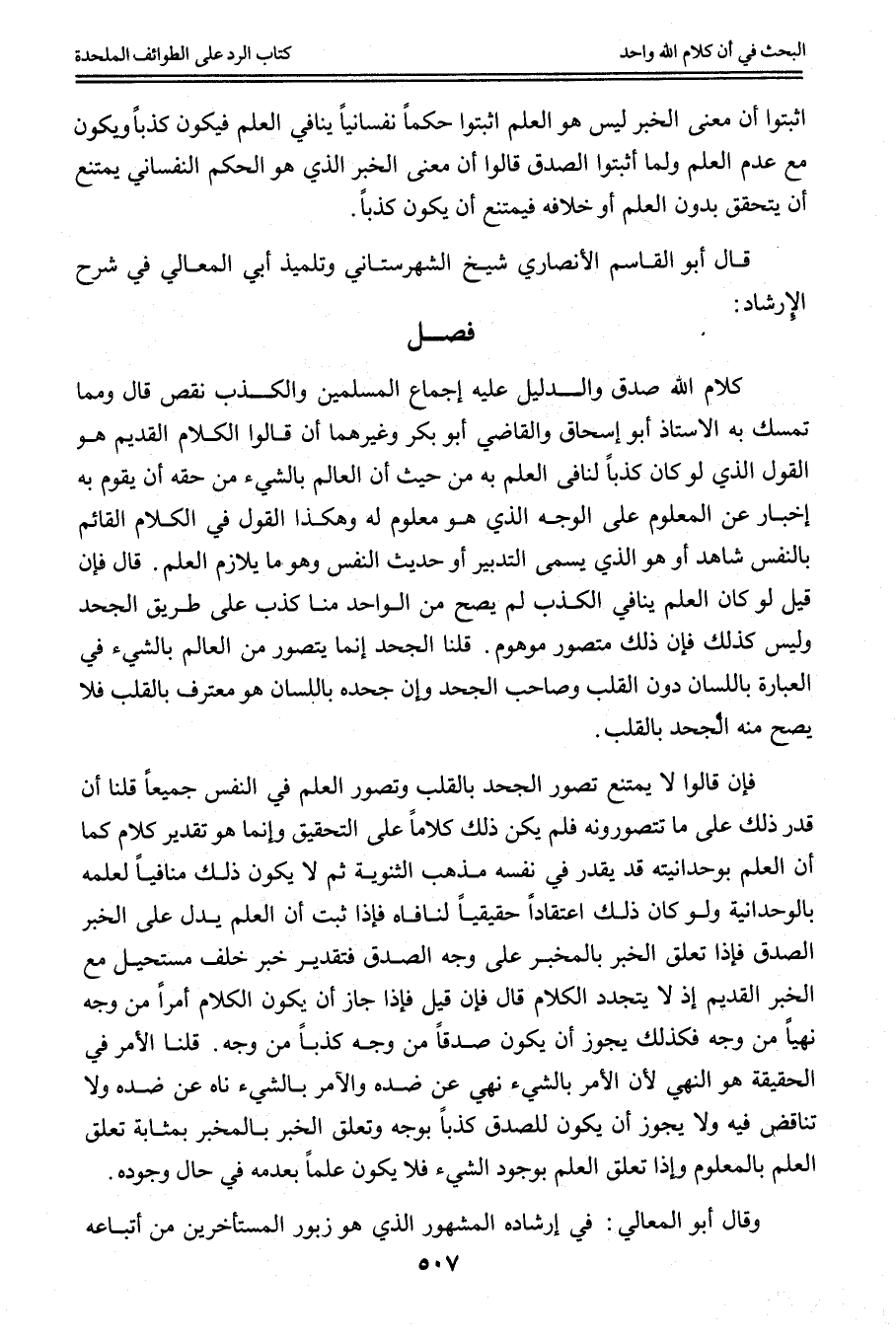 قَالَ أَبُو الْقَاسِمِ الْأَنْصَارِيُّ شَيْخُ الشِّهْرِسْتَانِيّ وَتِلْمِيذُ أَبِي الْمَعَالِي فِي شَرْحِ الْإِرْشَادِ فَصْلٌ كَلَامُ اللَّهِ صِدْقٌ وَالدَّلِيلُ عَلَيْهِ إجْمَاعُ الْمُسْلِمِينَ وَالْكَذِبُ نَقْصٌ قَالَ وَمِمَّا تَمَسَّكَ بِهِ الْأُسْتَاذُ أَبُو إِسْحَاقَ وَالْقَاضِي أَبُو بَكْرٍ وَغَيْرُهُمَا أَنْ قَالُوا الْكَلَامُ الْقَدِيمُ هُوَ الْقَوْلُ الَّذِي لَوْ كَانَ كَذِبًا لَنَافَى الْعِلْمَ بِهِ مِنْ حَيْثُ إنَّ الْعَالِمَ بِالشَّيْءِ مِنْ حَقِّهِ أَنْ يَقُومَ بِهِ إخْبَارٌ عَنْ الْمَعْلُومِ عَلَى الْوَجْهِ الَّذِي هُوَ مَعْلُومٌ لَهُ وَهَكَذَا الْقَوْلُ فِي الْكَلَامِ الْقَائِمِ بِالنَّفْسِ شَاهِدٌ أَوْ هُوَ الَّذِي يُسَمَّى التَّدْبِيرَ أَوْ حَدِيثَ النَّفْسِ وَهُوَ مَا يُلَازِمُ الْعِلْمَ. قَالَ فَإِنْ قِيلَ لَوْ كَانَ الْعِلْمُ يُنَافِي الْكَذِبَ لَمْ يَصِحَّ مِنْ الْوَاحِدِ مِنَّا كَذِبٌ عَلَى طَرِيقِ الْجَحْدِ وَلَيْسَ كَذَلِكَ فَإِنَّ ذَلِكَ مُتَصَوَّرٌ مَوْهُومٌ. قُلْنَا الْجَحْدُ إنَّمَا يُتَصَوَّرُ مِنْ الْعَالِمِ بِالشَّيْءِ فِي الْعِبَارَةِ بِاللِّسَانِ دُونَ الْقَلْبِ وَصَاحِبُ الْجَحْدِ وَإِنْ جَحَدَهُ بِاللِّسَانِ هُوَ مُعْتَرِفٌ بِالْقَلْبِ فَلَا يَصِحُّ مِنْهُ الْجَحْدُ بِالْقَلْبِ.