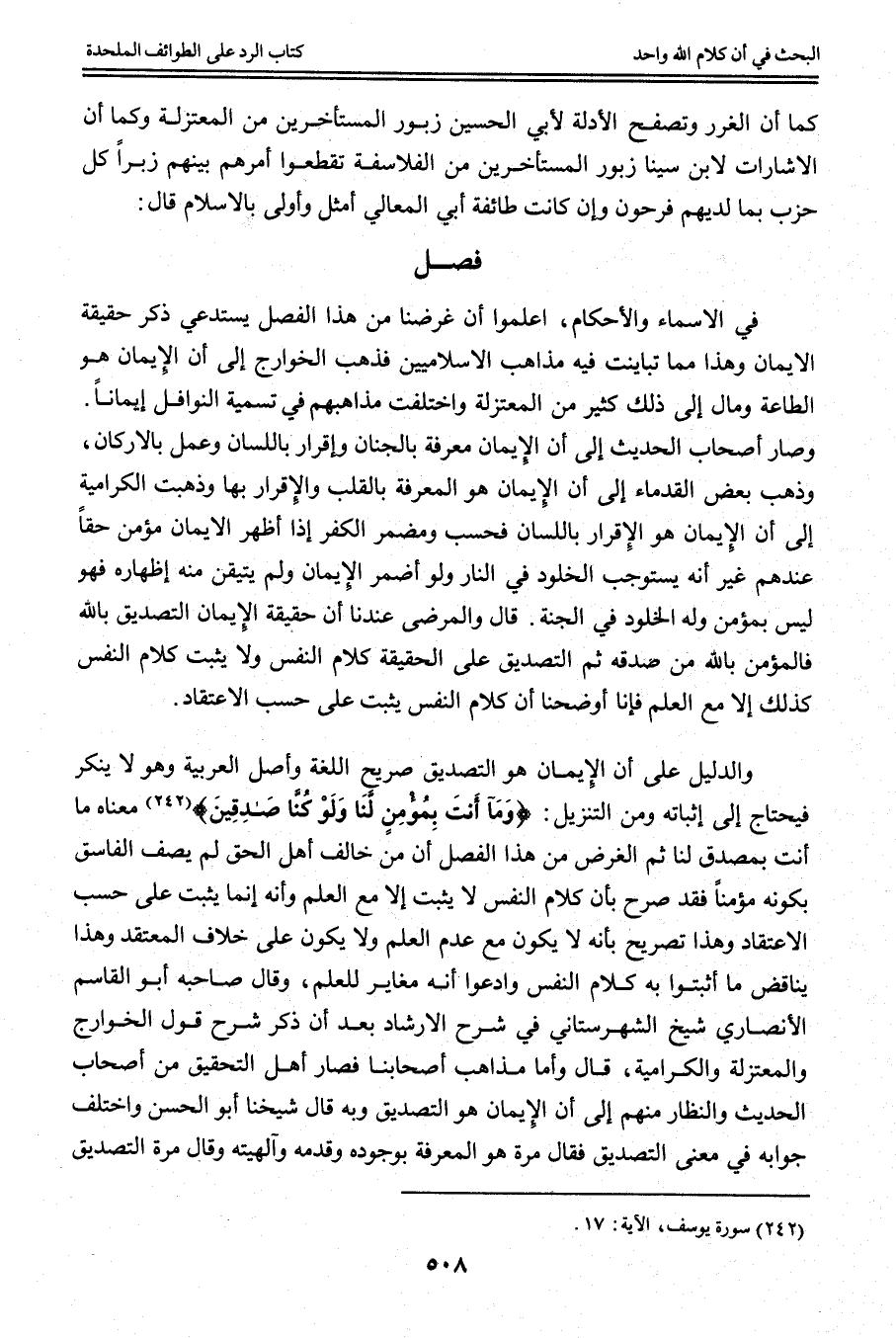 وَالدَّلِيلُ عَلَى أَنَّ الْإِيمَانَ هُوَ التَّصْدِيقُ صَرِيحُ اللُّغَةِ وَأَصْلُ الْعَرَبِيَّةِ وَهُوَ لَا يُنْكَرُ فَيَحْتَاجُ إلَى إثْبَاتِهِ وَمِنْ التَّنْزِيلِ: {وَمَا أَنْتَ بِمُؤْمِنٍ لَنَا وَلَوْ كُنَّا صَادِقِينَ} [يوسف: 17] مَعْنَاهُ مَا أَنْتَ بِمُصَدِّقٍ لَنَا ثُمَّ الْغَرَضُ مِنْ هَذَا الْفَصْلِ أَنَّ مَنْ خَالَفَ أَهْلَ الْحَقِّ لَمْ يَصِفْ الْفَاسِقَ بِكَوْنِهِ مُؤْمِنًا فَقَدْ صَرَّحَ بِأَنَّ كَلَامَ النَّفْسِ لَا يَثْبُتُ إلَّا مَعَ الْعِلْمِ وَأَنَّهُ إنَّمَا يَثْبُتُ عَلَى حَسَبِ الِاعْتِقَادِ وَهَذَا تَصْرِيحٌ بِأَنَّهُ لَا يَكُونُ مَعَ عَدَمِ الْعِلْمِ وَلَا يَكُونُ عَلَى خِلَافِ الْمُعْتَقَدِ وَهَذَا يُنَاقِضُ مَا أَثْبَتُوا بِهِ كَلَامَ النَّفْسِ وَادَّعَوْا أَنَّهُ مُغَايِرٌ لِلْعِلْمِ، وَقَالَ صَاحِبُهُ أَبُو الْقَاسِمِ الْأَنْصَارِيُّ شَيْخُ الشِّهْرِسْتَانِيّ فِي شَرْحِ الْإِرْشَادِ بَعْدَ أَنْ ذَكَرَ شَرْحَ قَوْلِ الْخَوَارِجِ وَالْمُعْتَزِلَةِ وَالْكَرَّامِيَّةِ، قَالَ وَأَمَّا مَذَاهِبُ أَصْحَابِنَا فَصَارَ أَهْلُ التَّحْقِيقِ مِنْ أَصْحَابِ الْحَدِيثِ وَالنُّظَّارُ مِنْهُمْ إلَى أَنَّ الْإِيمَانَ هُوَ التَّصْدِيقُ وَبِهِ قَالَ شَيْخُنَا أَبُو الْحَسَنِ وَاخْتَلَفَ جَوَابُهُ فِي مَعْنَى التَّصْدِيقِ فَقَالَ مَرَّةً هُوَ الْمَعْرِفَةُ بِوُجُودِهِ وَقِدَمِهِ وَإِلَهِيَّته وَقَالَ مَرَّةً التَّصْدِيقُ