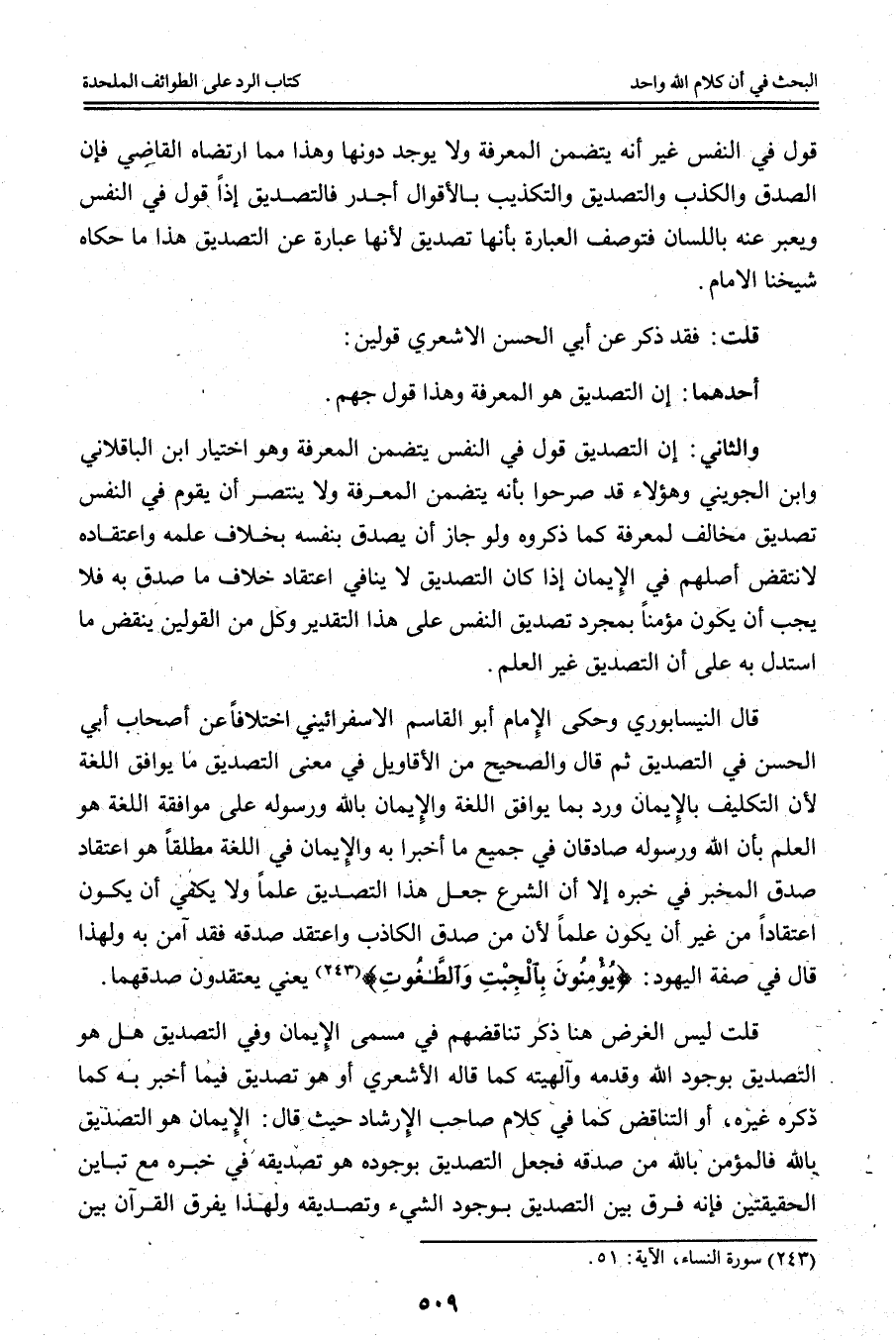 قَالَ النَّيْسَابُورِيُّ وَحَكَى الْإِمَامُ أَبُو الْقَاسِمِ الْإسْفَرايِينِيّ اخْتِلَافًا عَنْ أَصْحَابِ أَبِي الْحَسَنِ فِي التَّصْدِيقِ ثُمَّ قَالَ وَالصَّحِيحُ مِنْ الْأَقَاوِيلِ فِي مَعْنَى التَّصْدِيقِ مَا يُوَافِقُ اللُّغَةَ لِأَنَّ التَّكْلِيفَ بِالْإِيمَانِ وَرَدَ بِمَا يُوَافِقُ اللُّغَةَ وَالْإِيمَانُ بِاَللَّهِ وَرَسُولِهِ عَلَى مُوَافَقَةِ اللُّغَةِ هُوَ الْعِلْمُ بِأَنَّ اللَّهَ وَرَسُولَهُ صَادِقَانِ فِي جَمِيعِ مَا أَخْبَرَا بِهِ وَالْإِيمَانُ فِي اللُّغَةِ مُطْلَقًا هُوَ اعْتِقَادُ صِدْقِ الْمُخْبِرِ فِي خَبَرِهِ إلَّا أَنَّ الشَّرْعَ جَعَلَ هَذَا التَّصْدِيقَ عِلْمًا وَلَا يَكْفِي أَنْ يَكُونَ اعْتِقَادًا مِنْ غَيْرِ أَنْ يَكُونَ عِلْمًا لِأَنَّ مَنْ صَدَّقَ الْكَاذِبَ وَاعْتَقَدَ صِدْقَهُ فَقَدْ آمَنَ بِهِ وَلِهَذَا قَالَ فِي صِفَةِ الْيَهُودِ: {يُؤْمِنُونَ بِالْجِبْتِ وَالطَّاغُوتِ} [النساء: 51] يَعْنِي يَعْتَقِدُونَ صِدْقَهُمَا. قُلْت لَيْسَ الْغَرَضُ هُنَا ذِكْرُ تَنَاقُضِهِمْ فِي مُسَمَّى الْإِيمَانِ وَفِي التَّصْدِيقِ هَلْ هُوَ التَّصْدِيقُ بِوُجُودِ اللَّهِ وَقِدَمِهِ وَإِلَهِيَّته كَمَا قَالَهُ الْأَشْعَرِيُّ أَوْ هُوَ تَصْدِيقٌ فِيمَا أَخْبَرَ بِهِ كَمَا ذَكَرَهُ غَيْرُهُ، أَوْ التَّنَاقُضُ كَمَا فِي كَلَامِ صَاحِبِ الْإِرْشَادِ حَيْثُ قَالَ: الْإِيمَانُ هُوَ التَّصْدِيقُ بِاَللَّهِ فَالْمُؤْمِنُ بِاَللَّهِ مَنْ صَدَّقَهُ فَجَعَلَ التَّصْدِيقَ بِوُجُودِهِ هُوَ تَصْدِيقُهُ فِي خَبَرِهِ مَعَ تَبَايُنِ الْحَقِيقَتَيْنِ فَإِنَّهُ فَرَّقَ بَيْنَ التَّصْدِيقِ بِوُجُودِ الشَّيْءِ وَتَصْدِيقِهِ وَلِهَذَا يُفَرِّقُ الْقُرْآنُ بَيْنَ