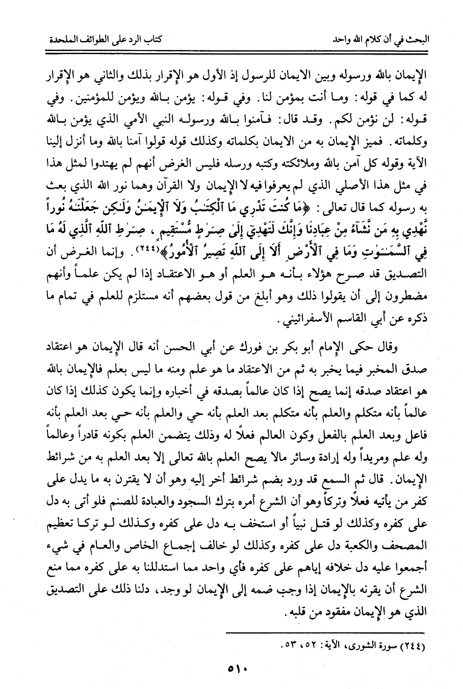 وَفِي قَوْلِهِ: {لَنْ نُؤْمِنَ لَكُمْ} [التوبة: 94] . وَقَدْ قَالَ: {فَآمِنُوا بِاللَّهِ وَرَسُولِهِ النَّبِيِّ الأُمِّيِّ الَّذِي يُؤْمِنُ بِاللَّهِ وَكَلِمَاتِهِ} [الأعراف: 158] . فَمَيَّزَ الْإِيمَانَ بِهِ مِنْ الْإِيمَانِ بِكَلِمَاتِهِ وَكَذَلِكَ قَوْلُهُ {قُولُوا آمَنَّا بِاللَّهِ وَمَا أُنْزِلَ إِلَيْنَا} [البقرة: 136] الْآيَةَ وَقَوْلُهُ {كُلٌّ آمَنَ بِاللَّهِ وَمَلائِكَتِهِ وَكُتُبِهِ وَرُسُلِهِ} [البقرة: 285] فَلَيْسَ الْغَرَضُ أَنَّهُمْ لَمْ يَهْتَدُوا لِمِثْلِ هَذَا فِي مِثْلِ هَذَا الْأَصْلِيِّ الَّذِي لَمْ يَعْرِفُوا فِيهِ لَا الْإِيمَانَ وَلَا الْقُرْآنَ وَهُمَا نُورُ اللَّهِ الَّذِي بَعَثَ بِهِ رَسُولَهُ كَمَا قَالَ تَعَالَى: {مَا كُنْتَ تَدْرِي مَا الْكِتَابُ وَلا الإِيمَانُ وَلَكِنْ جَعَلْنَاهُ نُورًا نَهْدِي بِهِ مَنْ نَشَاءُ مِنْ عِبَادِنَا وَإِنَّكَ لَتَهْدِي إِلَى صِرَاطٍ مُسْتَقِيمٍ} [الشورى: 52] {صِرَاطِ اللَّهِ الَّذِي لَهُ مَا فِي السَّمَاوَاتِ وَمَا فِي الأَرْضِ أَلا إِلَى اللَّهِ تَصِيرُ الأُمُورُ} [الشورى: 53] .