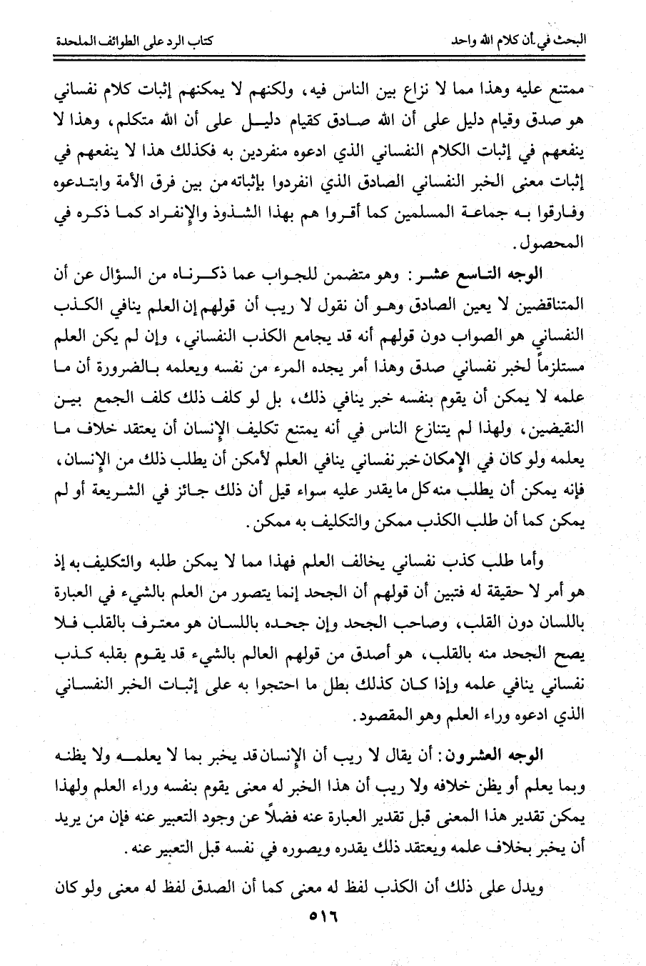 الْوَجْهُ التَّاسِعَ عَشَرَ: وَهُوَ مُتَضَمِّنٌ لِلْجَوَابِ عَمَّا ذَكَرْنَاهُ مِنْ السُّؤَالِ عَنْ أَنَّ الْمُتَنَاقِضَيْنِ لَا يُعَيِّنُ الصَّادِقَ وَهُوَ أَنْ نَقُولَ لَا رَيْبَ أَنَّ قَوْلَهُمْ إنَّ الْعِلْمَ يُنَافِي الْكَذِبَ النَّفْسَانِيَّ هُوَ الصَّوَابُ دُونَ قَوْلِهِمْ أَنَّهُ قَدْ يُجَامِعُ الْكَذِبَ النَّفْسَانِيَّ، وَإِنْ لَمْ يَكُنْ الْعِلْمُ مُسْتَلْزِمًا لِخَبَرٍ نَفْسَانِيٍّ صُدِّقَ وَهَذَا أَمْرٌ يَجِدُهُ الْمَرْءُ مِنْ نَفْسِهِ وَيَعْلَمُهُ بِالضَّرُورَةِ أَنَّ مَا عَلِمَهُ لَا يُمْكِنُ أَنْ يَقُومَ بِنَفْسِهِ خَبَرٌ يُنَافِي ذَلِكَ، بَلْ لَوْ كُلِّفَ ذَلِكَ كُلِّفَ الْجَمْعُ بَيْنَ النَّقِيضَيْنِ، وَلِهَذَا لَمْ يَتَنَازَعْ النَّاسُ فِي أَنَّهُ يَمْتَنِعُ تَكْلِيفُ الْإِنْسَانِ أَنْ يَعْتَقِدَ خِلَافَ مَا يَعْلَمُهُ وَلَوْ كَانَ فِي الْإِمْكَانِ خَبَرٌ نَفْسَانِيٌّ يُنَافِي الْعِلْمَ لَأَمْكَنَ أَنْ يُطْلَبَ ذَلِكَ مِنْ الْإِنْسَانِ، فَإِنَّهُ يُمْكِنُ أَنْ يُطْلَبَ مِنْهُ كُلُّ مَا يَقْدِرُ عَلَيْهِ سَوَاءٌ قِيلَ إنَّ ذَلِكَ جَائِزٌ فِي الشَّرِيعَةِ أَوْ لَمْ يُمْكِنْ كَمَا أَنَّ طَلَبَ الْكَذِبِ مُمْكِنٌ وَالتَّكْلِيفَ بِهِ مُمْكِنٌ.