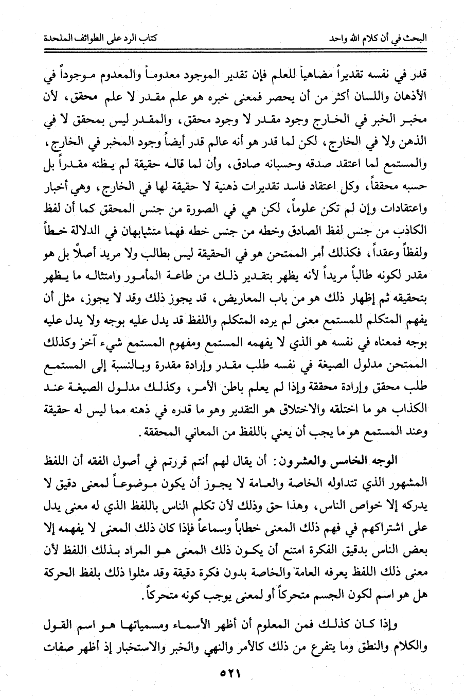 الْوَجْهُ الْخَامِسُ وَالْعِشْرُونَ: أَنْ يُقَالَ لَهُمْ أَنْتُمْ قَرَّرْتُمْ فِي أُصُولِ الْفِقْهِ أَنَّ اللَّفْظَ الْمَشْهُورَ الَّذِي تَتَدَاوَلُهُ الْخَاصَّةُ وَالْعَامَّةُ لَا يَجُوزُ أَنْ يَكُونَ مَوْضُوعًا لِمَعْنًى دَقِيقٍ لَا يُدْرِكُهُ إلَّا خَوَاصُّ النَّاسِ، وَهَذَا حَقٌّ وَذَلِكَ لِأَنَّ تَكَلُّمَ النَّاسِ بِاللَّفْظِ الَّذِي لَهُ مَعْنًى يَدُلُّ عَلَى اشْتِرَاكِهِمْ فِي فَهْمِ ذَلِكَ الْمَعْنَى خِطَابًا وَسَمَاعًا فَإِذَا كَانَ ذَلِكَ الْمَعْنَى لَا يَفْهَمُهُ إلَّا بَعْضُ النَّاسِ بِدَقِيقِ الْفِكْرَةِ امْتَنَعَ أَنْ يَكُونَ ذَلِكَ الْمَعْنَى هُوَ الْمُرَادُ بِذَلِكَ اللَّفْظِ لِأَنَّ مَعْنَى ذَلِكَ اللَّفْظِ يَعْرِفُهُ الْعَامَّةُ وَالْخَاصَّةُ بِدُونِ فِكْرَةٍ دَقِيقَةٍ وَقَدْ مَثَّلُوا ذَلِكَ بِلَفْظِ الْحَرَكَةِ هَلْ هُوَ اسْمٌ لِكَوْنِ الْجِسْمِ مُتَحَرِّكًا أَوْ لِمَعْنًى يُوجِبُ كَوْنَهُ مُتَحَرِّكًا.