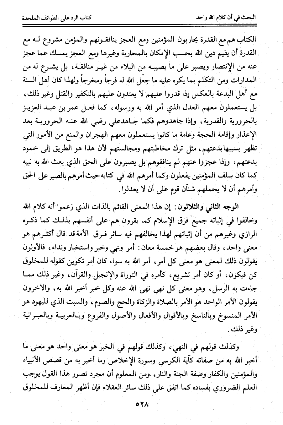 ِ وَخَالَفُوا فِي إثْبَاتِهِ جَمِيعَ فِرَقِ الْإِسْلَامِ كَمَا يُقِرُّونَ هُمْ عَلَى أَنْفُسِهِمْ بِذَلِكَ كَمَا ذَكَرَهُ الرَّازِيّ وَغَيْرُهُمْ مِنْ أَنَّ إثْبَاتَهُمْ لِهَذَا يُخَالِفُهُمْ فِيهِ سَائِرُ فِرَقِ الْأُمَّةِ قَدْ قَالَ أَكْثَرُهُمْ هُوَ مَعْنًى وَاحِدٌ، وَقَالَ بَعْضُهُمْ هُوَ خَمْسَةُ مَعَانٍ: أَمْرٌ وَنَهْيٌ وَخَبَرٌ وَاسْتِخْبَارٌ وَنِدَاءٌ، فَالْأَوَّلُونَ يَقُولُونَ ذَلِكَ لِمَعْنًى هُوَ مَعْنَى كُلِّ أَمْرٍ، أَمَرَ اللَّهُ بِهِ سَوَاءٌ كَانَ أَمْرَ تَكْوِينٍ كَقَوْلِهِ لِلْمَخْلُوقِ كُنْ فَيَكُونُ، أَوْ كَانَ أَمْرَ تَشْرِيعٍ، كَأَمْرِهِ فِي التَّوْرَاةِ وَالْإِنْجِيلِ وَالْقُرْآنِ، وَغَيْرِ ذَلِكَ مِمَّا جَاءَتْ بِهِ الرُّسُلُ، وَهُوَ مَعْنَى كُلِّ نَهْيٍ نَهَى اللَّهُ عَنْهُ وَكُلِّ خَبَرٍ أَخْبَرَ اللَّهُ بِهِ، وَالْآخَرُونَ يَقُولُونَ الْأَمْرُ الْوَاحِدُ هُوَ الْأَمْرُ بِالصَّلَاةِ وَالزَّكَاةِ وَالْحَجِّ وَالصَّوْمِ، وَالسَّبْتُ الَّذِي لِلْيَهُودِ هُوَ الْأَمْرُ الْمَنْسُوخُ وَبِالنَّاسِخِ وَبِالْأَقْوَالِ وَالْأَفْعَالِ وَالْأُصُولِ وَالْفُرُوعِ وَبِالْعَرَبِيَّةِ وَبِالعَبْرَانِيّةِ ة وَغَيْرِ ذَلِكَ.