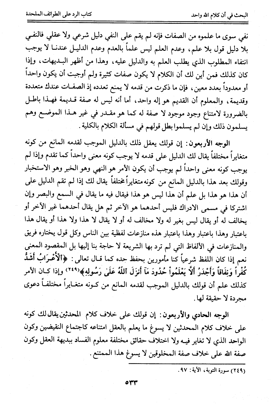 نَفْيٍ سِوَى مَا عَلِمُوهُ مِنْ الصِّفَاتِ فَإِنَّهُ لَمْ يَقُمْ عَلَى النَّفْيِ دَلِيلٌ شَرْعِيٌّ وَلَا عَقْلِيٌّ فَالنَّفْيُ بِلَا دَلِيلٍ قَوْلٌ بِلَا عِلْمٍ، وَعَدَمُ الْعِلْمِ لَيْسَ عِلْمًا بِالْعَدَمِ وَعَدَمُ الدَّلِيلِ عِنْدَنَا لَا يُوجِبُ انْتِفَاءَ الْمَطْلُوبِ الَّذِي يُطْلَبُ الْعِلْمُ بِهِ وَالدَّلِيلُ عَلَيْهِ، وَهَذَا مِنْ أَظْهَرِ الْبَدِيهَاتِ، وَإِذَا كَانَ كَذَلِكَ فَمِنْ أَيْنَ لَك أَنَّ الْكَلَامَ لَا يَكُونُ صِفَاتٍ كَثِيرَةً وَلِمَ أَوْجَبْت أَنْ يَكُونَ وَاحِدًا أَوْ مَعْدُودًا بِعَدَدٍ مُعَيَّنٍ، فَإِنَّ مَا ذَكَرْت مِنْ قِدَمِهِ لَا يَمْنَعُ تَعَدُّدَهُ إذْ الصِّفَاتُ عِنْدَك مُتَعَدِّدَةٌ وَقَدِيمَةٌ، وَالْمَعْلُومُ أَنَّ الْقَدِيمَ هُوَ إلَهٌ وَاحِدٌ، أَمَّا أَنَّهُ لَيْسَ لَهُ صِفَةٌ قَدِيمَةٌ فَهَذَا بَاطِلٌ بِالضَّرُورَةِ لِامْتِنَاعِ وُجُودِ مَوْجُودٍ لَا صِفَةَ لَهُ كَمَا هُوَ مُقَدَّرٌ فِي غَيْرِ هَذَا الْمَوْضِعِ وَهُمْ يُسَلِّمُونَ ذَلِكَ وَإِنْ لَمْ يُسَلِّمُوا بَطَلَ قَوْلُهُمْ فِي مَسْأَلَةِ الْكَلَامِ بِالْكُلِّيَّةِ.