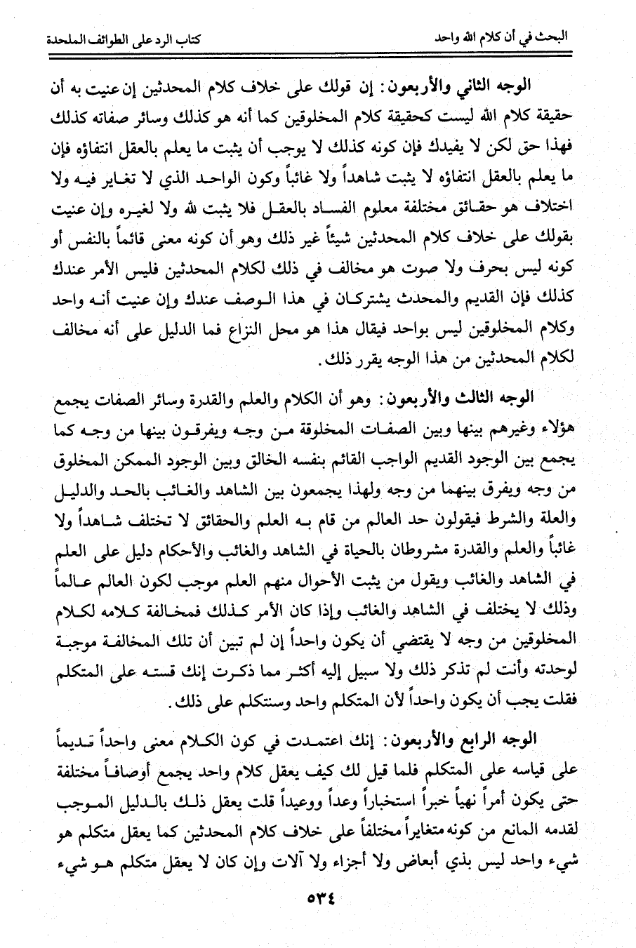 [الْوَجْهُ الثَّالِثُ وَالْأَرْبَعُونَ الْكَلَامَ وَالْعِلْمَ وَالْقُدْرَةَ وَسَائِرَ الصِّفَاتِ الْجَمْعُ بَيْنَهَا وَبَيْنَ الصِّفَاتِ الْمَخْلُوقَةِ]