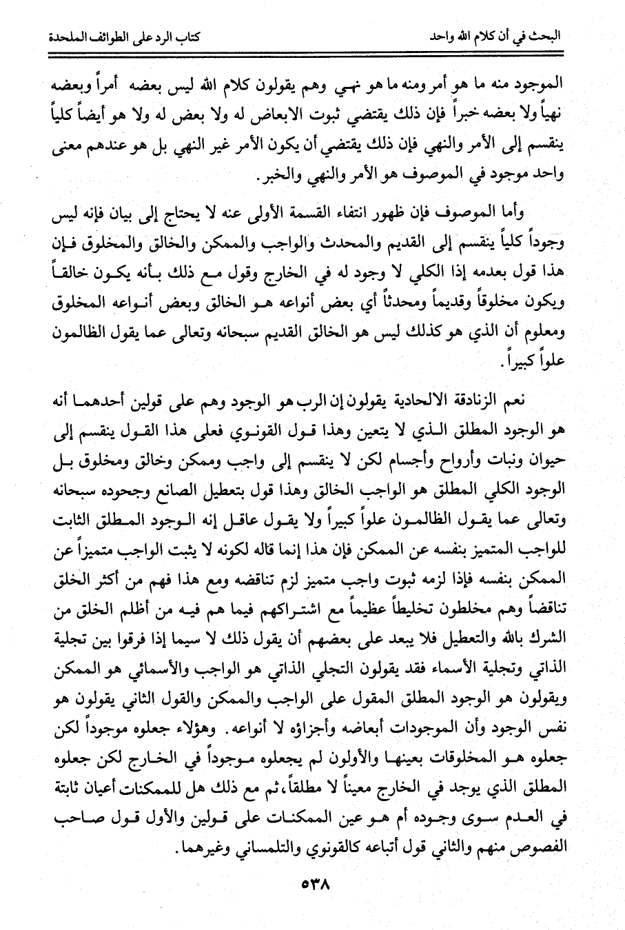 وَأَمَّا الْمَوْصُوفُ فَإِنَّ ظُهُورَ انْتِفَاءِ الْقِسْمَةِ الْأُولَى عَنْهُ لَا يَحْتَاجُ إلَى بَيَانٍ فَإِنَّهُ لَيْسَ وُجُودًا كُلِّيًّا يَنْقَسِمُ إلَى الْقَدِيمِ وَالْمُحْدَثِ وَالْوَاجِبِ وَالْمُمْكِنِ وَالْخَالِقِ وَالْمَخْلُوقِ فَإِنَّ هَذَا قَوْلٌ بِعَدَمِهِ إذْ الْكُلِّيُّ لَا وُجُودَ لَهُ فِي الْخَارِجِ وَقَوْلٌ مَعَ ذَلِكَ بِأَنَّهُ يَكُونُ خَالِقًا وَيَكُونُ مَخْلُوقًا وَقَدِيمًا وَمُحْدَثًا أَيْ بَعْضُ أَنْوَاعِهِ هُوَ الْخَالِقُ وَبَعْضُ أَنْوَاعِهِ الْمَخْلُوقُ وَمَعْلُومٌ أَنَّ الَّذِي هُوَ كَذَلِكَ لَيْسَ هُوَ الْخَالِقَ الْقَدِيمَ سُبْحَانَهُ وَتَعَالَى عَمَّا يَقُولُ الظَّالِمُونَ عُلُوًّا كَبِيرًا.