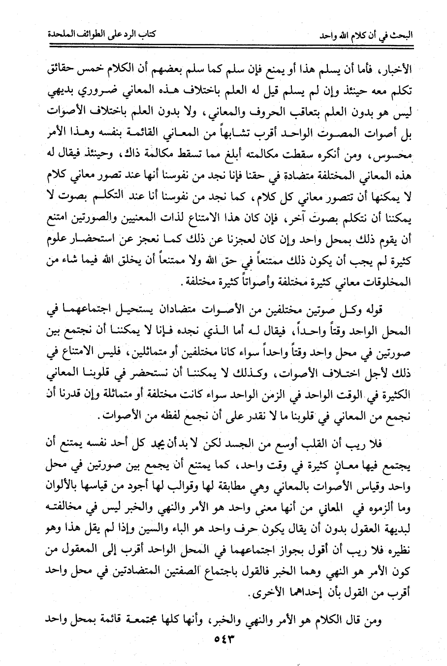 الْإِخْبَارِ، فَإِمَّا أَنْ يُسَلِّمَ هَذَا أَوْ يَمْنَعَ فَإِنْ سَلَّمَ كَمَا سَلَّمَ بَعْضُهُمْ أَنَّ الْكَلَامَ خَمْسُ حَقَائِقَ تُكُلِّمَ مَعَهُ حِينَئِذٍ وَإِنْ لَمْ يُسَلِّمْ قِيلَ لَهُ الْعِلْمُ بِاخْتِلَافِ هَذِهِ الْمَعَانِي ضَرُورِيٌّ بَدِيهِيٌّ لَيْسَ هُوَ بِدُونِ الْعِلْمِ بِتَعَاقُبِ الْحُرُوفِ وَالْمَعَانِي، وَلَا بِدُونِ الْعِلْمِ بِاخْتِلَافِ الْأَصْوَاتِ بَلْ أَصْوَاتُ الْمُصَوِّتِ الْوَاحِدِ أَقْرَبُ تَشَابُهًا مِنْ الْمَعَانِي الْقَائِمَةِ بِنَفْسِهِ وَهَذَا الْأَمْرُ مَحْسُوسٌ، وَمَنْ أَنْكَرَهُ سَقَطَتْ مُكَالَمَتُهُ أَبْلَغُ مِمَّا تَسْقُطُ مُكَالَمَةُ ذَاكَ، وَحِينَئِذٍ فَيُقَالُ لَهُ هَذِهِ الْمَعَانِي الْمُخْتَلِفَةُ مُتَضَادَّةٌ فِي حَقِّنَا فَإِنَّا نَجِدُ مِنْ نُفُوسِنَا أَنَّهَا عِنْدَ تَصَوُّرِ مَعَانِي كَلَامٍ لَا يُمْكِنُهَا أَنْ تُتَصَوَّرَ مَعَانِي كُلِّ كَلَامٍ، كَمَا نَجِدُ مِنْ نُفُوسِنَا أَنَّا عِنْدَ التَّكَلُّمِ بِصَوْتٍ لَا يُمْكِنُنَا أَنْ نَتَكَلَّمَ بِصَوْتٍ آخَرَ، فَإِنْ كَانَ هَذَا الِامْتِنَاعُ لِذَاتِ الْمَعْنَيَيْنِ وَالصُّورَتَيْنِ امْتَنَعَ أَنْ يَقُومَ ذَلِكَ بِمَحِلٍّ وَاحِدٍ وَإِنْ كَانَ لِعَجْزِنَا عَنْ ذَلِكَ كَمَا نَعْجِزُ عَنْ اسْتِحْضَارِ عُلُومٍ كَثِيرَةٍ لَمْ يَجِبْ أَنْ يَكُون ذَلِكَ مُمْتَنِعًا فِي حَقِّ اللَّهِ وَلَا مُمْتَنِعًا أَنْ يَخْلُقَ اللَّهُ فِيمَا شَاءَ مِنْ الْمَخْلُوقَاتِ مَعَانِيَ كَثِيرَةً مُخْتَلِفَةً وَأَصْوَاتًا كَثِيرَةً مُخْتَلِفَةً.