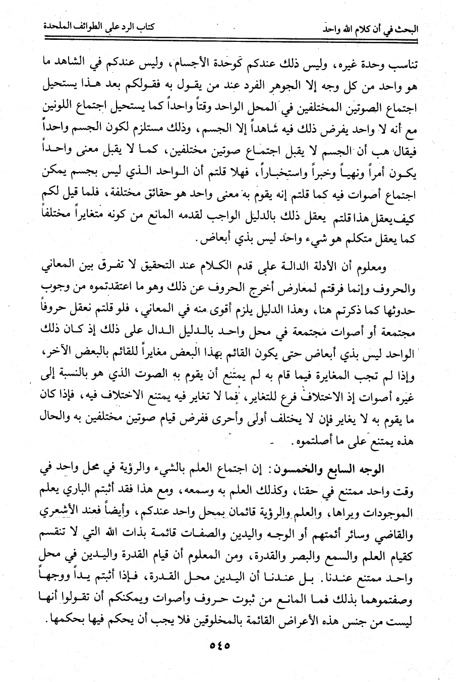الْوَجْهُ السَّابِعُ وَالْخَمْسُونَ: إنَّ اجْتِمَاعَ الْعِلْمِ بِالشَّيْءِ وَالرُّؤْيَةِ فِي مَحِلٍّ وَاحِدٍ فِي وَقْتٍ وَاحِدٍ مُمْتَنِعٌ فِي حَقِّنَا، وَكَذَلِكَ الْعِلْمُ بِهِ وَسَمْعُهُ، وَمَعَ هَذَا فَقَدْ أَثْبَتُّمْ الْبَارِيَ يَعْلَمُ الْمَوْجُودَاتِ وَيَرَاهَا، وَالْعِلْمُ وَالرُّؤْيَةُ قَائِمَانِ بِمَحِلٍّ وَاحِدٍ عِنْدَكُمْ، وَأَيْضًا فَعِنْدَ الْأَشْعَرِيِّ وَالْقَاضِي وَسَائِرِ أَئِمَّتِهِمْ أَوْ الْوَجْهِ وَالْيَدَيْنِ وَالصِّفَاتُ قَائِمَةٌ بِذَاتِ اللَّهِ الَّتِي لَا تَنْقَسِمُ كَقِيَامِ الْعِلْمِ وَالسَّمْعِ وَالْبَصَرِ وَالْقُدْرَةِ، وَمِنْ الْمَعْلُومِ أَنَّ قِيَامَ الْقُدْرَةِ وَالْيَدَيْنِ فِي مَحِلٍّ وَاحِدٍ مُمْتَنِعٌ عِنْدَنَا. بَلْ عِنْدَنَا أَنَّ الْيَدَيْنِ مَحِلُّ الْقُدْرَةِ، فَإِذَا أَثْبَتُّمْ يَدًا وَوَجْهًا وَصَفْتُمُوهُمَا بِذَلِكَ فَمَا الْمَانِعُ مِنْ ثُبُوتِ حُرُوفٍ وَأَصْوَاتٍ وَيُمْكِنُكُمْ أَنْ تَقُولُوا أَنَّهَا لَيْسَتْ مِنْ جِنْسِ هَذِهِ الْأَعْرَاضِ الْقَائِمَةِ بِالْمَخْلُوقِينَ فَلَا يَجِبُ أَنْ يُحْكَمَ فِيهَا بِحُكْمِهَا.