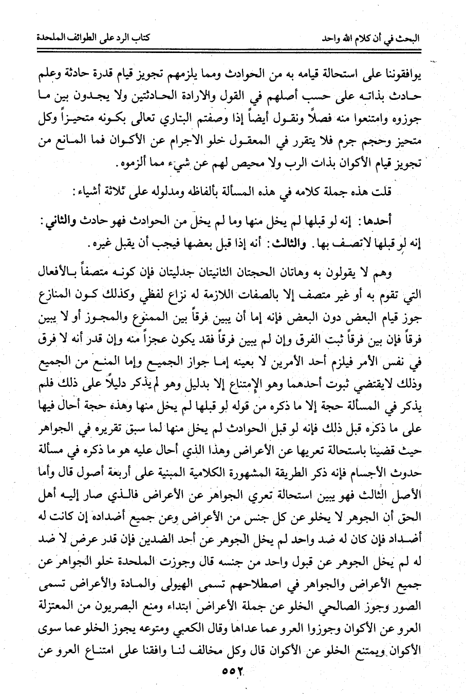 قُلْت هَذِهِ جُمْلَةُ كَلَامِهِ فِي هَذِهِ الْمَسْأَلَةِ بِأَلْفَاظِهِ وَمَدْلُولِهِ عَلَى ثَلَاثَةِ أَشْيَاءَ: أَحَدُهَا: إنَّهُ لَوْ قَبِلَهَا لَمْ يَخْلُ مِنْهَا وَمَا لَمْ يَخْلُ مِنْ الْحَوَادِثِ فَهُوَ حَادِثٌ وَالثَّانِي: إنَّهُ لَوْ قَبِلَهَا لَاتَّصَفَ بِهَا. وَالثَّالِثُ: أَنَّهُ إذَا قَبِلَ بَعْضَهَا فَيَجِبُ أَنْ يَقْبَلَ غَيْرَهُ.