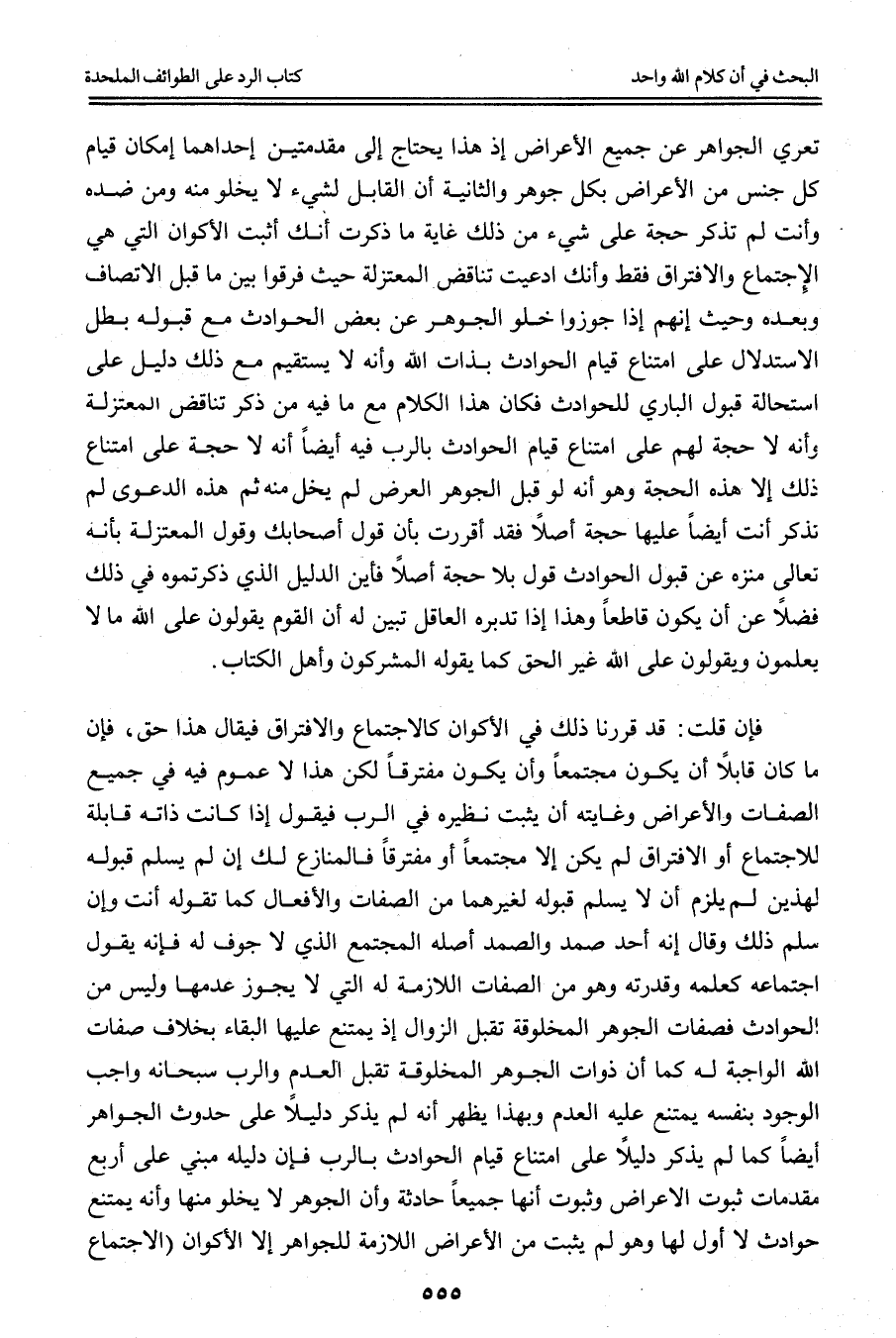 تَعَرِّي الْجَوَاهِرِ عَنْ جَمِيعِ الْأَعْرَاضِ إذْ هَذَا يَحْتَاجُ إلَى مُقَدِّمَتَيْنِ إحْدَاهُمَا إمْكَانُ قِيَامِ كُلِّ جِنْسٍ مِنْ الْأَعْرَاضِ بِكُلِّ جَوْهَرٍ، الثَّانِيَةُ أَنَّ الْقَابِلَ لِشَيْءٍ لَا يَخْلُو مِنْهُ وَمِنْ ضِدِّهِ وَأَنْتَ لَمْ تَذْكُرْ حُجَّةً عَلَى شَيْءٍ مِنْ ذَلِكَ غَايَةُ مَا ذَكَرْت أَنَّك أَثْبَتّ الْأَكْوَانَ الَّتِي هِيَ الِاجْتِمَاعُ وَالِافْتِرَاقُ فَقَطْ وَأَنَّك ادَّعَيْت تَنَاقُضَ الْمُعْتَزِلَةَ حَيْثُ فَرَّقُوا بَيْنَ مَا قَبْلَ الِاتِّصَافِ وَبَعْدَهُ وَحَيْثُ إنَّهُمْ إذَا جَوَّزُوا خُلُوَّ الْجَوْهَرِ عَنْ بَعْضِ الْحَوَادِثِ مَعَ قَبُولِهِ بَطَلَ الِاسْتِدْلَال عَلَى امْتِنَاعِ قِيَامِ الْحَوَادِثِ بِذَاتِ اللَّهِ وَأَنَّهُ لَا يَسْتَقِيمُ مَعَ ذَلِكَ دَلِيلٌ عَلَى اسْتِحَالَةِ قَبُولِ الْبَارِي لِلْحَوَادِثِ فَكَانَ هَذَا الْكَلَامُ مَعَ مَا فِيهِ مِنْ ذِكْرِ تَنَاقُضِ الْمُعْتَزِلَةَ وَأَنَّهُ لَا حُجَّةَ لَهُمْ عَلَى امْتِنَاعِ قِيَامِ الْحَوَادِثِ بِالرَّبِّ فِيهِ أَيْضًا أَنَّهُ لَا حُجَّةَ عَلَى امْتِنَاعِ ذَلِكَ إلَّا هَذِهِ الْحُجَّةَ وَهُوَ أَنَّهُ لَوْ قَبِلَ الْجَوْهَرُ الْعَرَضَ لَمْ يَخْلُ مِنْهُ ثُمَّ هَذِهِ الدَّعْوَى لَمْ تَذْكُرْ أَنْتَ أَيْضًا عَلَيْهَا حُجَّةً أَصْلًا فَقَدْ أَقْرَرْت بِأَنَّ قَوْلَ أَصْحَابِك وَقَوْلَ الْمُعْتَزِلَةِ بِأَنَّهُ تَعَالَى مُنَزَّهٌ عَنْ قَبُولِ الْحَوَادِثِ قَوْلٌ بِلَا حُجَّةٍ أَصْلًا فَأَيْنَ الدَّلِيلُ الَّذِي ذَكَرْتُمُوهُ فِي ذَلِكَ فَضْلًا عَنْ أَنْ يَكُونَ قَاطِعًا وَهَذَا إذَا تَدَبَّرَهُ الْعَاقِلُ تَبَيَّنَ لَهُ أَنَّ الْقَوْمَ يَقُولُونَ عَلَى اللَّهِ مَا لَا يَعْلَمُونَ وَيَقُولُونَ عَلَى اللَّهِ غَيْرَ الْحَقِّ يَقُولُهُ الْمُشْرِكُونَ وَأَهْلُ الْكِتَابِ.