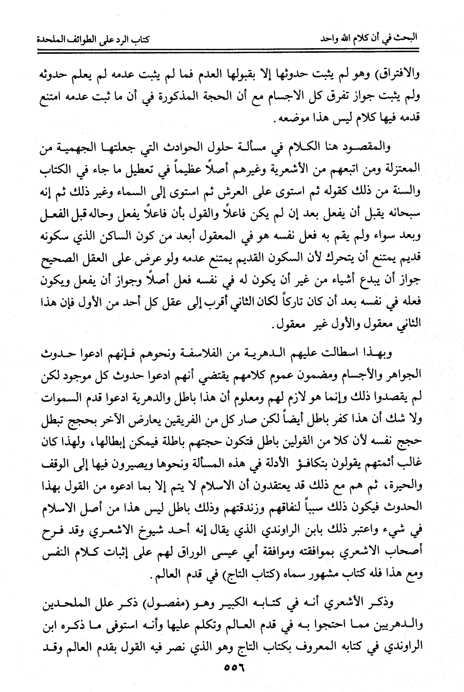 وَبِهَذَا اسْتَطَالَتْ عَلَيْهِمْ الدَّهْرِيَّةُ مِنْ الْفَلَاسِفَةِ وَنَحْوِهِمْ فَإِنَّهُمْ ادَّعَوْا حُدُوثَ الْجَوَاهِرِ وَالْأَجْسَامِ وَمَضْمُونُ عُمُومِ كَلَامِهِمْ يَقْتَضِي أَنَّهُمْ ادَّعَوْا حُدُوثَ كُلِّ مَوْجُودٍ لَكِنْ لَمْ يَقْصِدُوا ذَلِكَ وَإِنَّمَا هُوَ لَازِمٌ لَهُمْ وَمَعْلُومٌ أَنَّ هَذَا بَاطِلٌ وَالدَّهْرِيَّةُ ادَّعَوْا قِدَمَ السَّمَوَاتِ وَلَا شَكَّ أَنَّ هَذَا كُفْرٌ بَاطِلٌ أَيْضًا لَكِنْ صَارَ كُلٌّ مِنْ الْفَرِيقَيْنِ يُعَارِضُ الْآخَرَ بِحُجَجٍ تُبْطِلُ حُجَجَ نَفْسِهِ لِأَنَّ كُلًّا مِنْ الْقَوْلَيْنِ بَاطِلٌ فَتَكُونُ حُجَّتُهُمْ بَاطِلَةً فَيُمْكِنُ إبْطَالُهَا، وَلِهَذَا كَانَ غَالِبُ أَئِمَّتِهِمْ يَقُولُونَ بِتَكَافُؤِ الْأَدِلَّةِ فِي هَذِهِ الْمَسْأَلَةِ وَنَحْوِهَا وَيَصِيرُونَ فِيهَا إلَى الْوَقْفِ وَالْحَيْرَةِ، ثُمَّ هُمْ مَعَ ذَلِكَ قَدْ يَعْتَقِدُونَ أَنَّ الْإِسْلَامَ لَا يَتِمُّ إلَّا بِمَا ادَّعَوْهُ مِنْ الْقَوْلِ بِهَذَا الْحُدُوثِ فَيَكُونُ ذَلِكَ سَبَبًا لِنِفَاقِهِمْ وَزَنْدَقَتِهِمْ وَذَلِكَ بَاطِلٌ لَيْسَ هَذَا مِنْ أَصْلِ الْإِسْلَامِ فِي شَيْءٍ وَاعْتُبِرَ ذَلِكَ بِابْنِ الرَّاوَنْدِيِّ الَّذِي يُقَالُ إنَّهُ أَحَدُ شُيُوخِ الْأَشْعَرِيِّ وَقَدْ فَرِحَ أَصْحَابُ الْأَشْعَرِيِّ بِمُوَافَقَتِهِ وَمُوَافَقَةِ أَبِي عِيسَى الْوَرَّاقِ لَهُمْ عَلَى إثْبَاتِ كَلَامِ النَّفْسِ وَمَعَ هَذَا فَلَهُ كِتَابٌ مَشْهُورٌ سَمَّاهُ (كِتَابُ التَّاجِ) فِي قِدَمِ الْعَالَمِ.