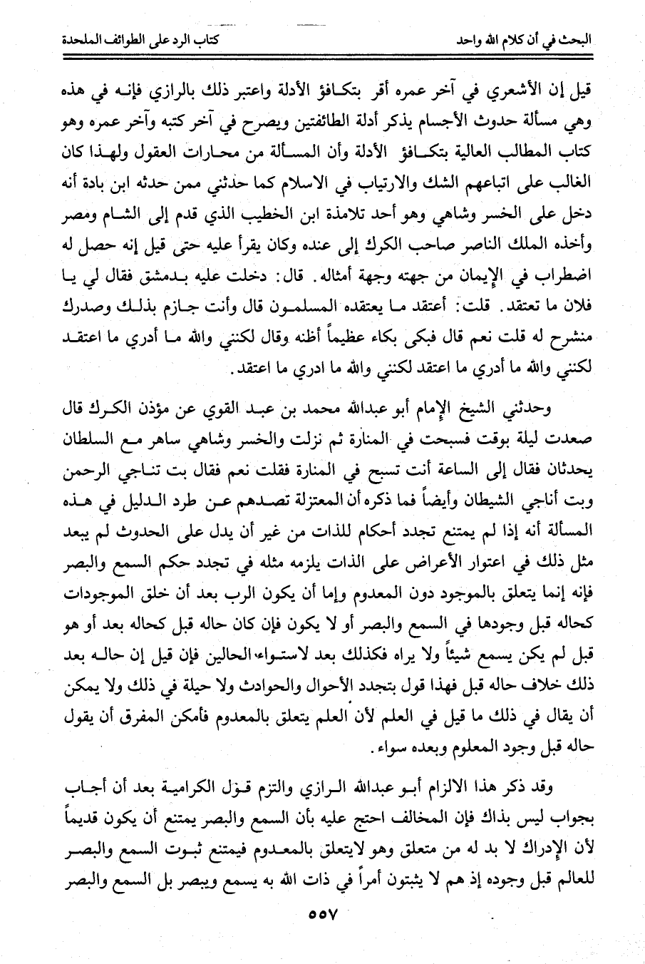 وَقَدْ ذَكَرَ هَذَا الْإِلْزَامَ أَبُو عَبْدِ اللَّهِ الرَّازِيّ وَالْتَزَمَ قَوْلَ الْكَرَّامِيَّةِ بَعْدَ أَنْ أَجَابَ بِجَوَابٍ لَيْسَ بِذَاكَ فَإِنَّ الْمُخَالِفَ احْتَجَّ عَلَيْهِ بِأَنَّ السَّمْعَ وَالْبَصَرَ يَمْتَنِعُ أَنْ يَكُونَ قَدِيمًا لِأَنَّ الْإِدْرَاكَ لَا بُدَّ لَهُ مِنْ مُتَعَلِّقٍ وَهُوَ لَا يَتَعَلَّقُ بِالْمَعْدُومِ فَيَمْتَنِعُ ثُبُوتُ السَّمْعِ وَالْبَصَرِ لِلْعَالَمِ قَبْلَ وُجُودِهِ إذْ هُمْ لَا يُثْبِتُونَ أَمْرًا فِي ذَاتِ اللَّهِ بِهِ يَسْمَعُ وَيُبْصِرُ بَلْ السَّمْعُ وَالْبَصَرُ