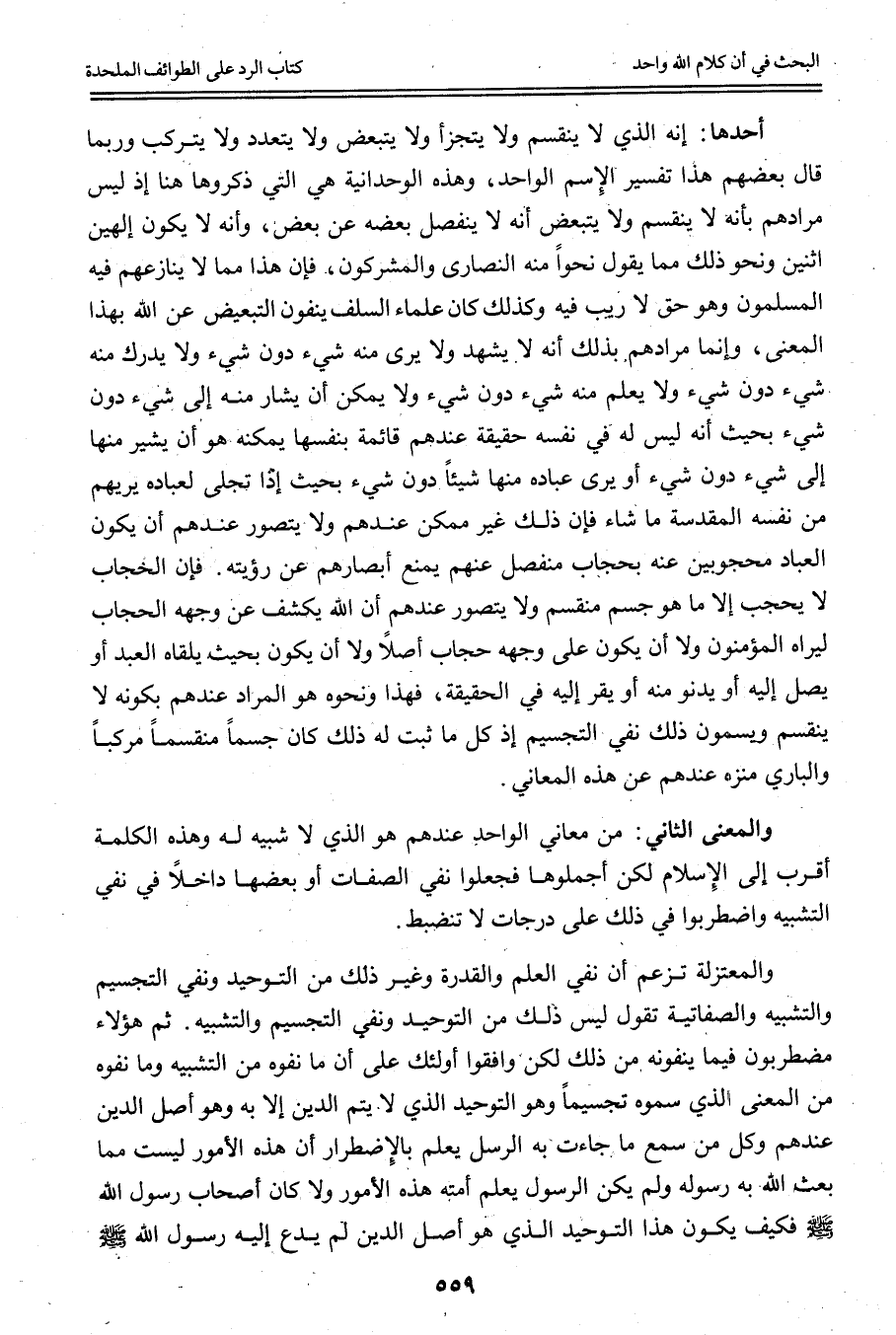 وَالْمَعْنَى الثَّانِي: مِنْ مَعَانِي الْوَاحِدِ عِنْدَهُمْ هُوَ الَّذِي لَا شَبِيهَ لَهُ وَهَذِهِ الْكَلِمَةُ أَقْرَبُ إلَى الْإِسْلَامِ لَكِنْ أَجْمَلُوهَا فَجَعَلُوا نَفْيَ الصِّفَاتِ أَوْ بَعْضِهَا دَاخِلًا فِي نَفْيِ التَّشْبِيهِ وَاضْطَرَبُوا فِي ذَلِكَ عَلَى دَرَجَاتٍ لَا تَنْضَبِطُ.